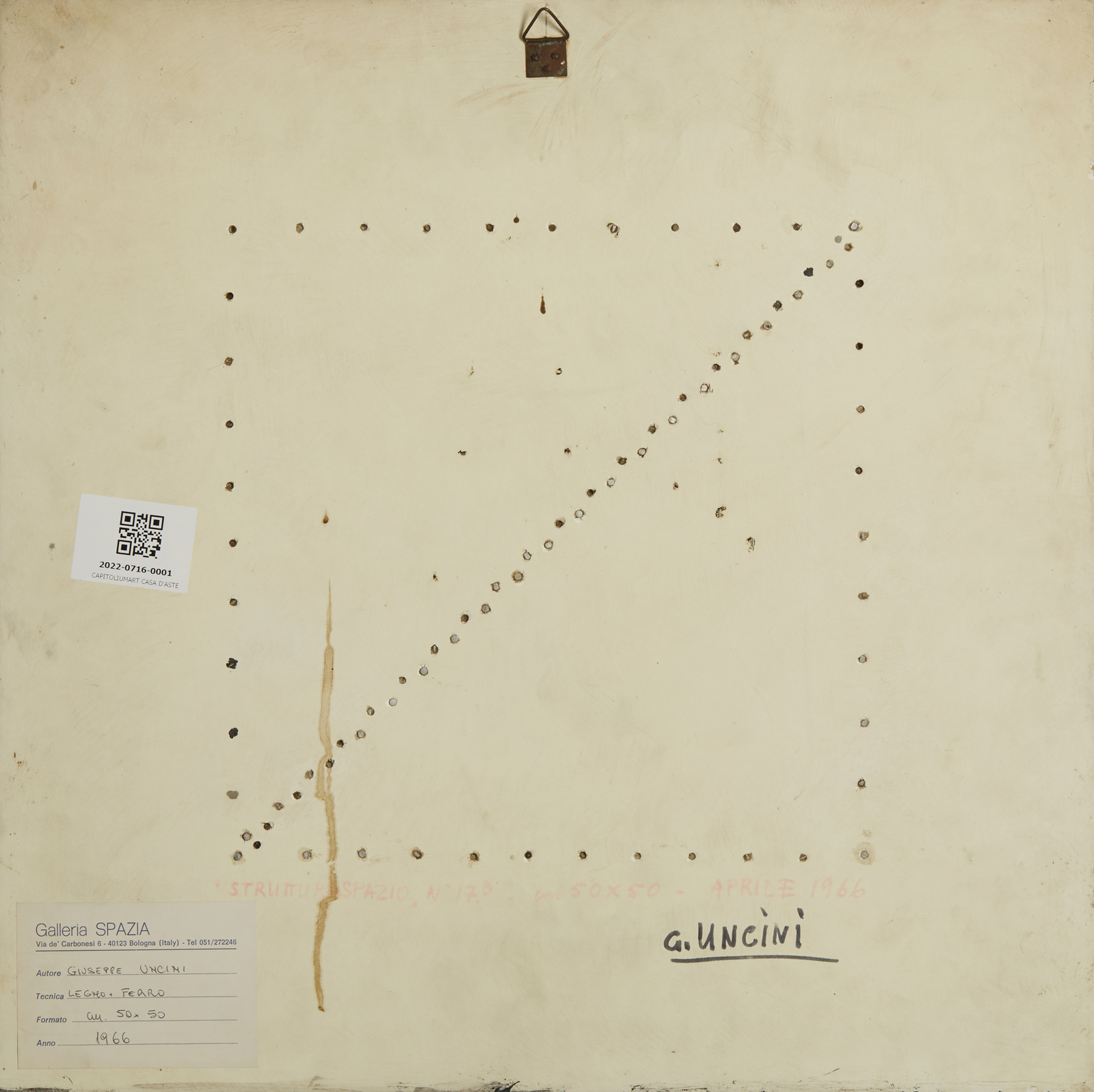 UNCINI GIUSEPPE (1929 - 2008) Struttura spazio n.17b. 1966. Tecnica mista su tavola. Cm 50,00 x 50,00. Al retro titolo, firma, anno e cartiglio descrittivo Galleria Spazia, Bologna. Si ringrazia la Galleria Spazia, Bologna, per aver confermato la provenienza dell'opera. Provenienza: Galleria Spazia, Bologna; Collezione privata, Bologna. Opera in fase di archiviazione presso l'Archivio Giuseppe Uncini.