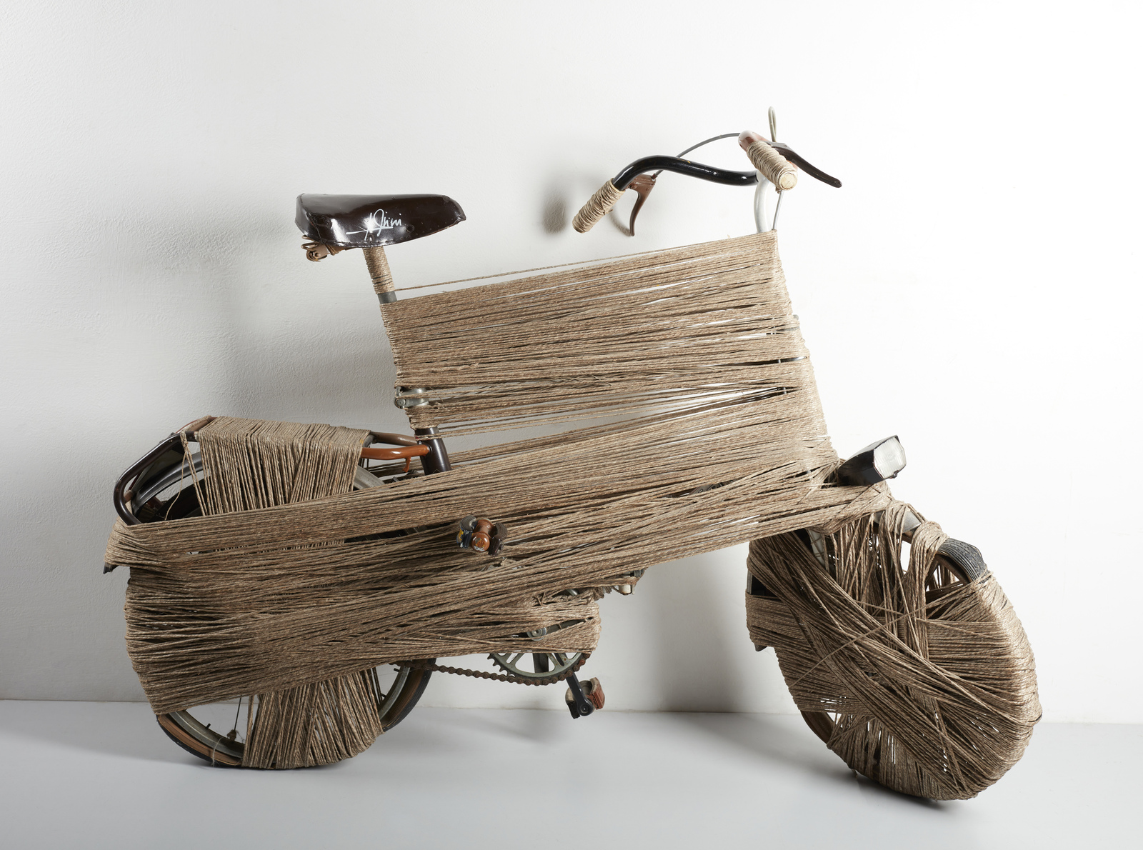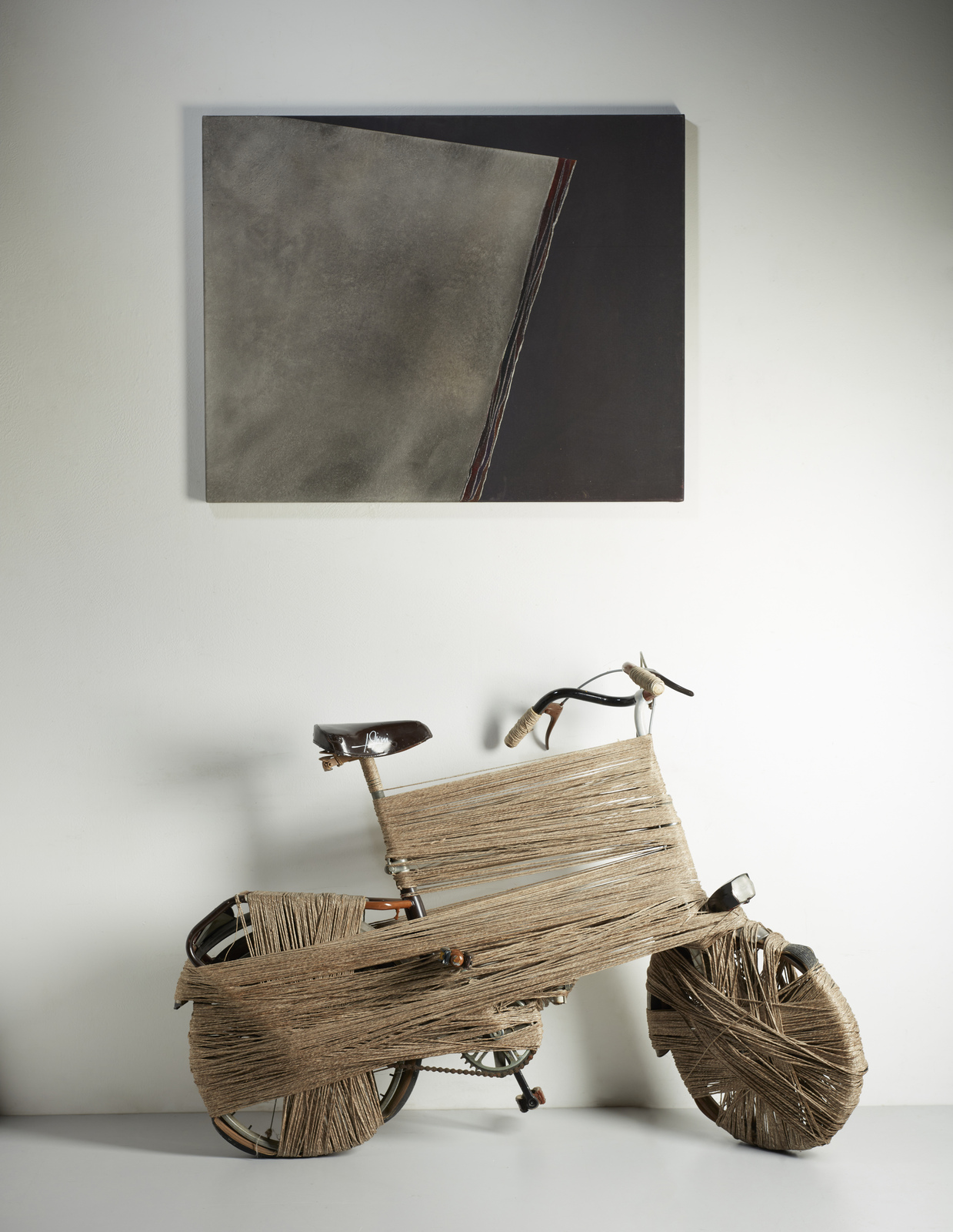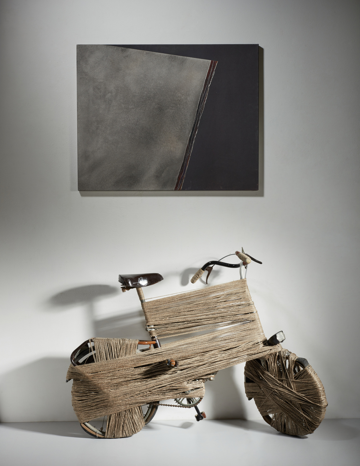 OLIVIERI GIORGIO (n. 1937) La pittura e il suo doppio. 1995. Installazione. . Il lotto è composto da due elementi: Olio su tela, 80x100 cm. Al retro firma; Bicicletta legata con corda, 100x130 cm. Firma sul sellino. Certificato di provenienza rilasciato da Casa d'Aste Semenzato, Venezia. Pubblicazione: Mascelloni Enrico, Il fascino dell'oggetto, Dopotutto Centro Culturale, Prato, Marzo-Maggio 1996, tav. 29. Lievi difetti.