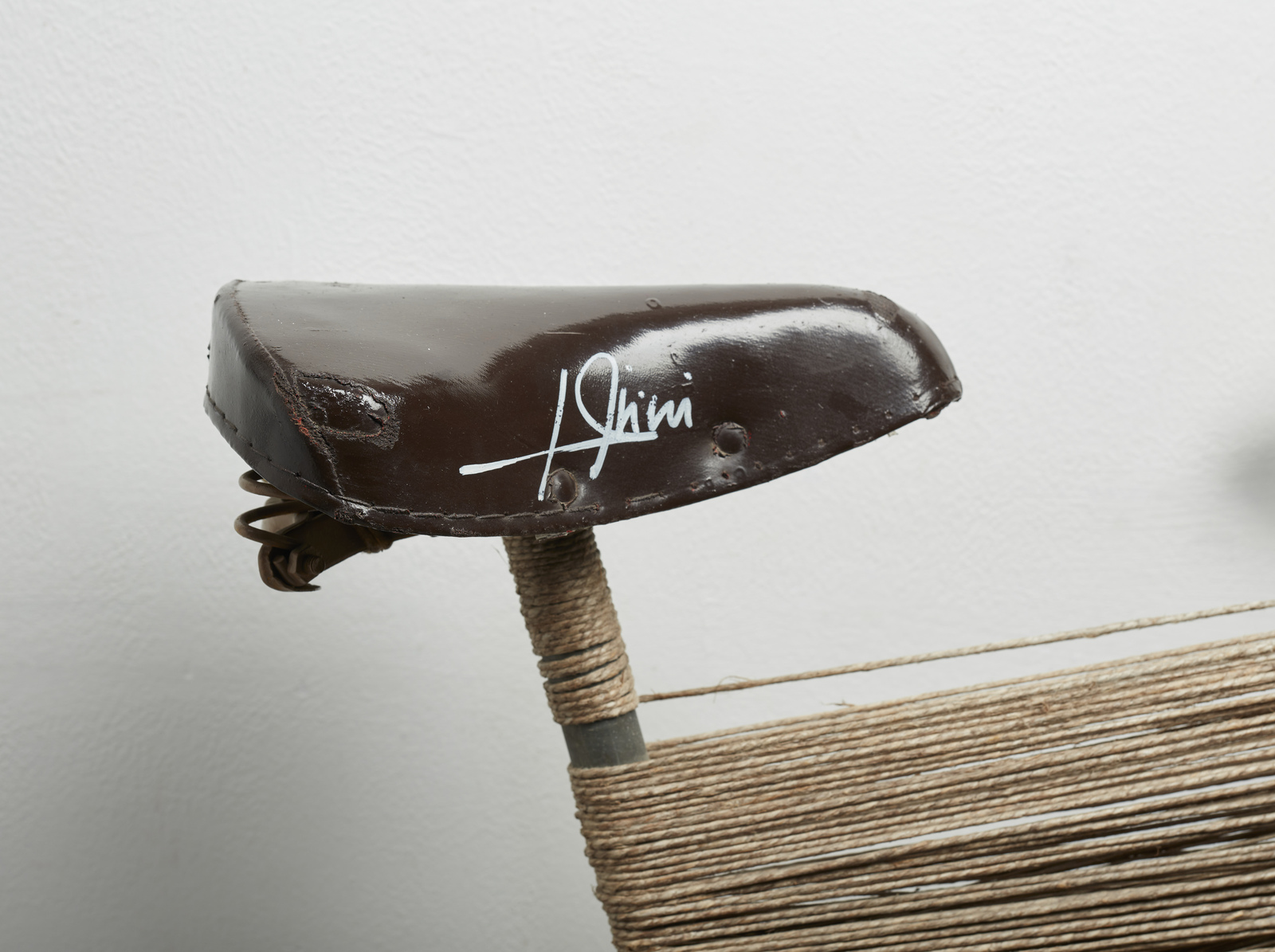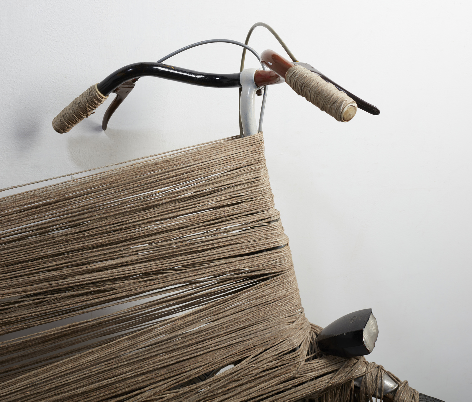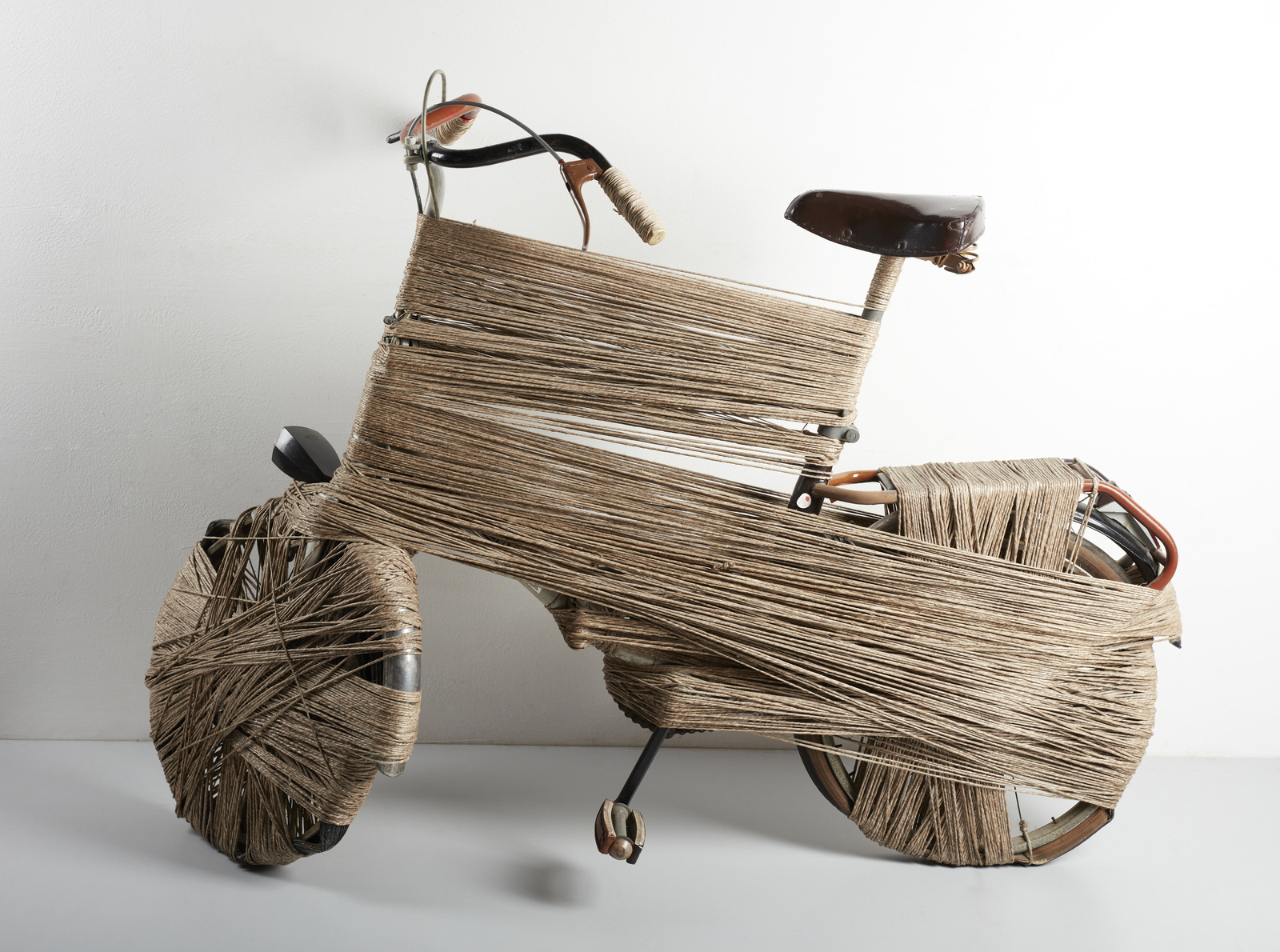 OLIVIERI GIORGIO (n. 1937) La pittura e il suo doppio. 1995. Installazione. . Il lotto è composto da due elementi: Olio su tela, 80x100 cm. Al retro firma; Bicicletta legata con corda, 100x130 cm. Firma sul sellino. Certificato di provenienza rilasciato da Casa d'Aste Semenzato, Venezia. Pubblicazione: Mascelloni Enrico, Il fascino dell'oggetto, Dopotutto Centro Culturale, Prato, Marzo-Maggio 1996, tav. 29. Lievi difetti.