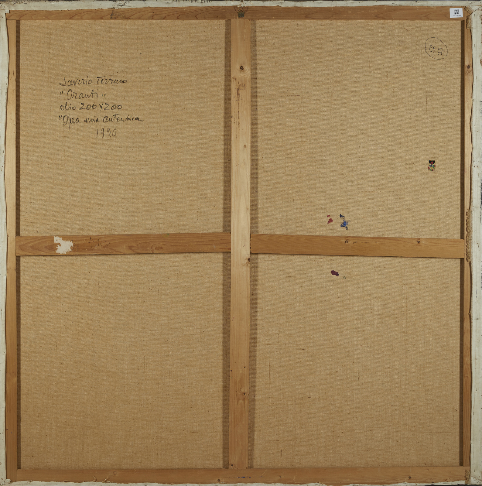 TERRUSO SALVATORE (1915 - 1997) Oranti. 1990. Olio su tela . Cm 200,00 x 200,00. Firma in basso a destra. Al retro titolo, firma, anno e cartiglio Arte Fiera Bologna, 1994. Opera archiviata presso l'Archivio Generale dell'opera di Saverio Terruso, Milano, come da documentazione fotografica allegata all'opera riportante il relativo numero d'inventario. Esposizioni: Arte Fiera 1994, Bologna. Pubblicazioni: Catalogo generale delle opere di Saverio Terruso, Primo Volume, p. 53, n. 98. Lievi difetti.