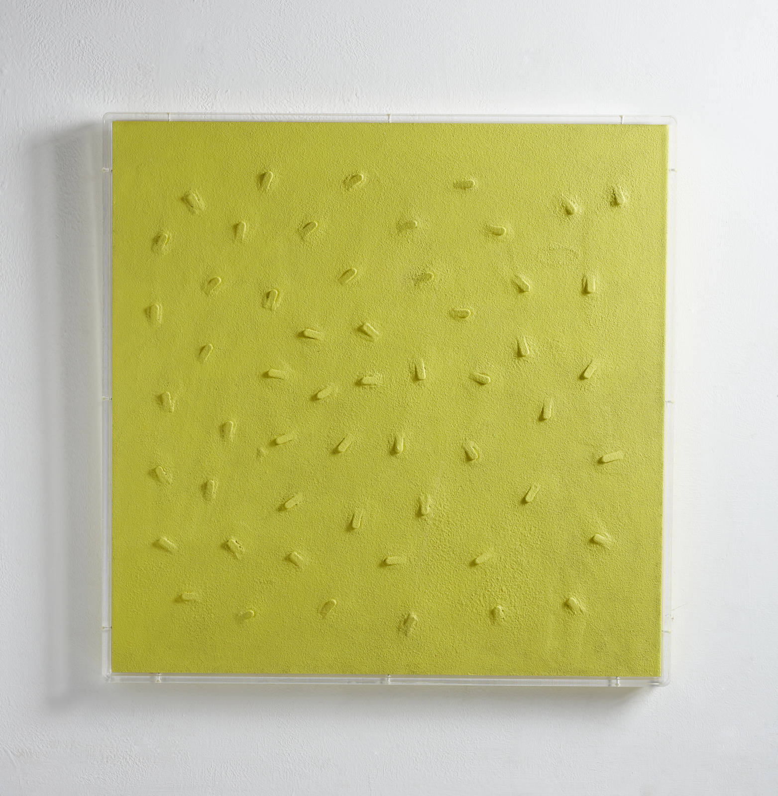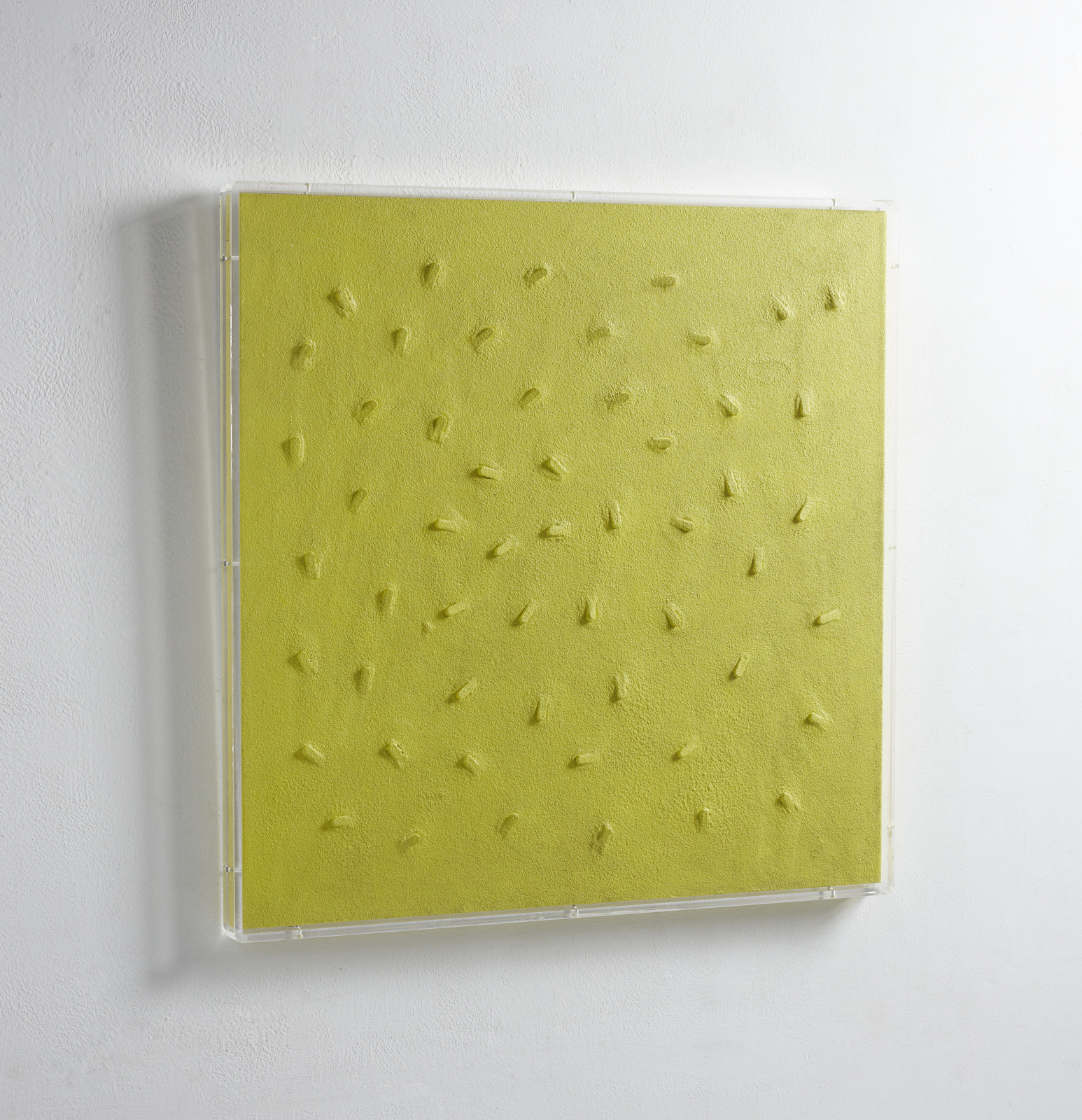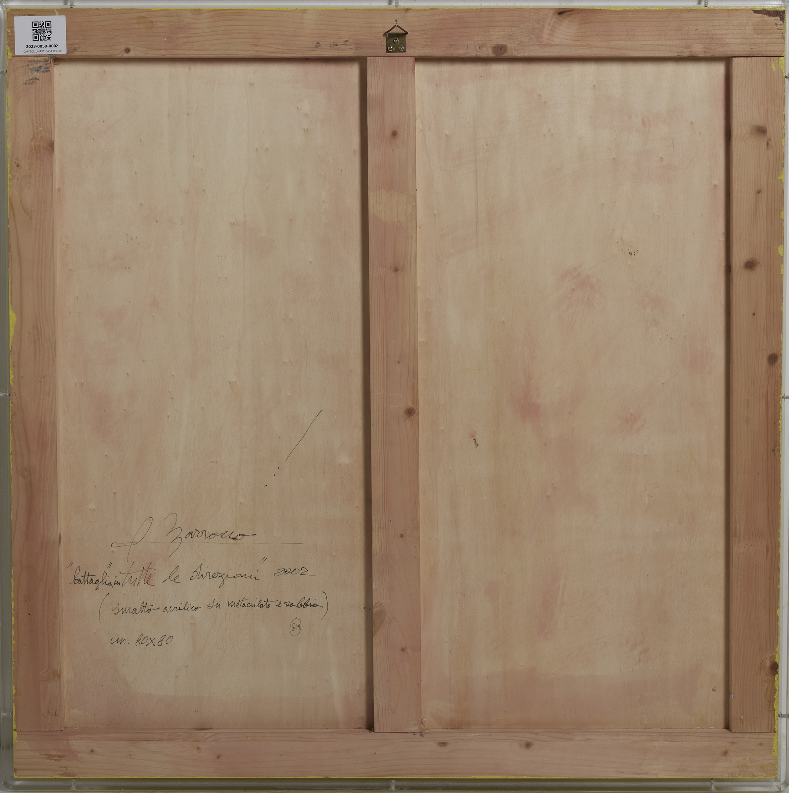 MARROCCO ARMANDO (n. 1939) Battaglia in tutte le direzioni. 2002. Tecnica mista su tavola. Cm 80,00 x 80,00. Al retro titolo e firma. Autentica dell'artista su fotografia riportante il relativo numero d'inventario. Entro teca in plexiglass. Cornice presente