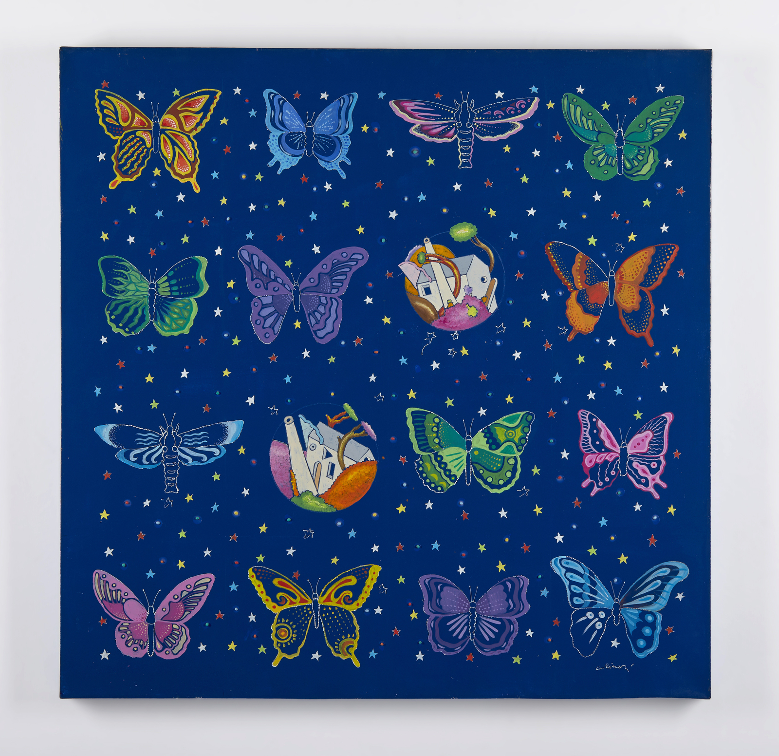 ALINARI LUCA (n. 1943) Farfalle impossibili. 1982. Acrilici su tela . Cm 80,00 x 80,00. Firma in basso a destra. Al retro titolo e firma. Autentica dell'artista su fotografia.
