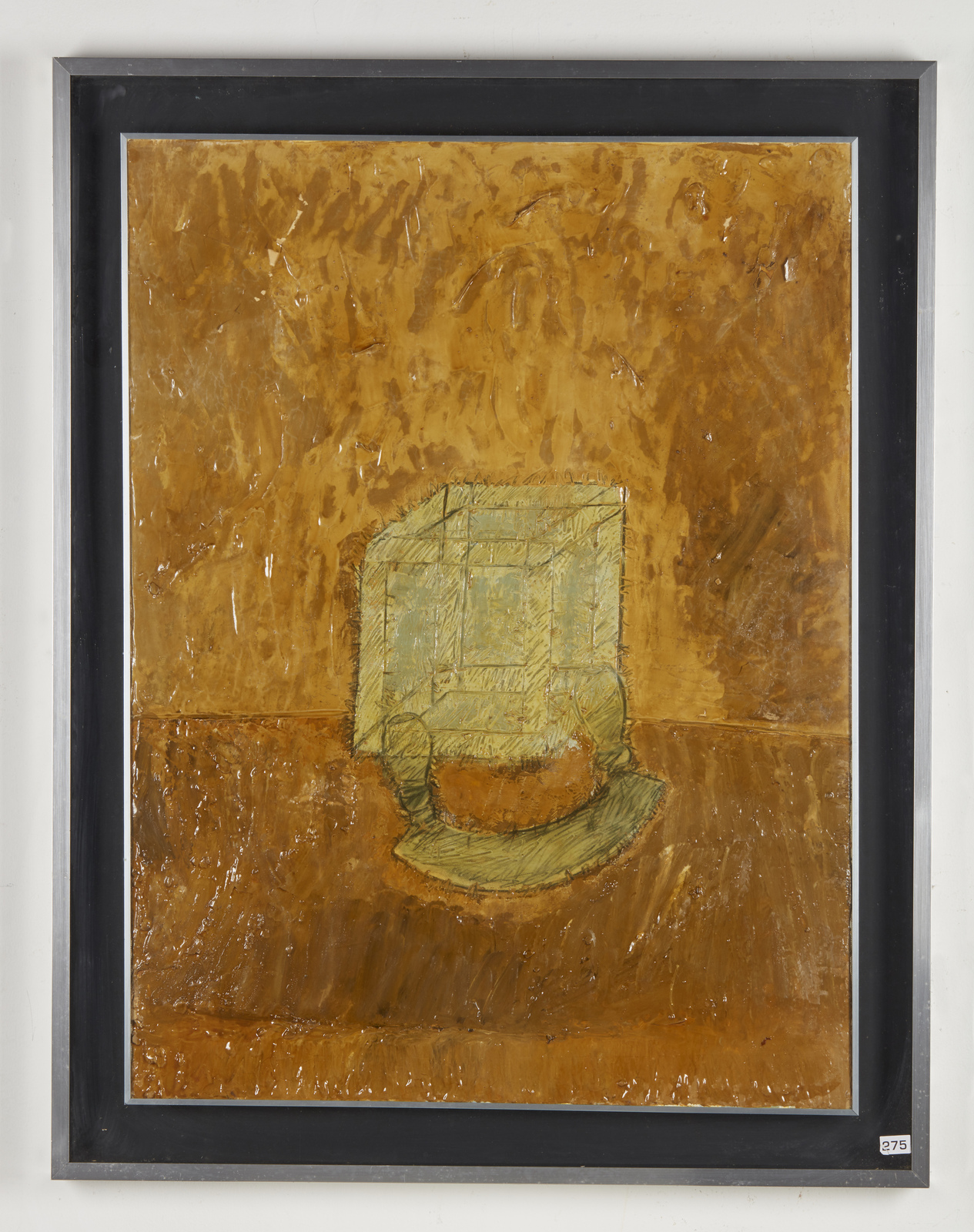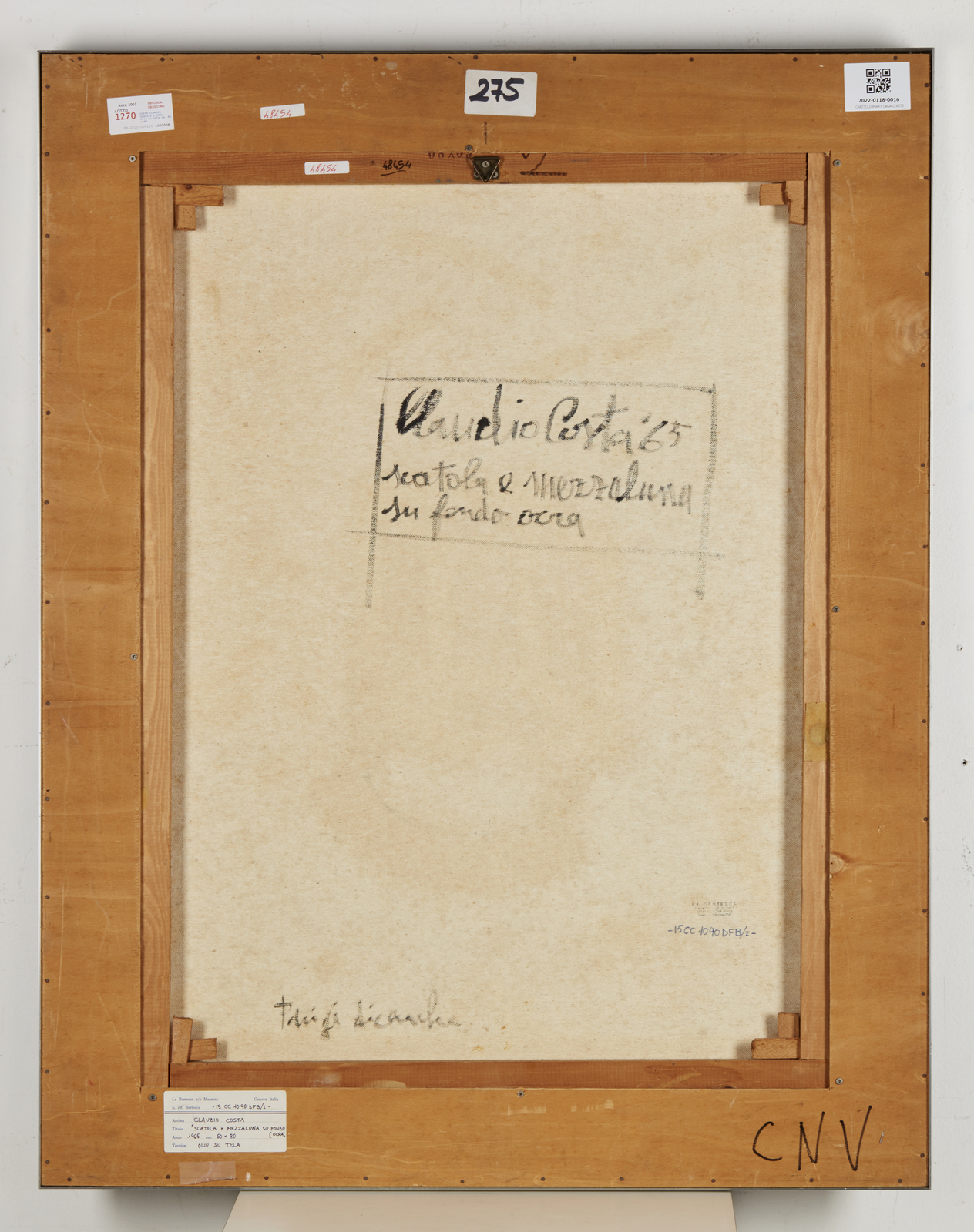COSTA CLAUDIO (1942 - 1995) Scatola e mezzaluna su fondo ocra. 1965. Tecnica mista su tela. Cm 60,00 x 80,00. Al titolo, firma, anno, timbro e cartiglio descrittivo La Bertesca, Genova. Provenienza: Collezione Franchini, Genova; La Bertesca, Genova; Collezione privata, Genova. Opera archiviata presso l'Archivio Claudio Costa, Rapallo, come da documentazione fotografica allegata all'opera riportante il relativo numero d'inventario. Cornice presente