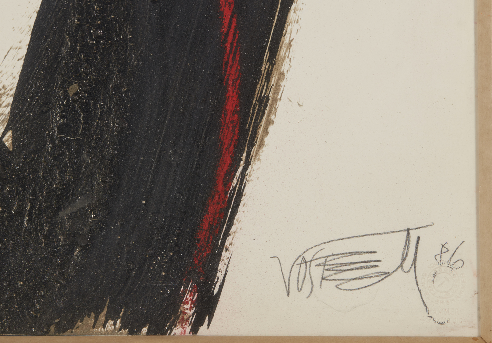 VOSTELL WOLF (1932 - 1998) Maja. 1986. Tecnica mista e collage su cartone. Cm 105,00 x 77,00. Firma e anno in basso a destra. Certificato di garanzia e autenticità Casa d'aste Meeting Art, Vercelli. Certificato di autenticità Casa d'aste Sant'agostino, Torino. Cornice presente