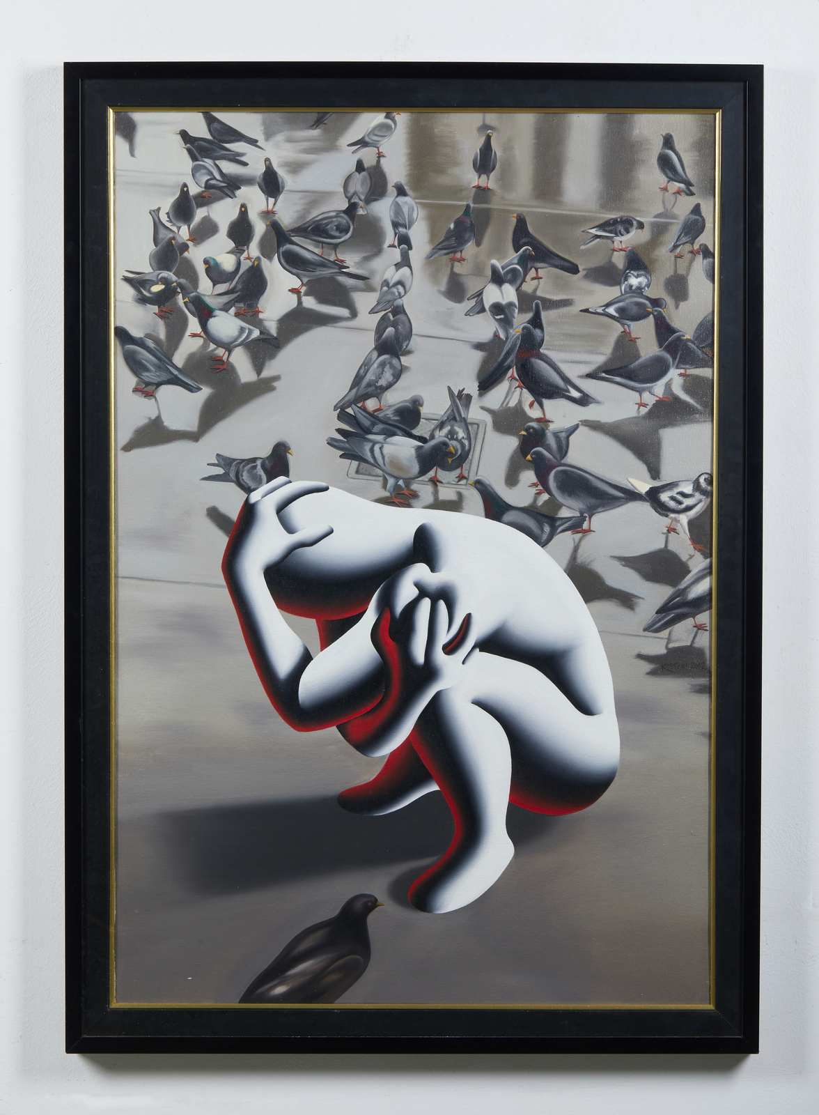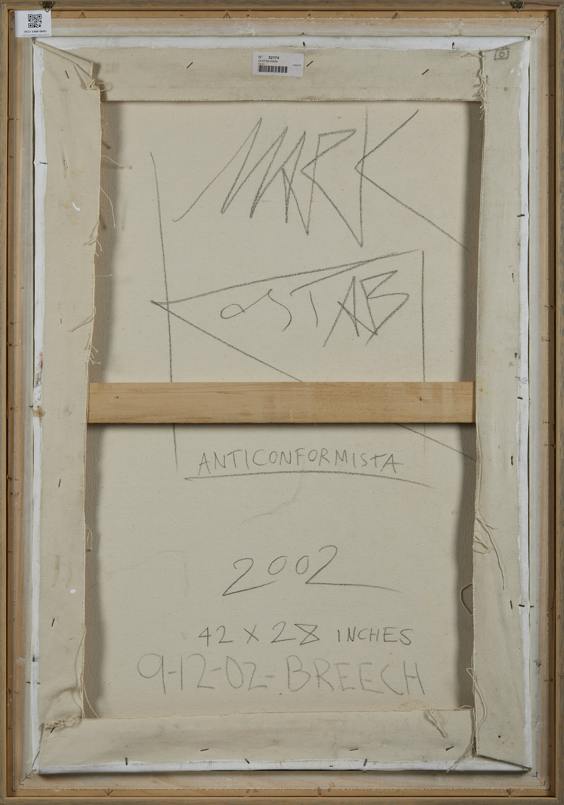 KOSTABI MARK (n. 1960) Anticonformista. 2002. Olio su tela . Cm 72,00 x 106,00. Firma e anno a destra. Al retro titolo, firma e anno. Autentica dell'artista su fotografia con cartiglio Galleria Spagnoli Casa d'Aste, Firenze. Cornice presente