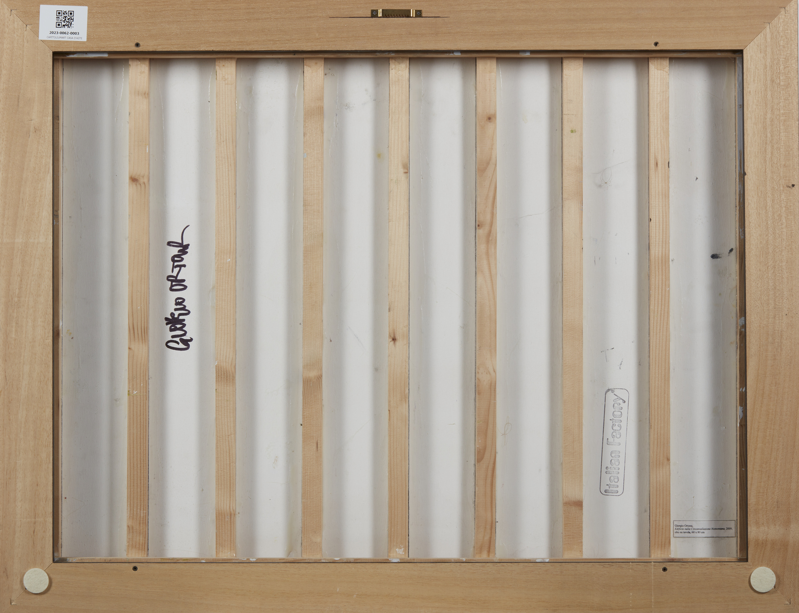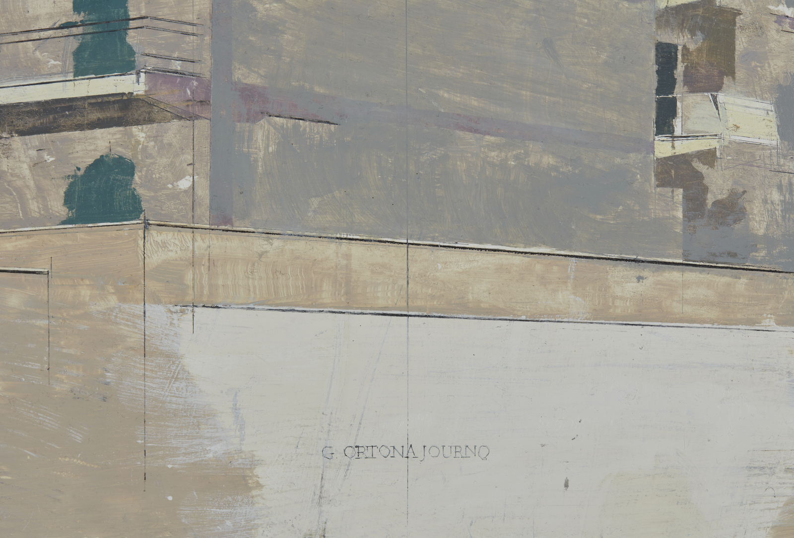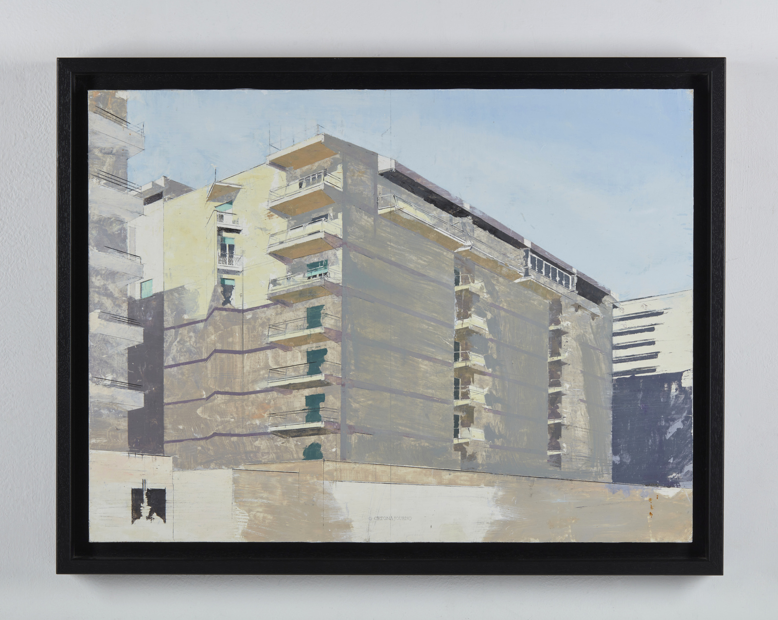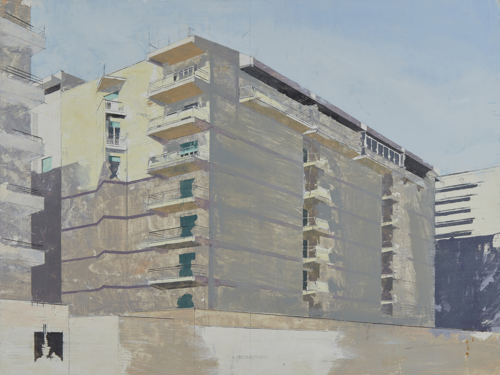 ORTONA GIORGIO (n. 1960) Edificio sulla circonvallazione nomentana. 2009. Olio su tavola. Cm 80,00 x 60,00. Firma in basso al centro. Firma al retro. Autentica dell'artista su fotografia (copia). Provenienza: D.L. Arte, Milano; Collezione privata, Novara. Lievi difetti. Cornice presente