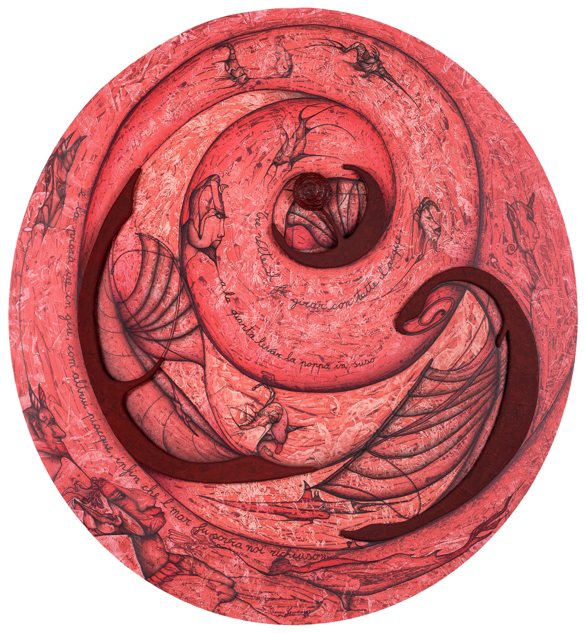 Rosario Genovese (Catania 1953) - Inf. XXVI La nave di Ulisse inghiottita dal vortice 110 x 120 cm Supporto ligneo, acrilico e matite su stampa ink-jet su tela, carta gesso dipinta su legno Rosario Genovese è un artista nato a Catania nel 1953 che ha frequentato l'Istituto d'Arte e l'Accademia di Belle Arti della stessa città, dove in seguito è stato docente di Decorazione. Nel corso della sua carriera artistica, ha affrontato varie tematiche e stili pittorici, partendo dal realismo pittorico e fotografico degli anni '70 per poi approdare al concetto di mimesi cosmologica negli anni '90. La sua produzione artistica comprende opere su supporti tridimensionali e bidimensionali, che rappresentano astri, pianeti, galassie e costellazioni, esplorando le stelle doppie, le binarie a contatto, le pulsar e i buchi neri binari.