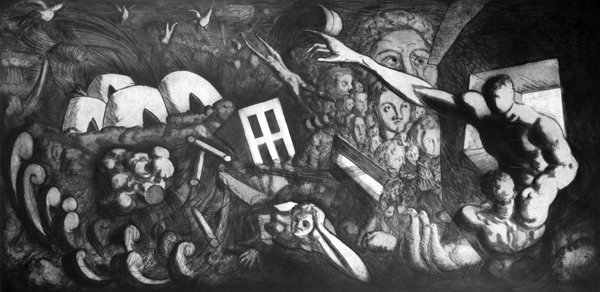 Roberto Barni (Pistoia, 1939) NOTTE, 1982 Acquaforte, acquatinta e puntasecca, cm. 88,5x177,5; foglio cm. 100x190; es.13/25 Firma e dedica in basso a destra, tiratura a sinistra . Tiratura: 25 + 3 p.a. Stampatore: Carini, S. Giovanni Valdarno Editore: Carini, Firenze Pubblicazioni: Catalogo della Grafica Carini, 1988, Riferimento: n. 37