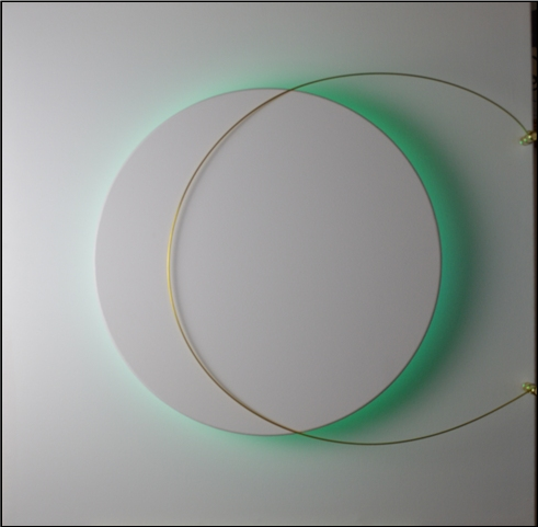 BANI BRUNO Milano 1964 "Eclissi parziale bianca" Due tele sovrapposte, con sistema a led telecomandato e filo rigido in metallo, cm 80x80 del 2018. Sul retro numero d'archivio, titolo, data e firma. Autentica su foto e fotografia dell'artista mentre firma l'opera.