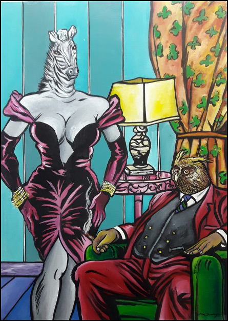 SAUVAGE MAX HAMLET Gallipoli 1950 "La musa e il borghese" Acrilico su tela cm 65X46 del 2017. Sul fronte è firmato in basso a destra. Sul retro è intitolato, firmato e reca etichetta con dati e impronta dell'artista e numero d'archiviazione. Autentica ed archiviazione su foto a cura dell'artista.