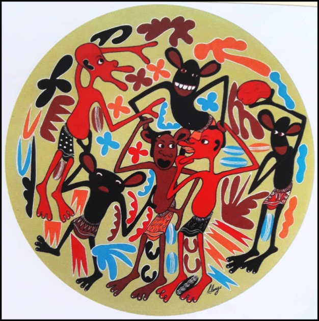 LILANGA GEORGE Tanzania 1934 - 2005 "Ebu Nikuambie" Acrilico su tavola cm 100 di diametro, del 1999. Provenienza "Sarenco Collection". Opera pubblicata a pag. 162 del catalogo ragionato "George Lilanga" Volume II.