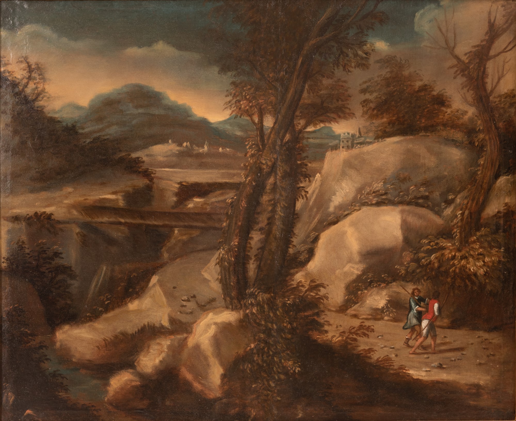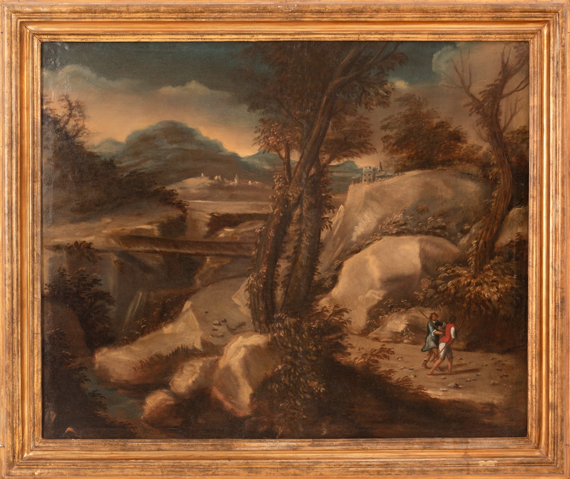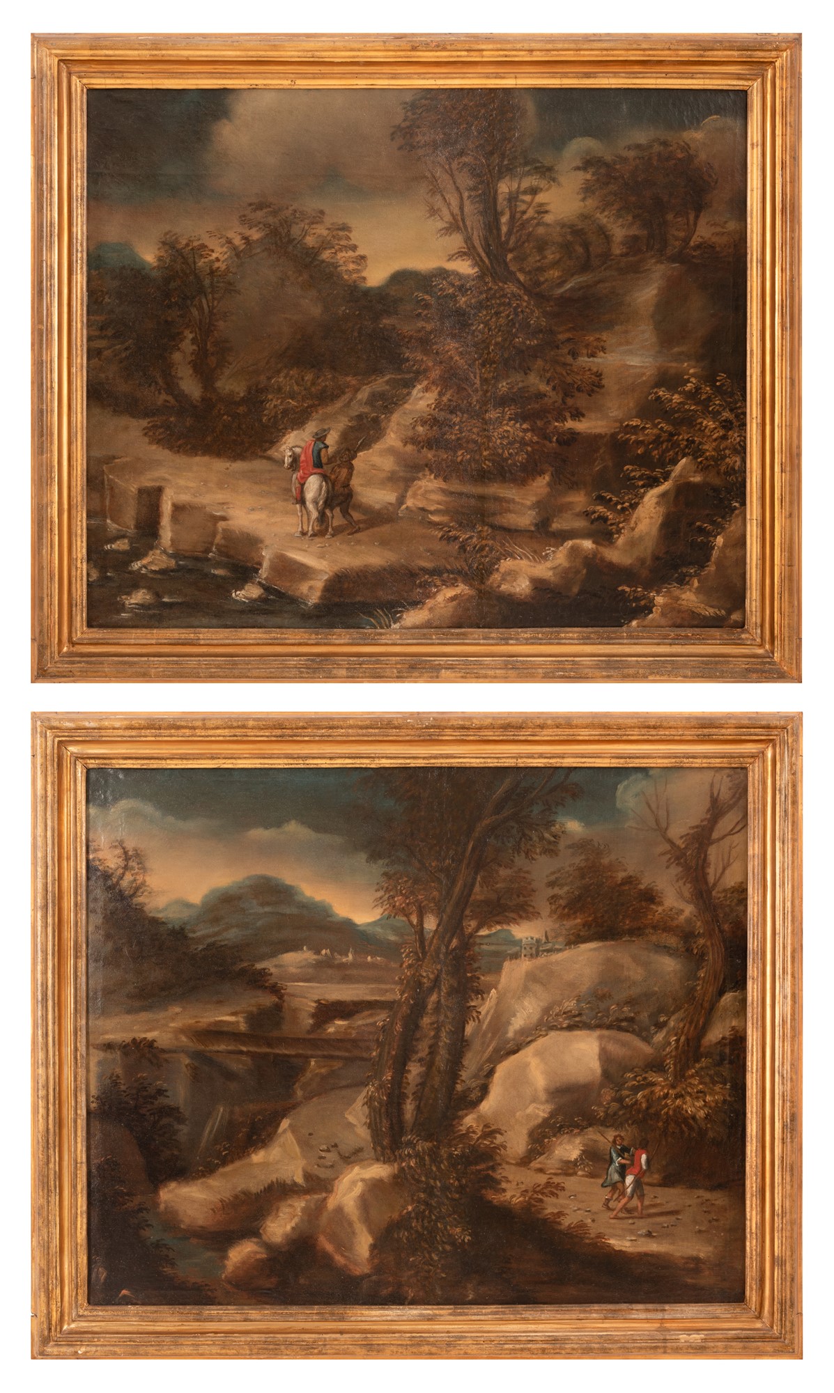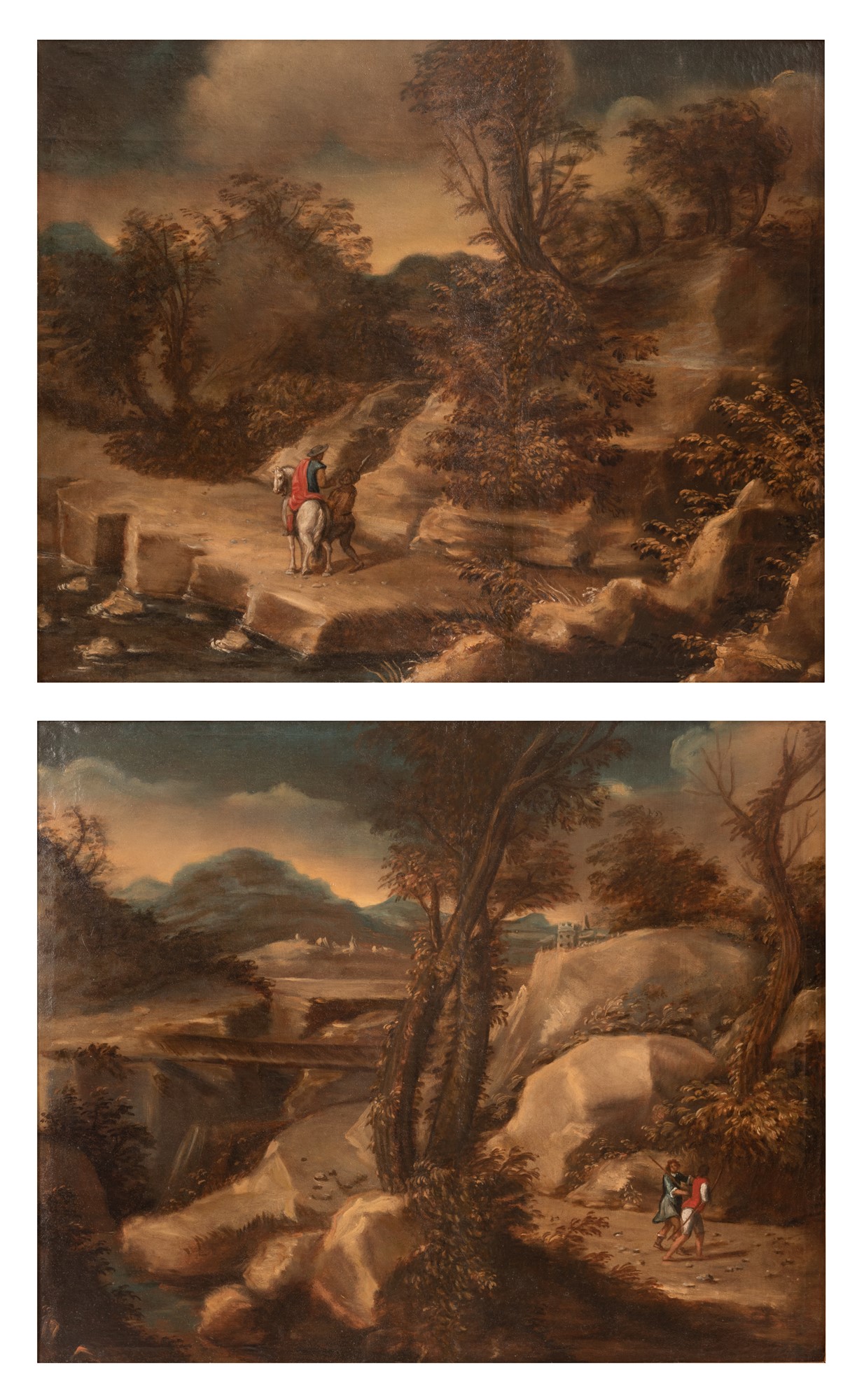Pittore toscano degli inizi del XVII secolo Coppia di dipinti raffiguranti paesaggi con personaggi