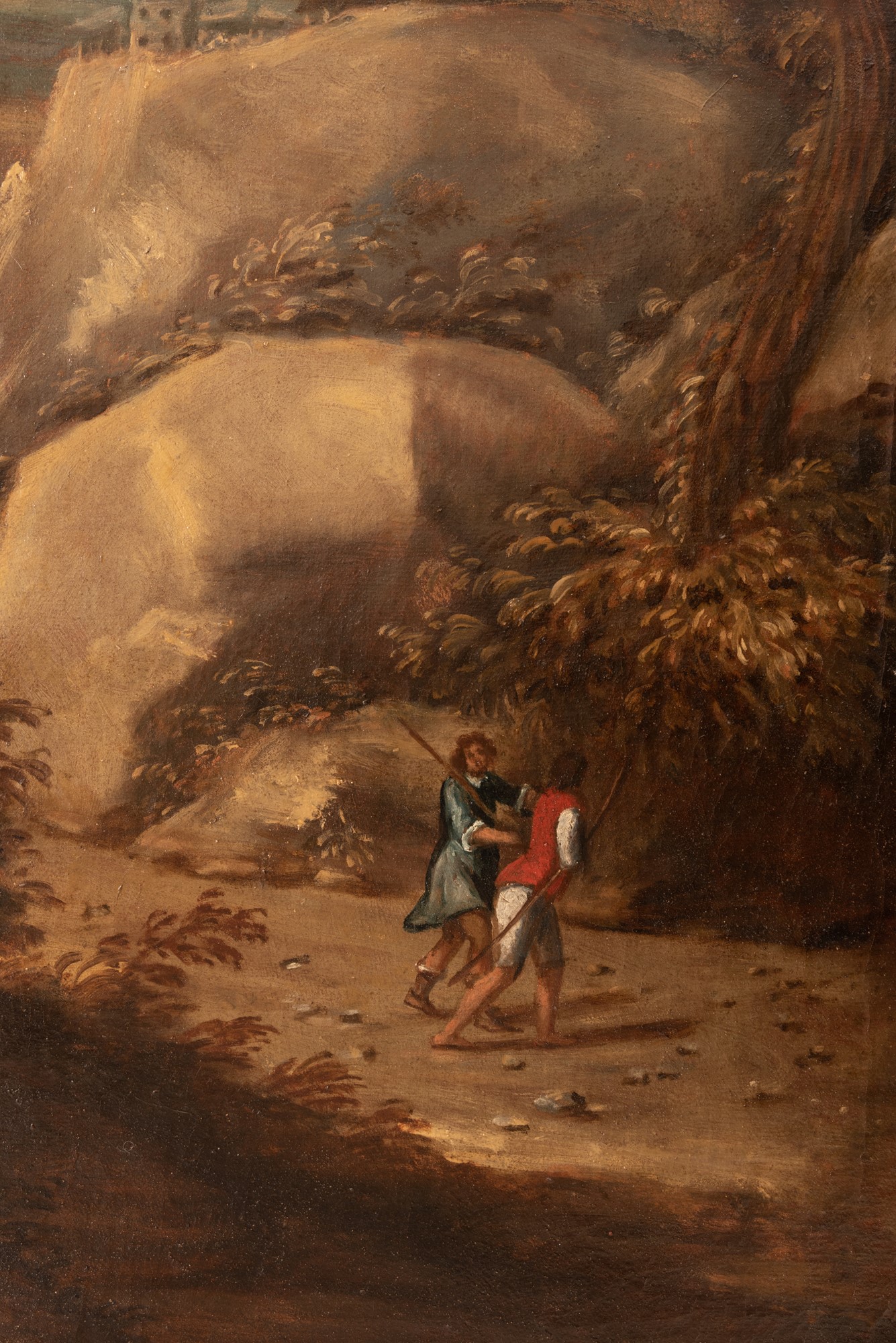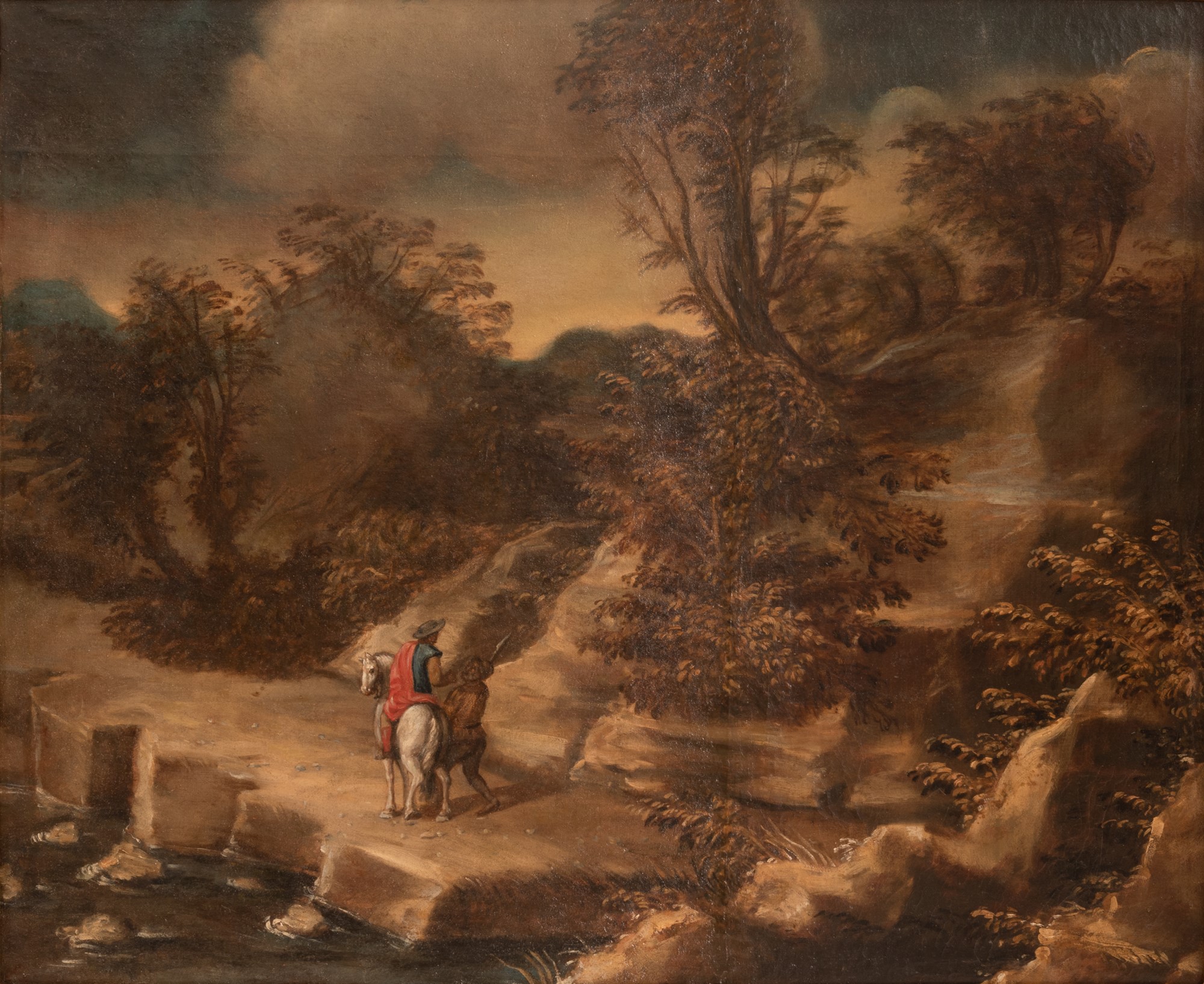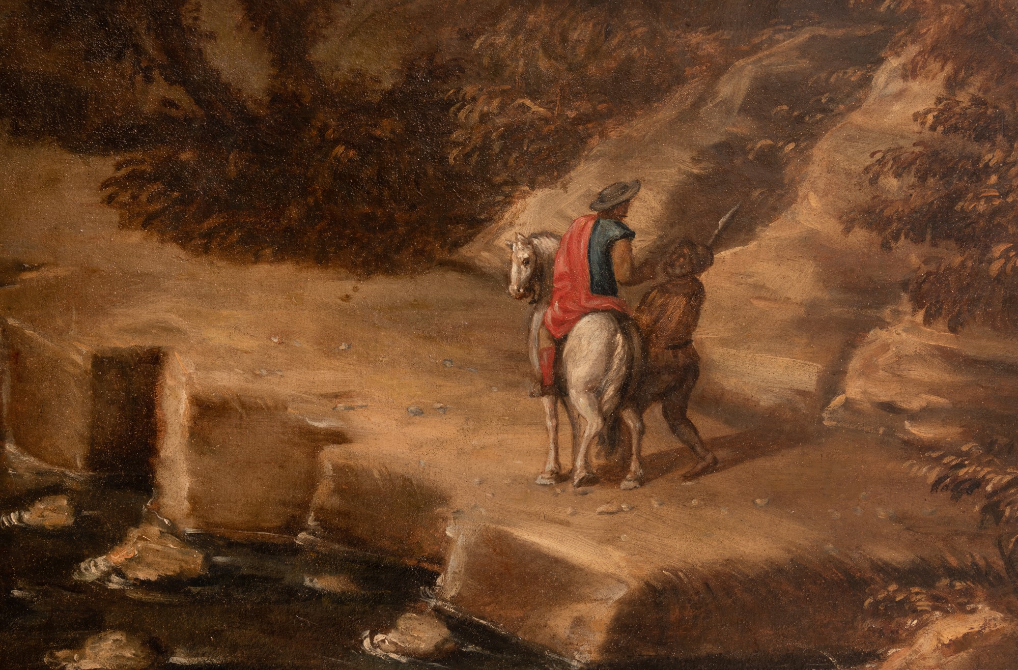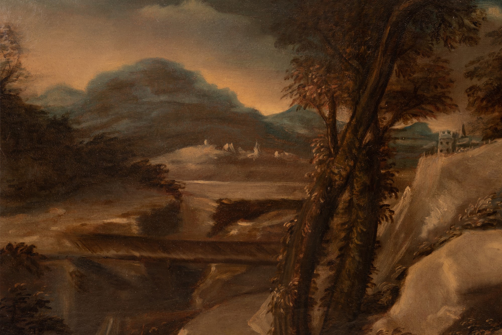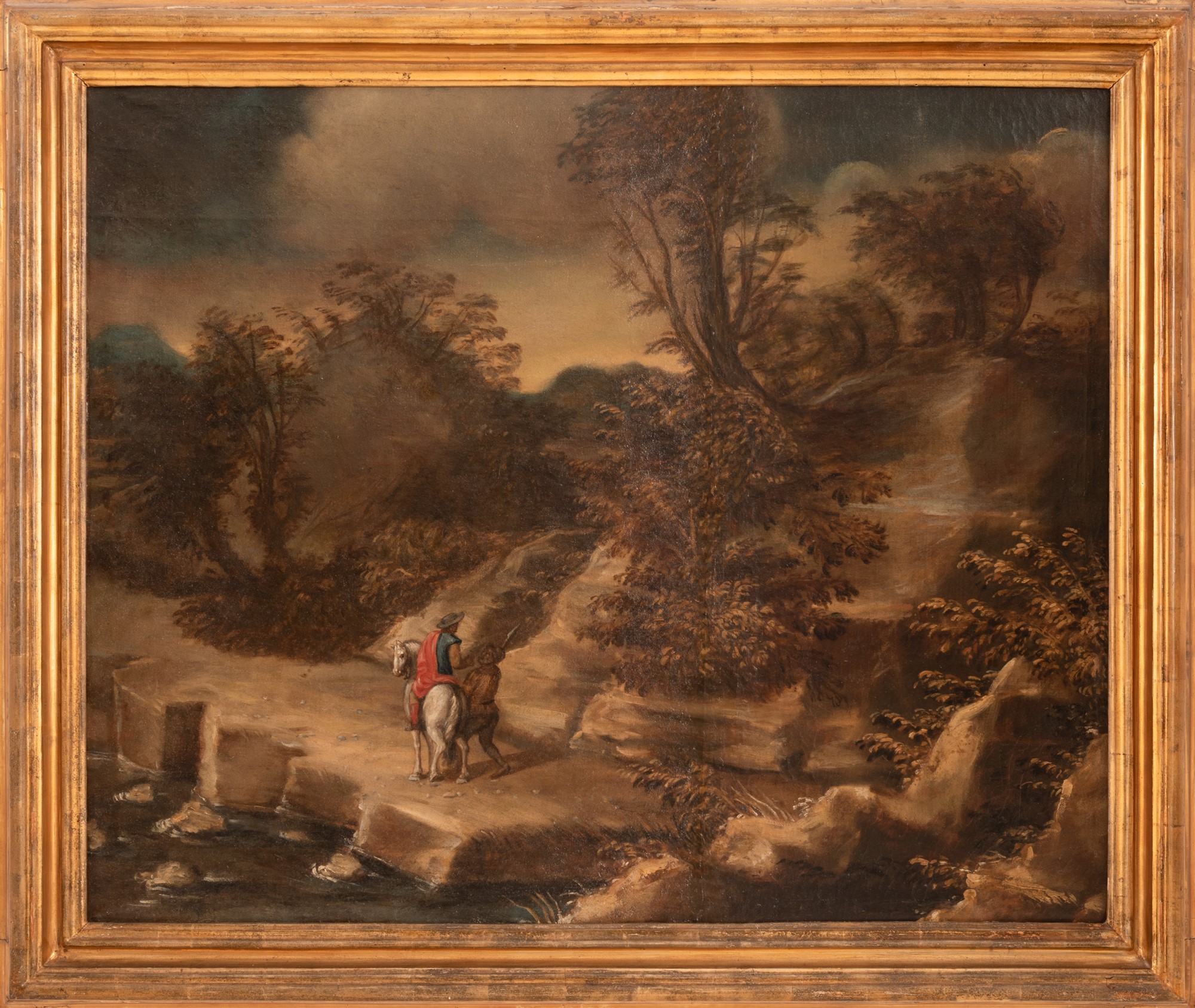 Pittore toscano degli inizi del XVII secolo Coppia di dipinti raffiguranti paesaggi con personaggi