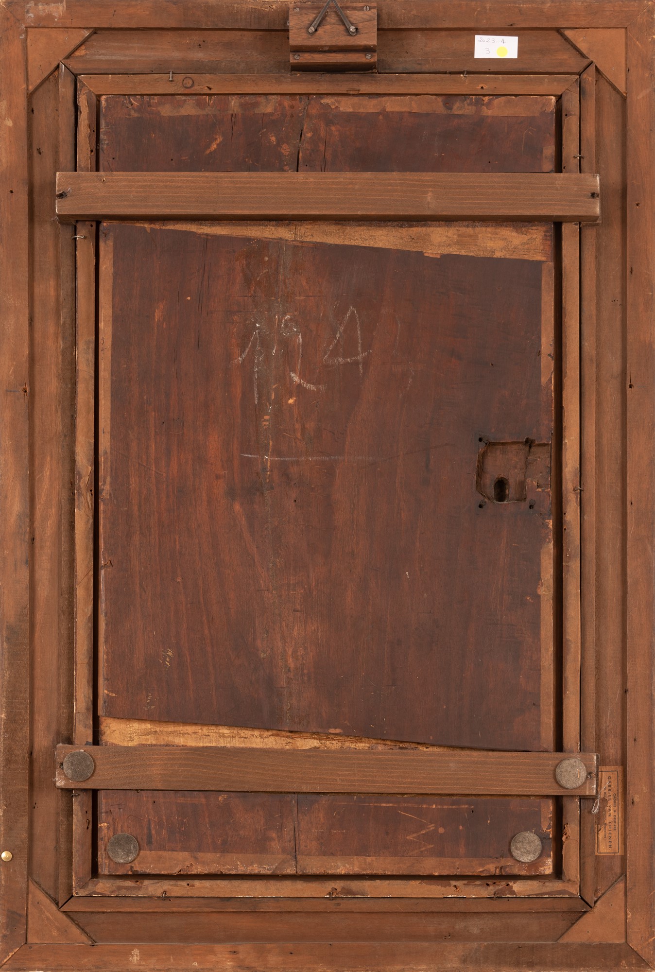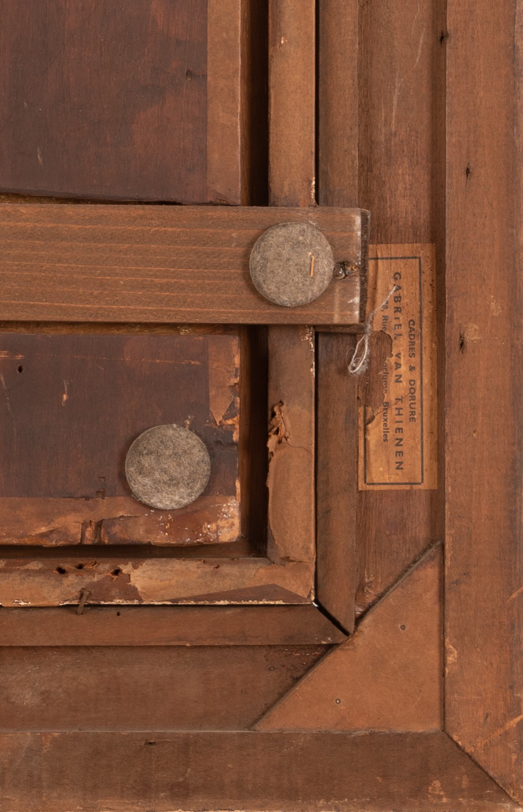 Al retro della cornice ( della prima decade del Novecento) cartiglio del corniciaio e doratore Gabriel Van Thienen di Bruxelles