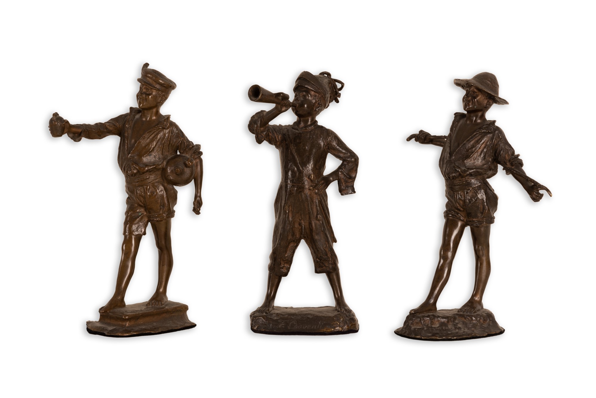 Francesco Conventi Tre sculture in bronzo brunito raffiguranti scugnizzi nelle vesti di acquaiolo, banditore e contadino