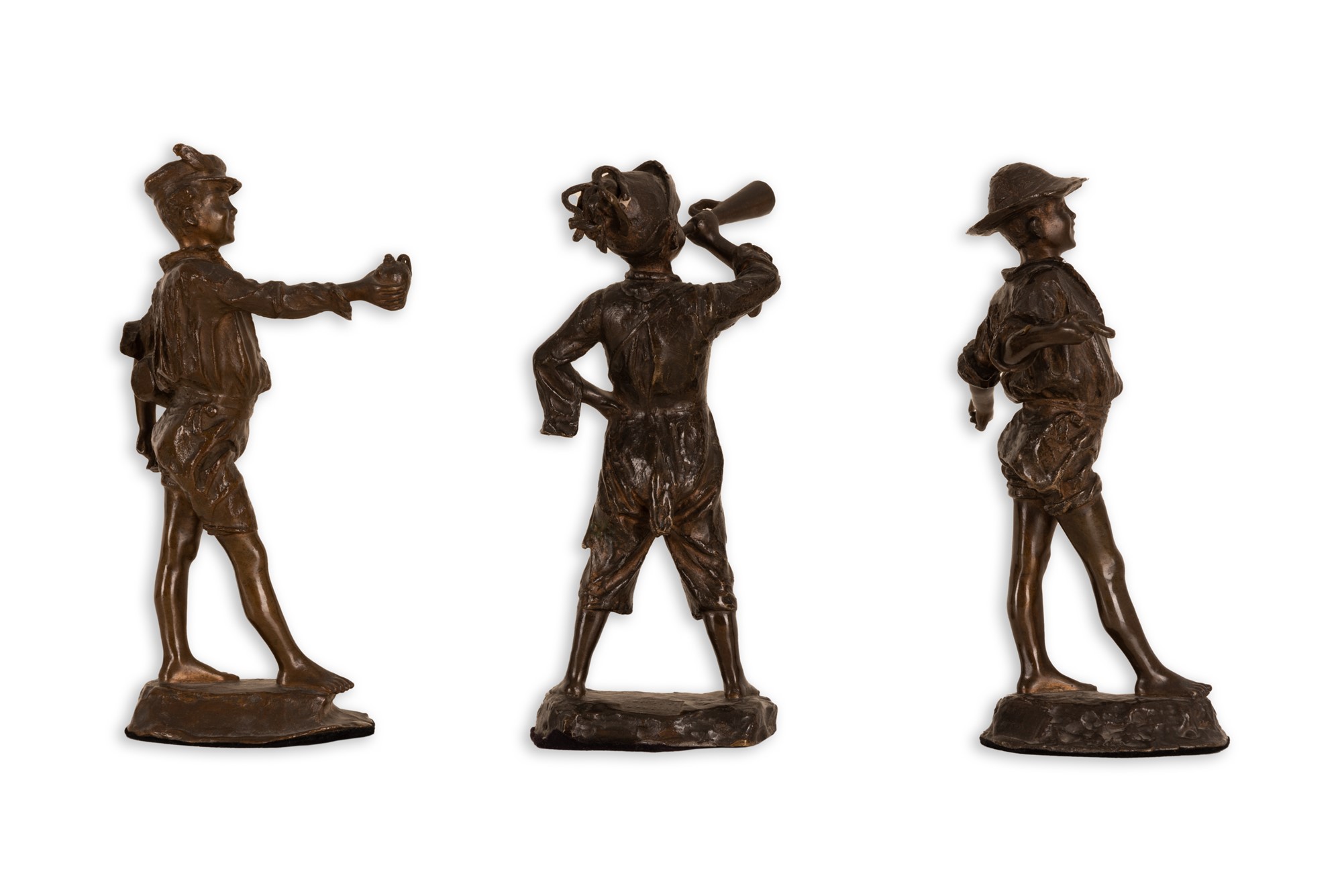 Tre sculture in bronzo brunito raffiguranti scugnizzi nelle vesti di acquaiolo, banditore e contadino