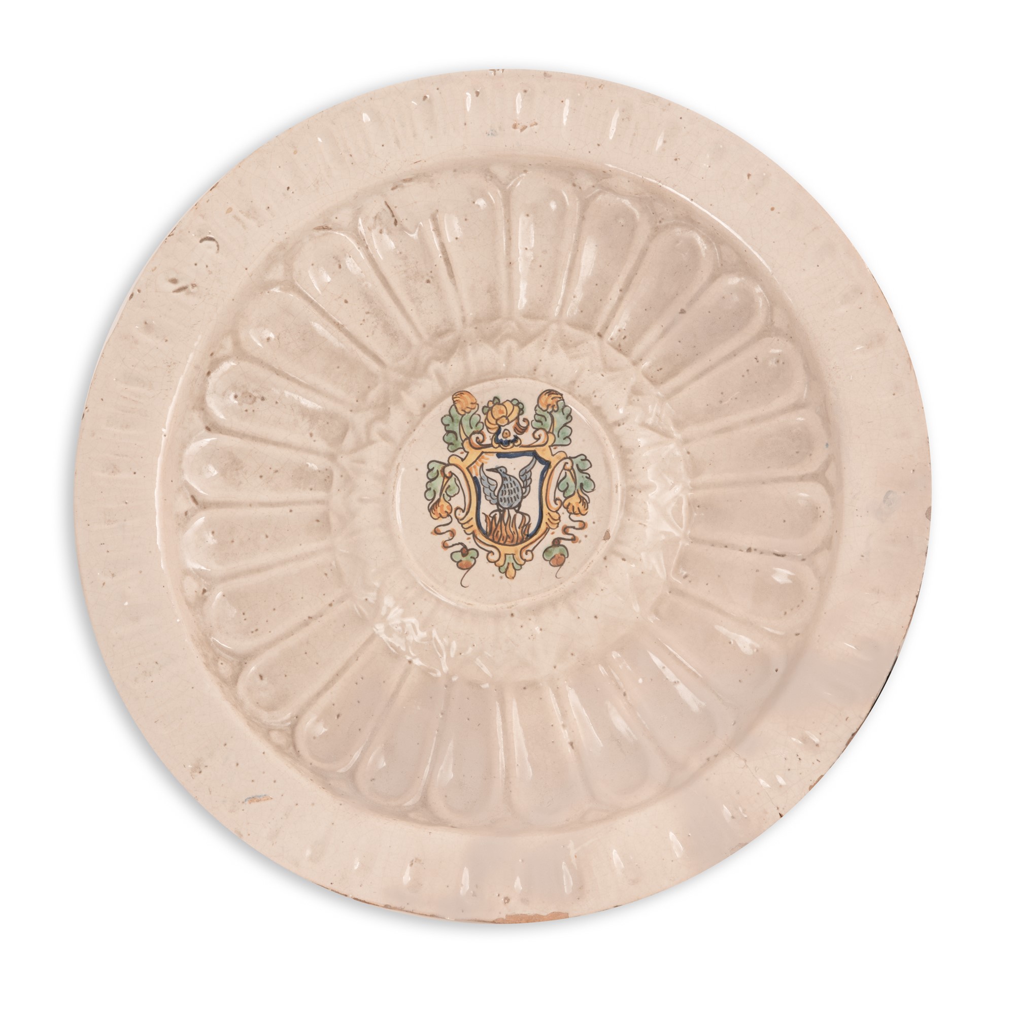 Bacile umbonato con parete baccellata; al centro è dipinto uno stemma con la fenice che sorge dalle fiamme. La forma e lo stile della decorazione sono tipici della produzione compendiaria derutese del Seicento, caratterizzata anche della presenza del colore verde.