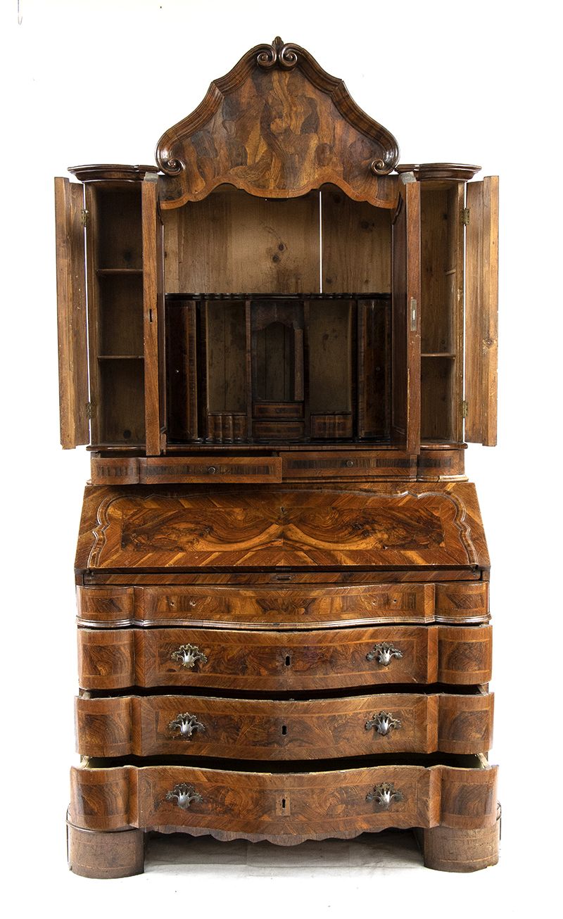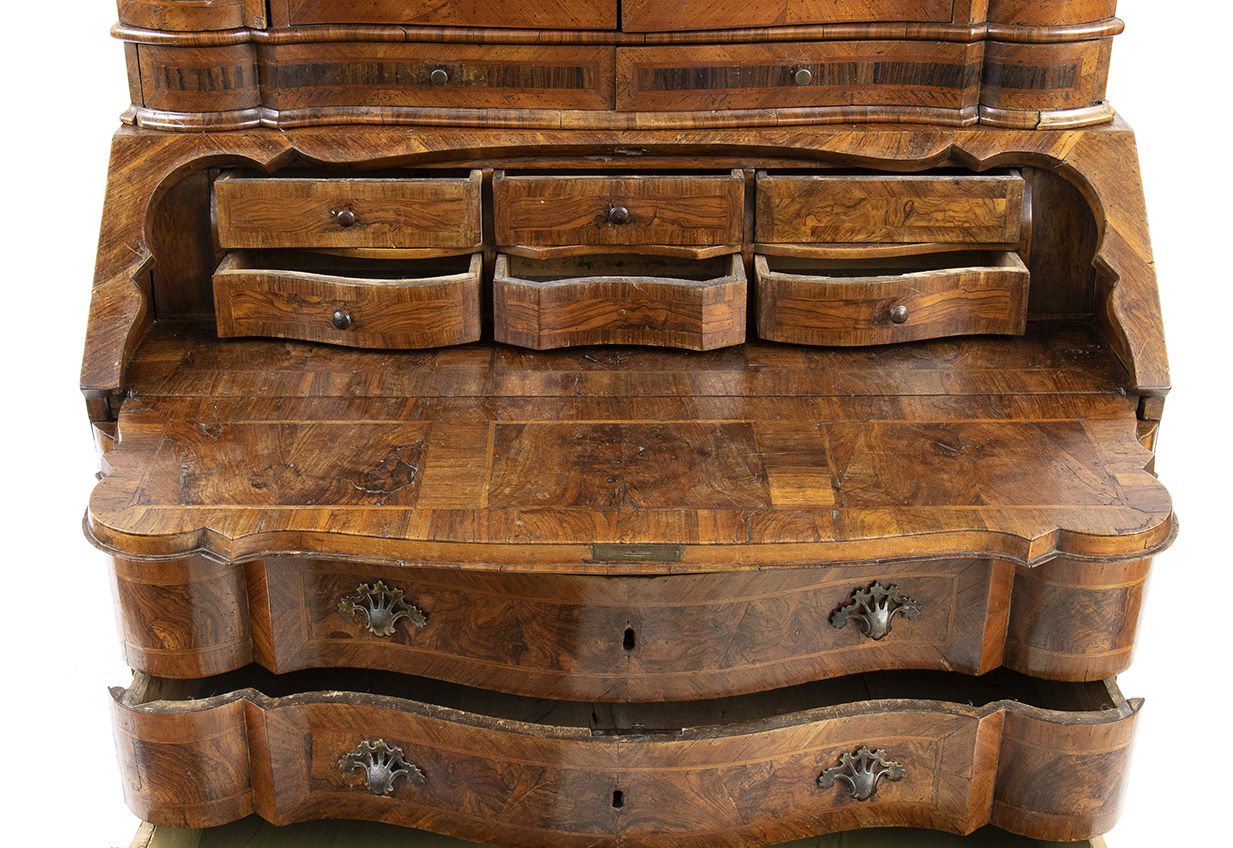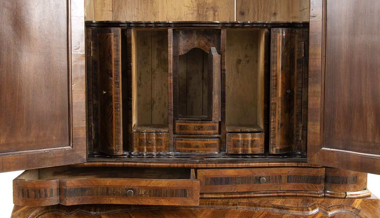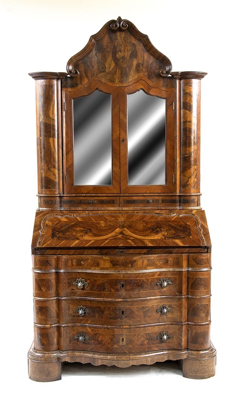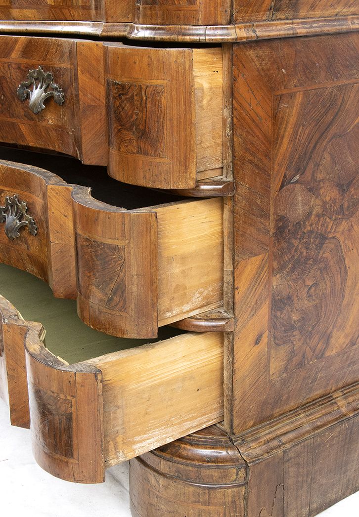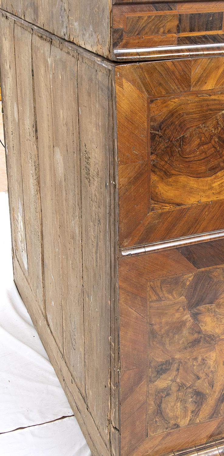 lastronato in legno di noce su struttura di pioppo. Il mobile è a due corpi, la parte superiore con due sportelli a specchi e due sportelli nascosti sui fianchi. Il corpo inferiore a 4 cassetti più un cassetto nascosto alla base.