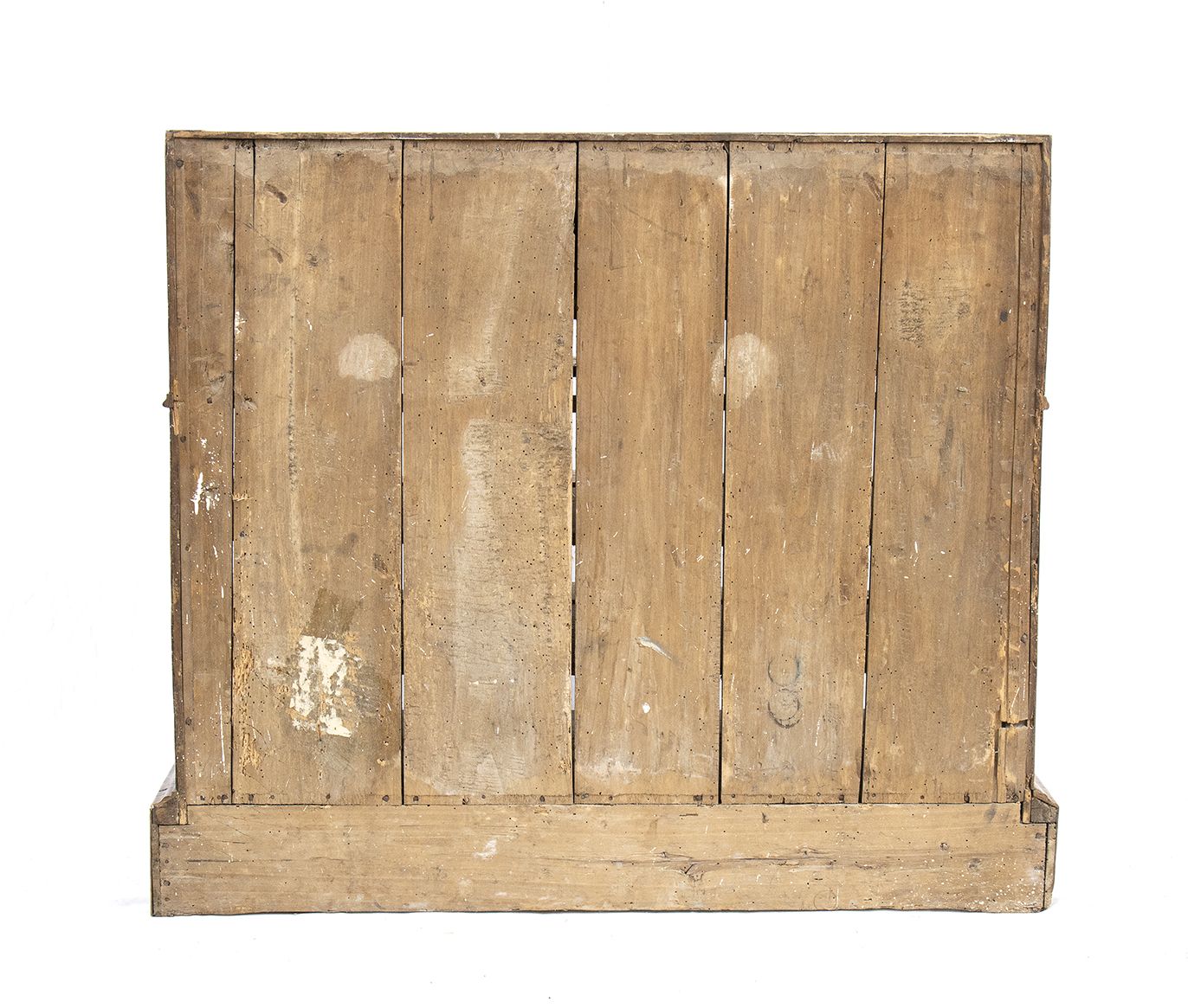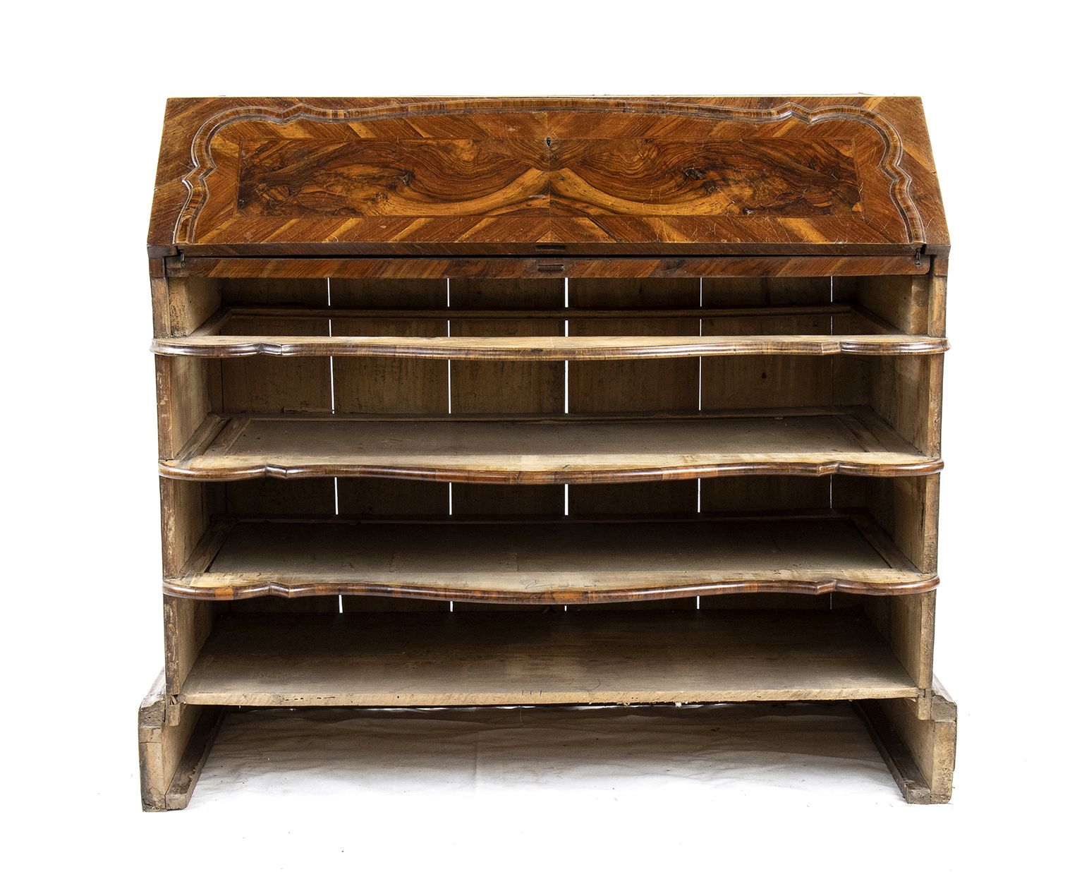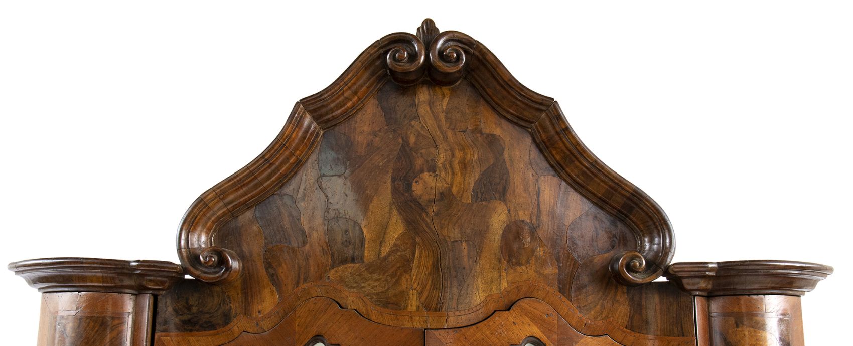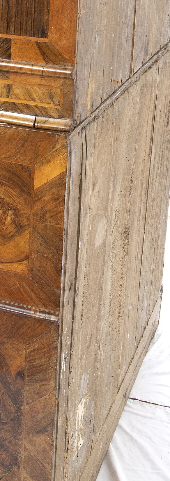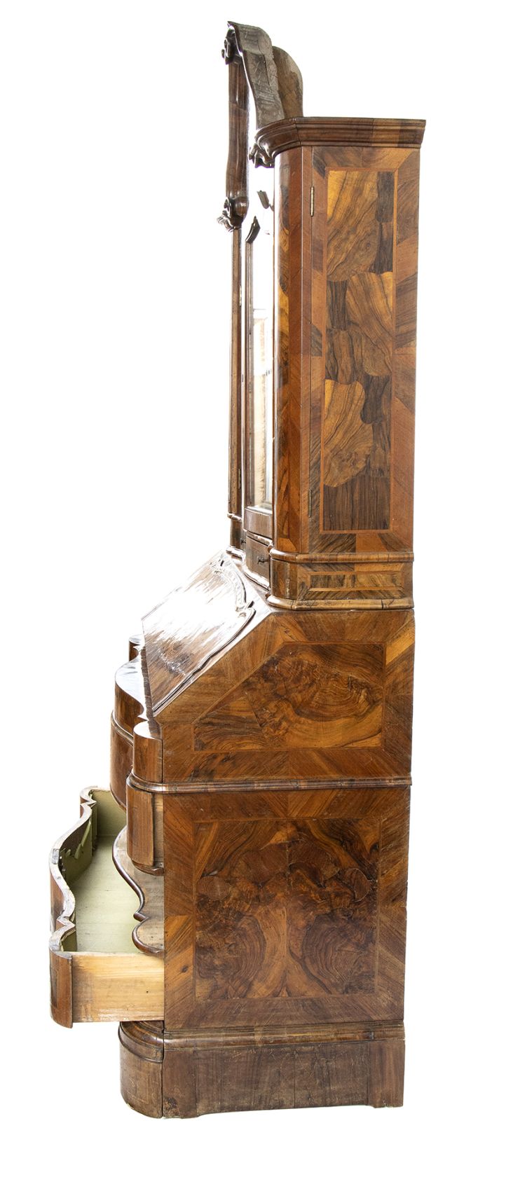 lastronato in legno di noce su struttura di pioppo. Il mobile è a due corpi, la parte superiore con due sportelli a specchi e due sportelli nascosti sui fianchi. Il corpo inferiore a 4 cassetti più un cassetto nascosto alla base.