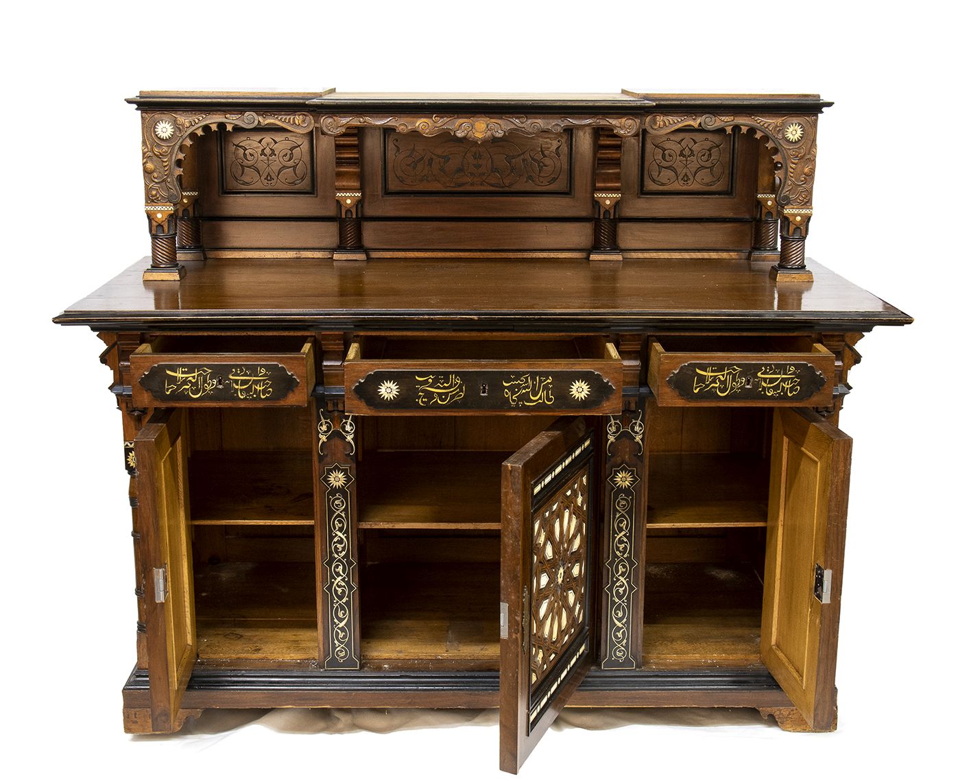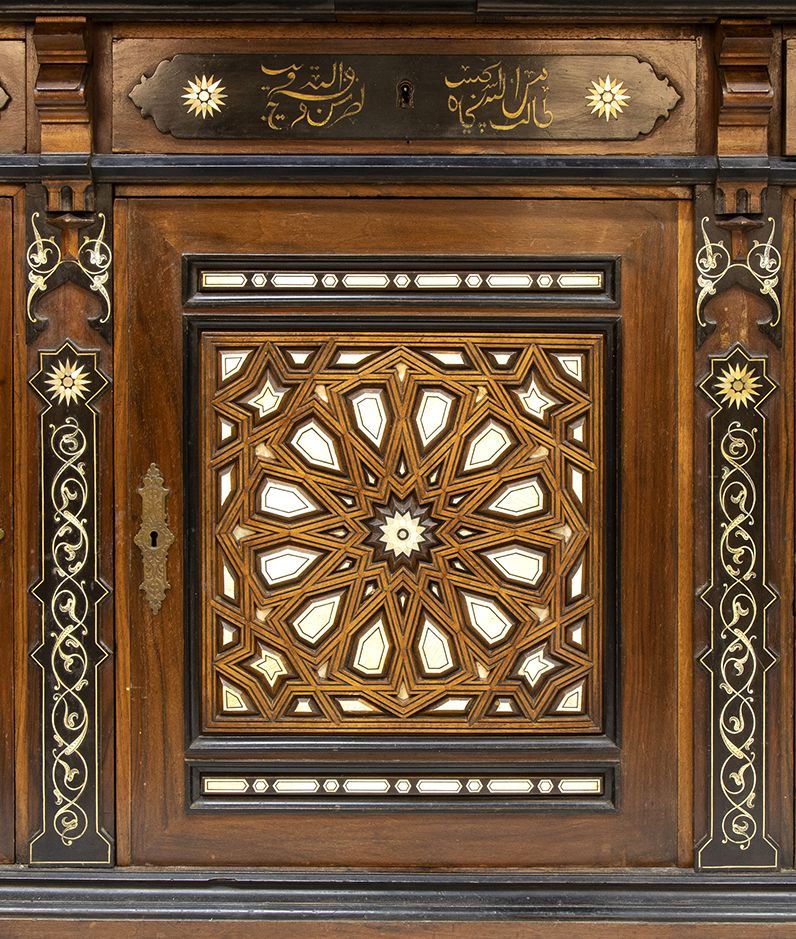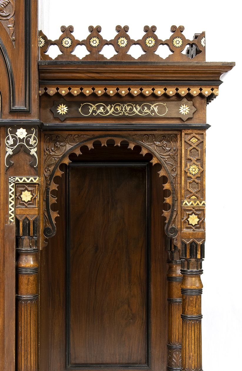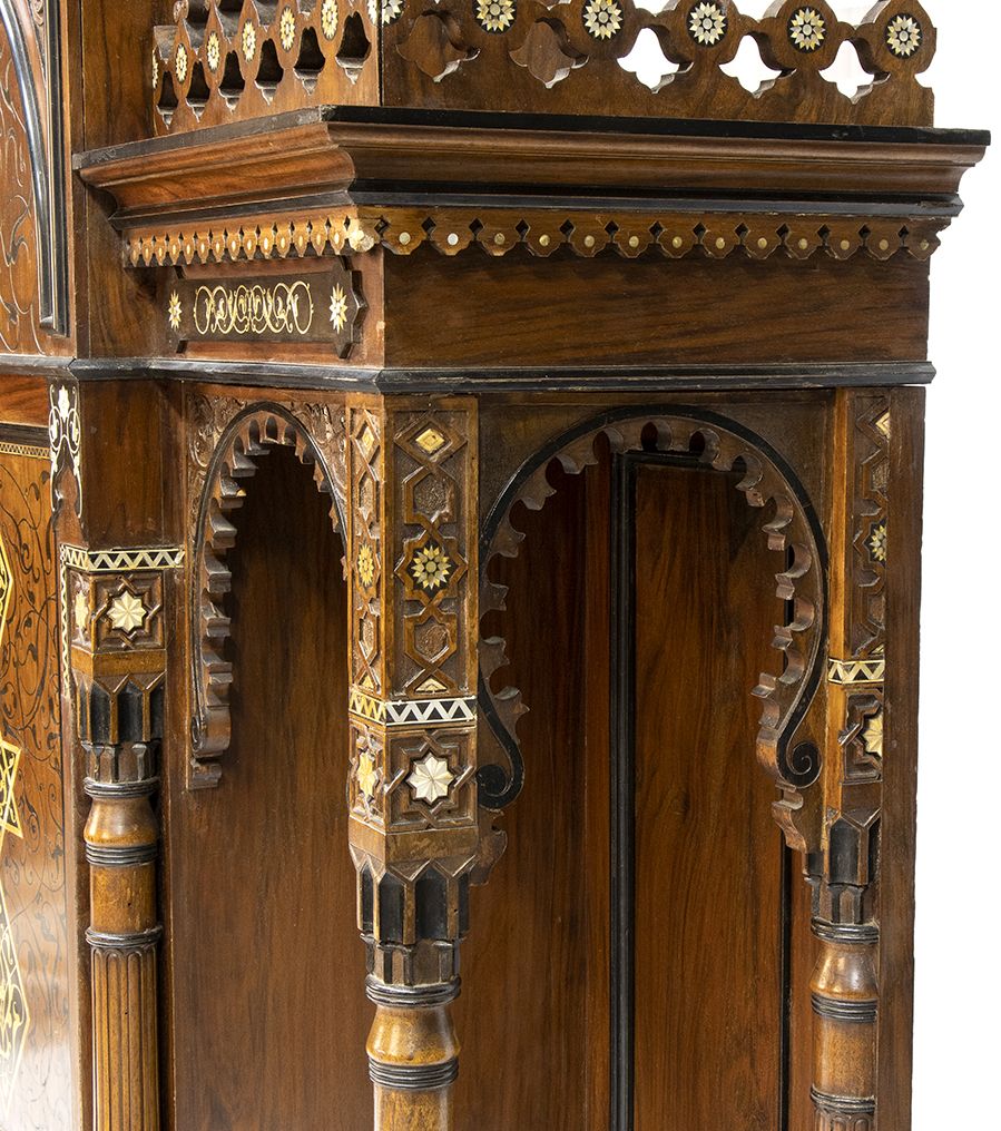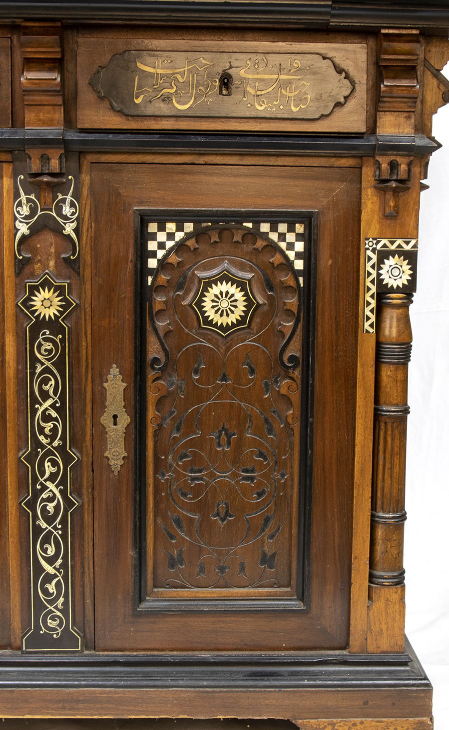 in noce con architettura orientaleggiante, intarsiata con motivi geometrici, arabeschi e scritte in arabo in legno di frutto e osso