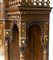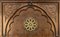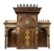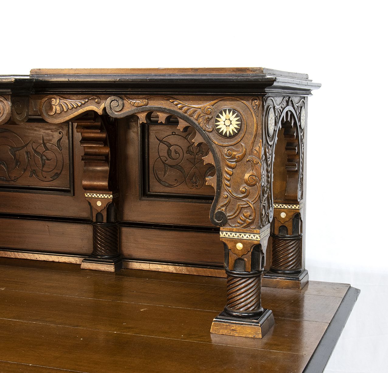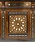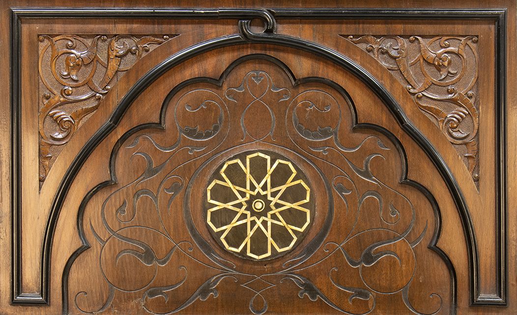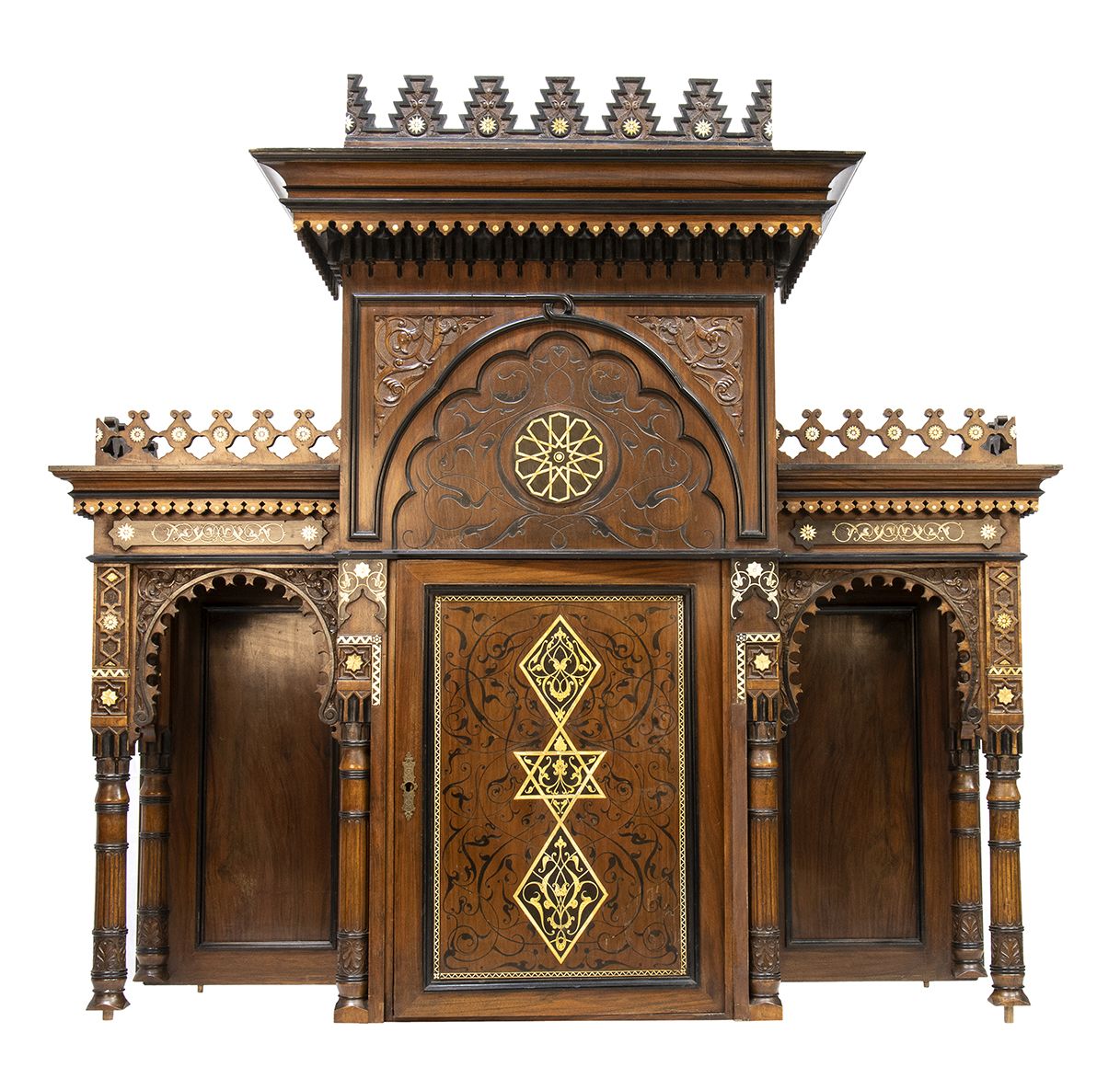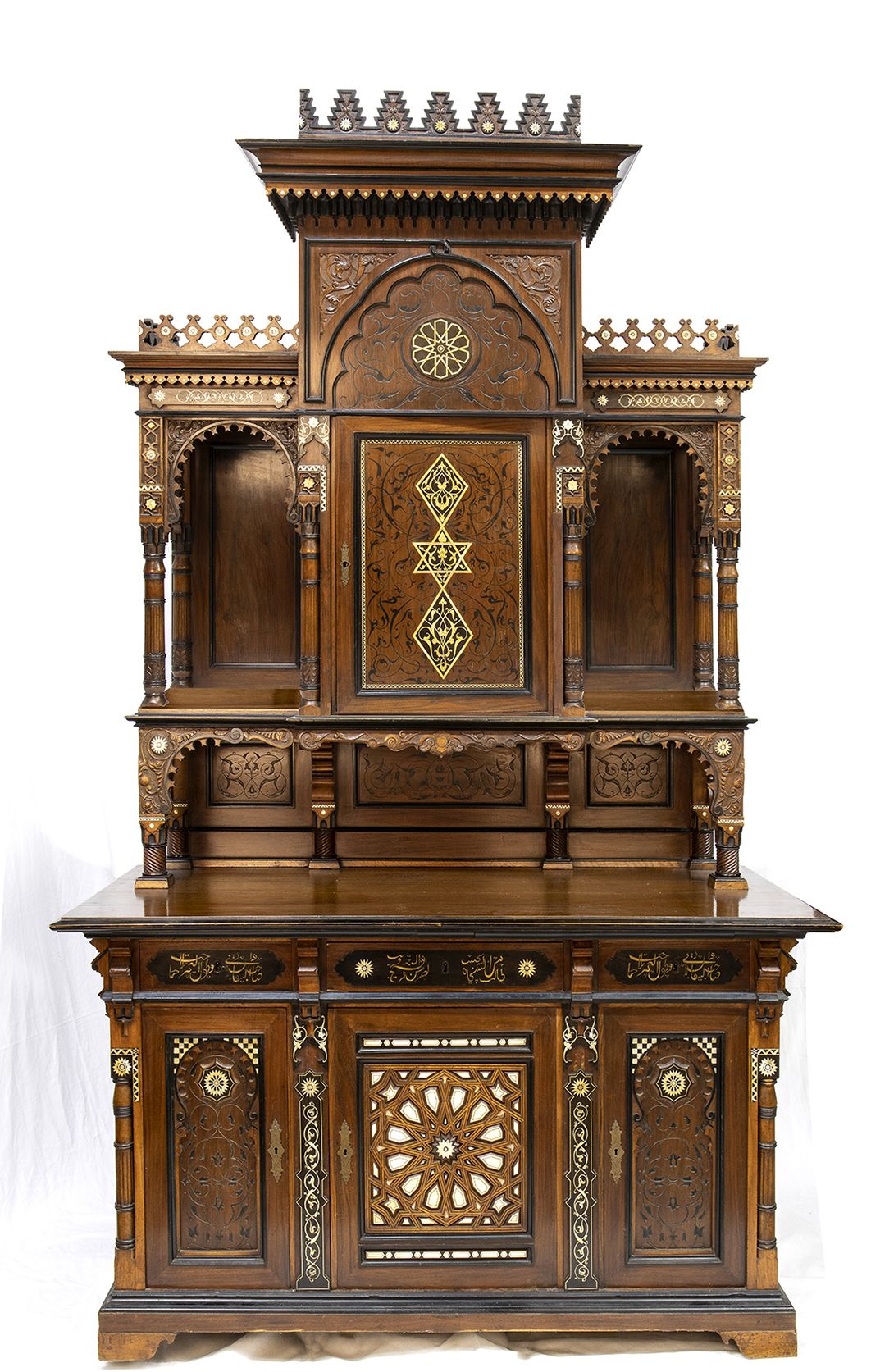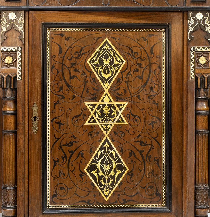 in noce con architettura orientaleggiante, intarsiata con motivi geometrici, arabeschi e scritte in arabo in legno di frutto e osso