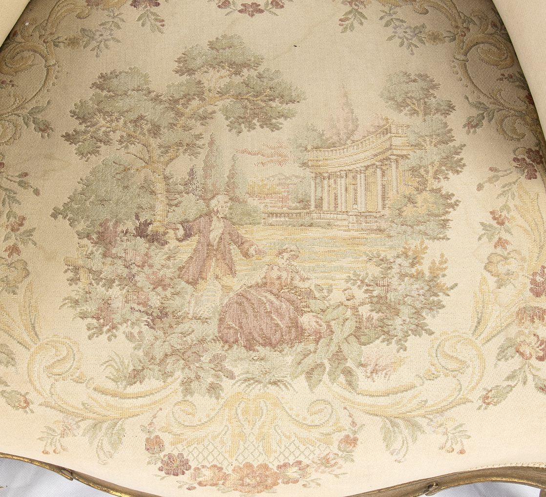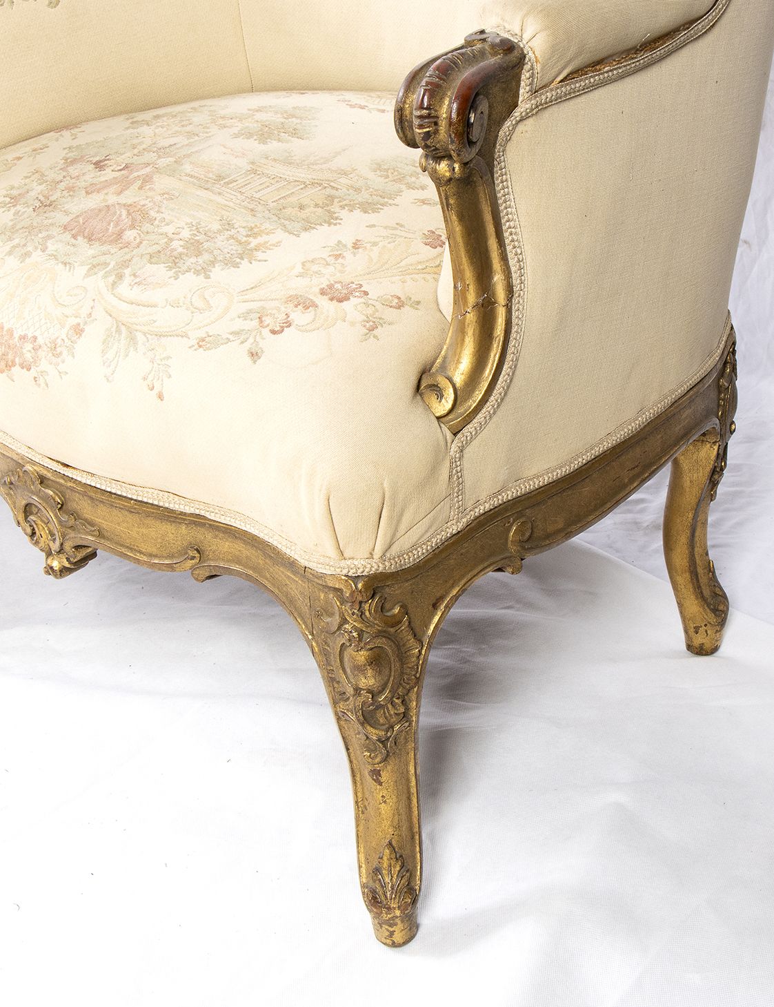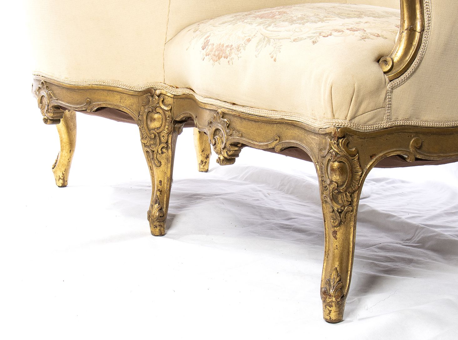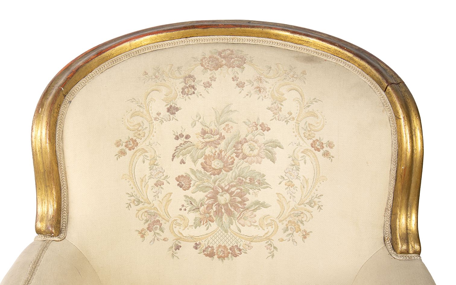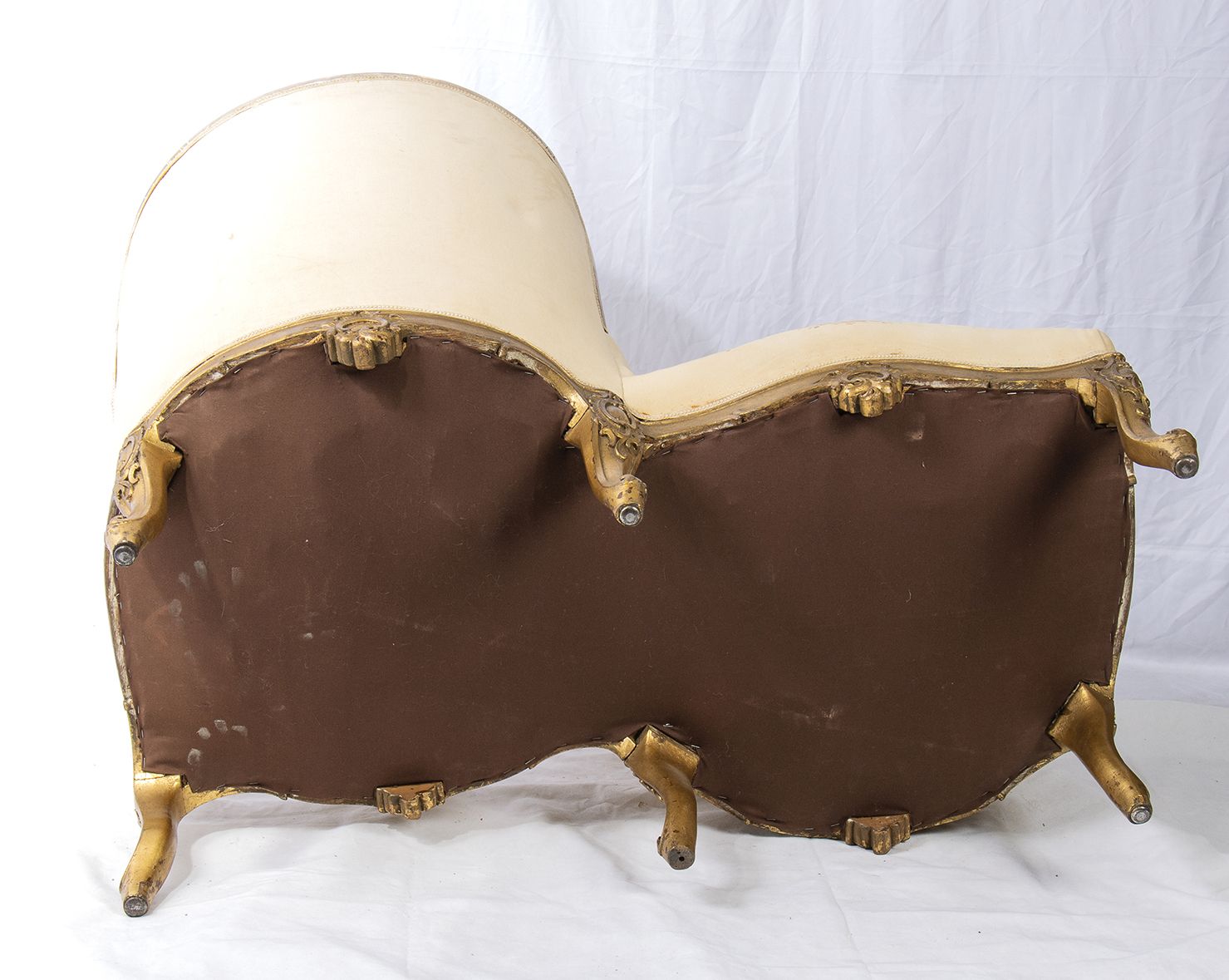 di manifattura parigina con struttura dorata. Questo genere di divano, che consiste in due sedili separati da una piccola consolle o bracciolo, permetteva di posizionarsi uno di fronte all’altro in modo da creare uno spazio privato e accogliente per due persone.