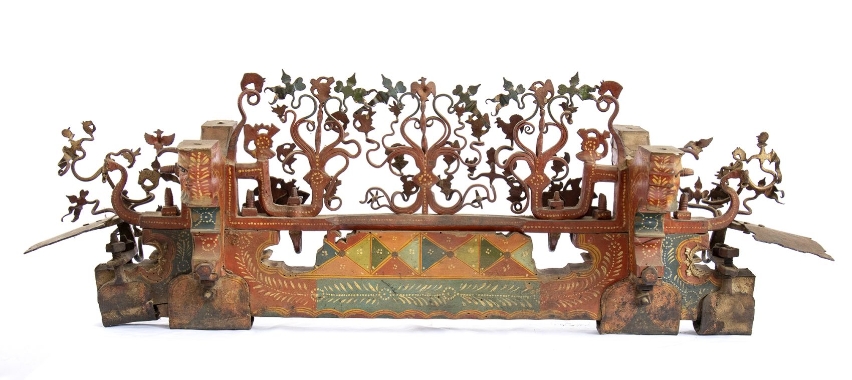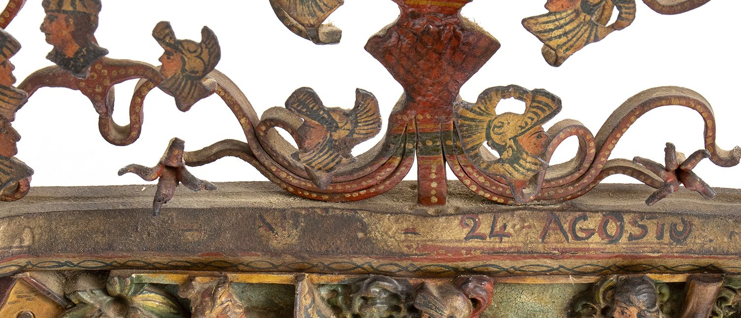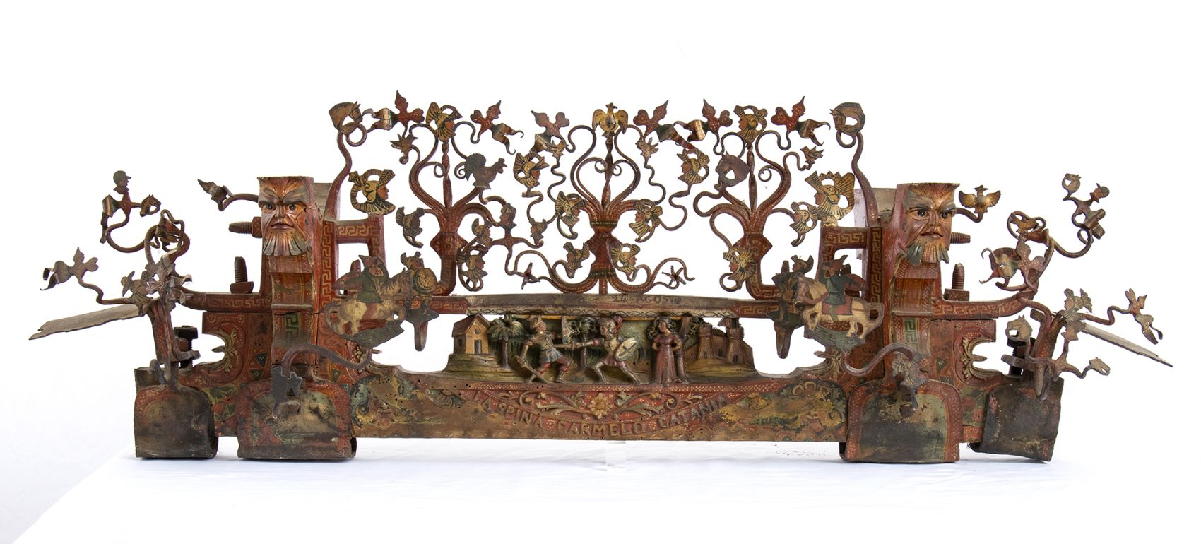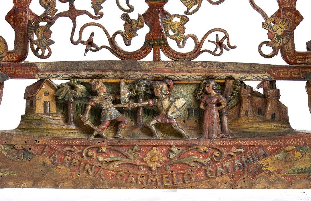 traversa posteriore di un carretto siciliano riccamente decorato con la Chanson de Roland (la notte di San Bartolomeo). Sul fronte è presente l’iscrizione del carratore “ La Spina Carmelo - Catania - 24 agosto".