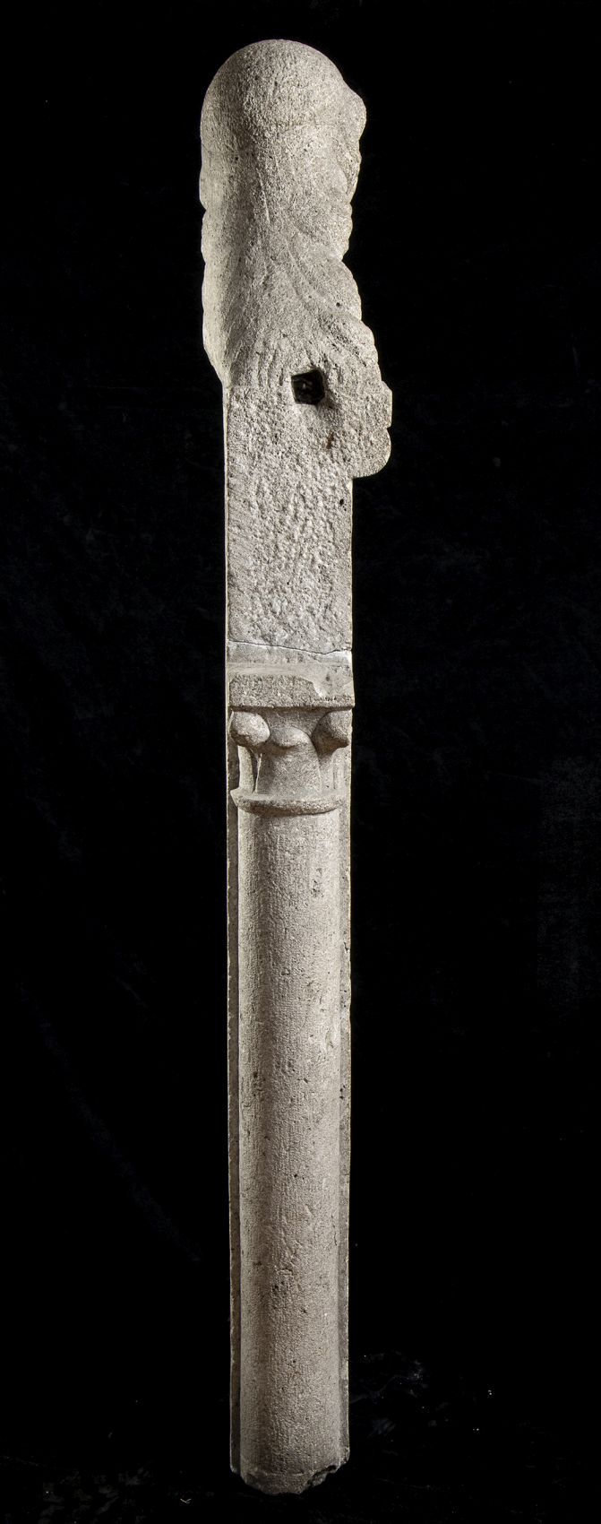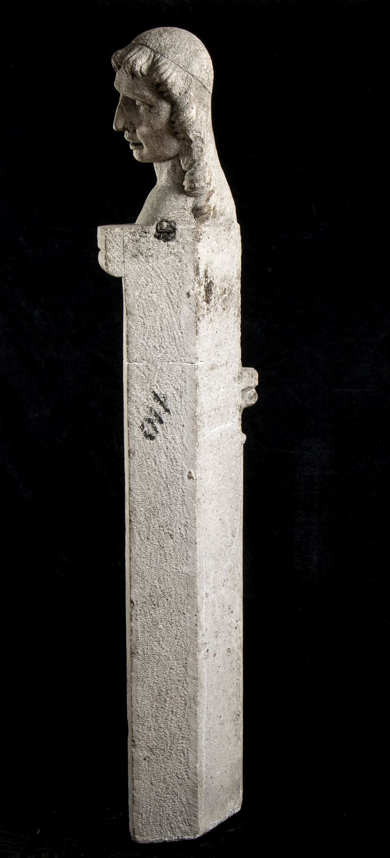 Protome virile imberbe dal collo allungato, la capigliatura a riccioli disposti regolarmente; poggiante suuna colonna a decori folgiati.