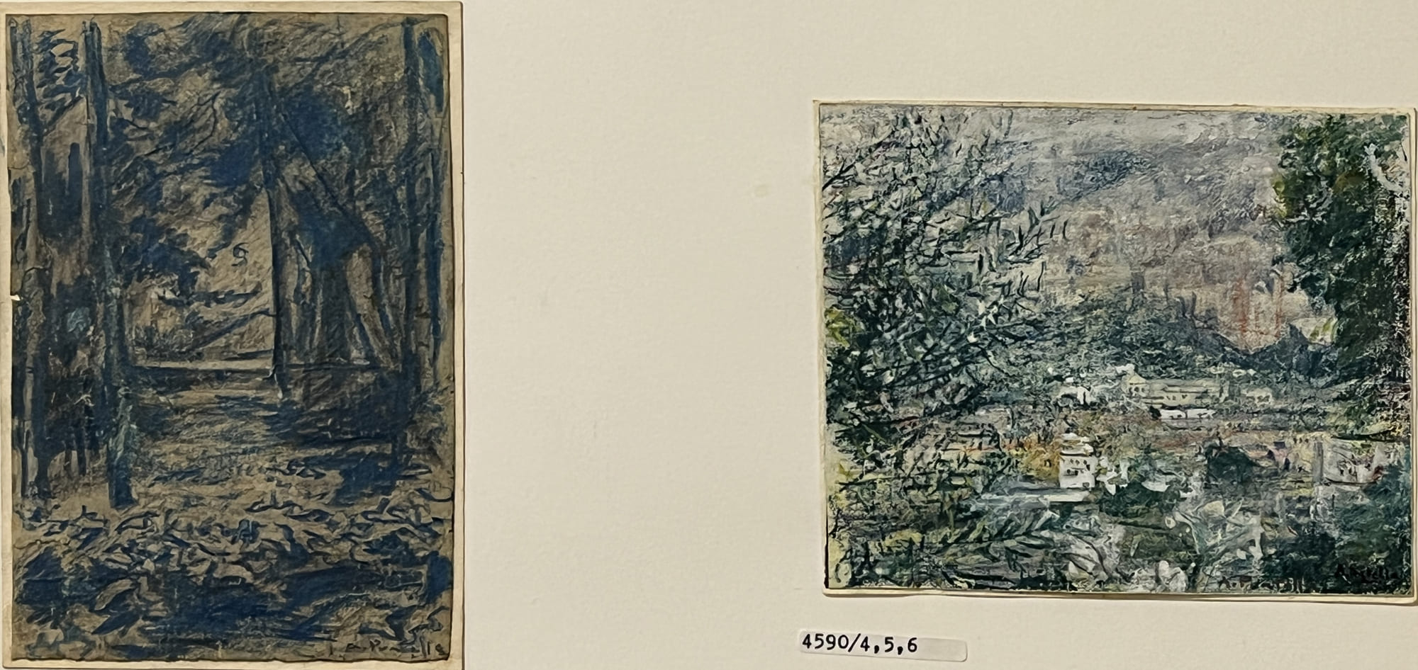 1. Effetto di luce nel bosco, tecnica mista su carta, firma: in basso a destra, misure: cm 14,5 x 10