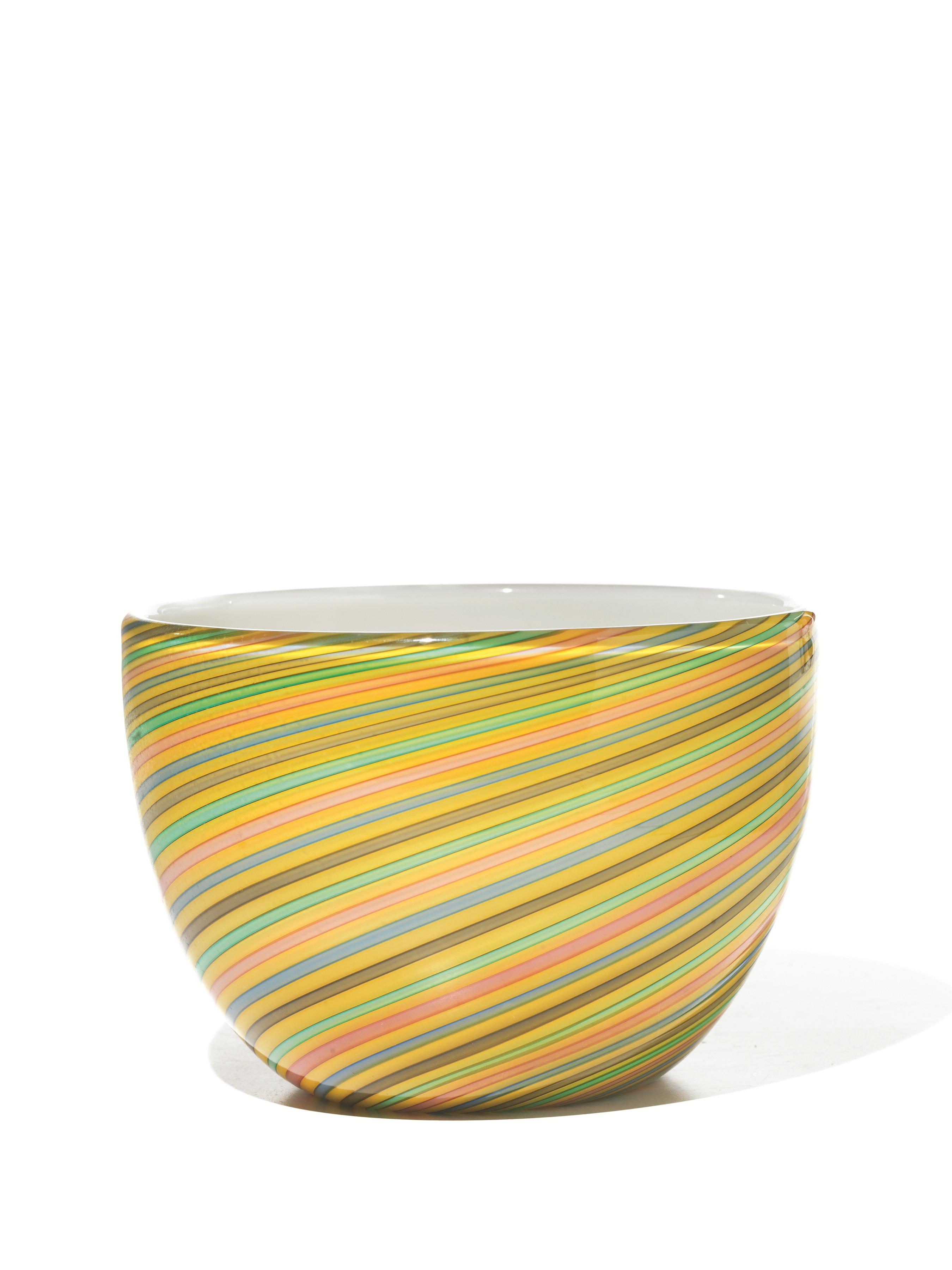 in vetro incamiciato, decorato con motivo a spirale a righe di quattro colori su fondo giallo