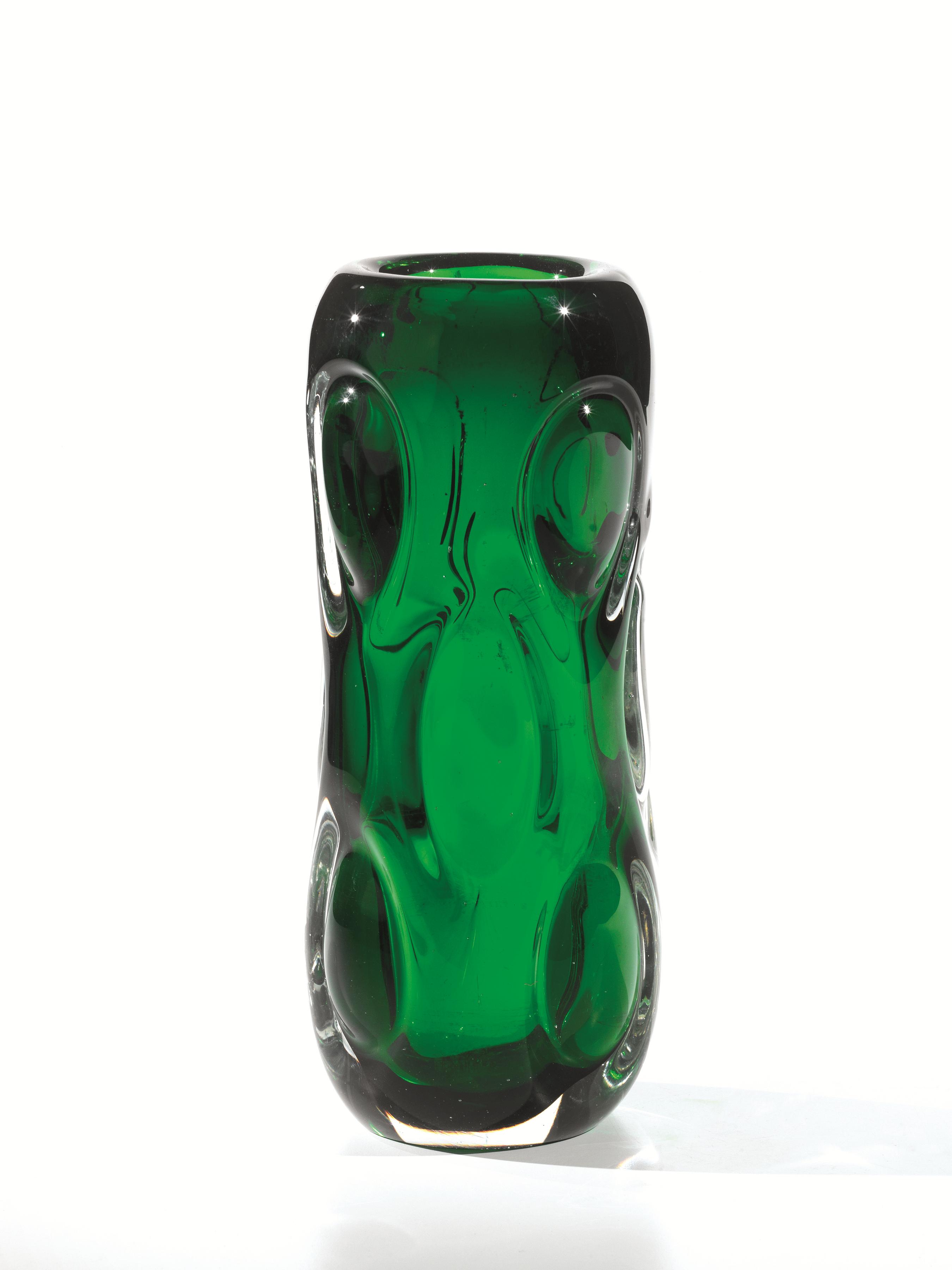 in vetro verde sommerso trasparente, forma cilindrica, superficie lavorata alla mola in forme a goccia