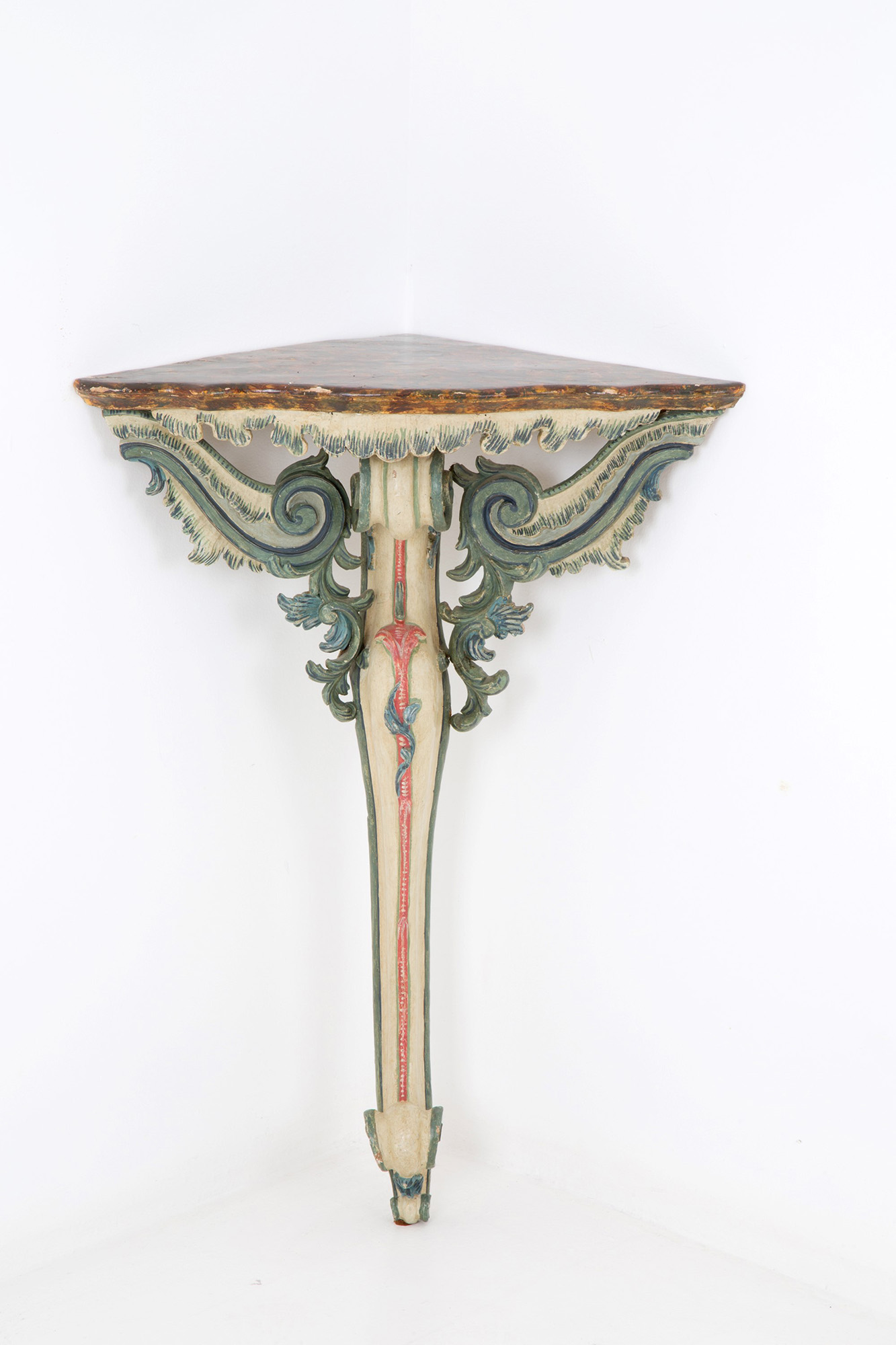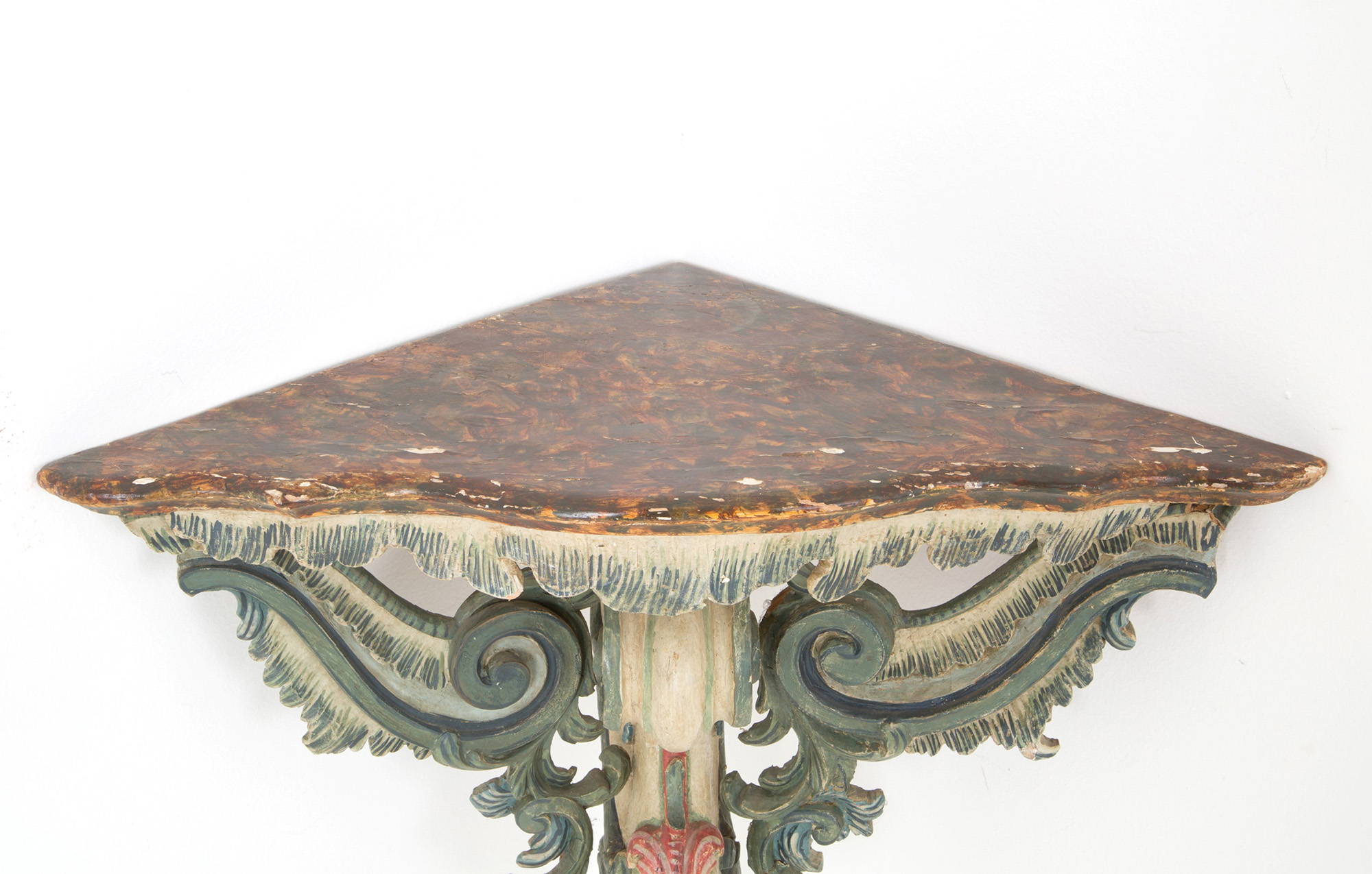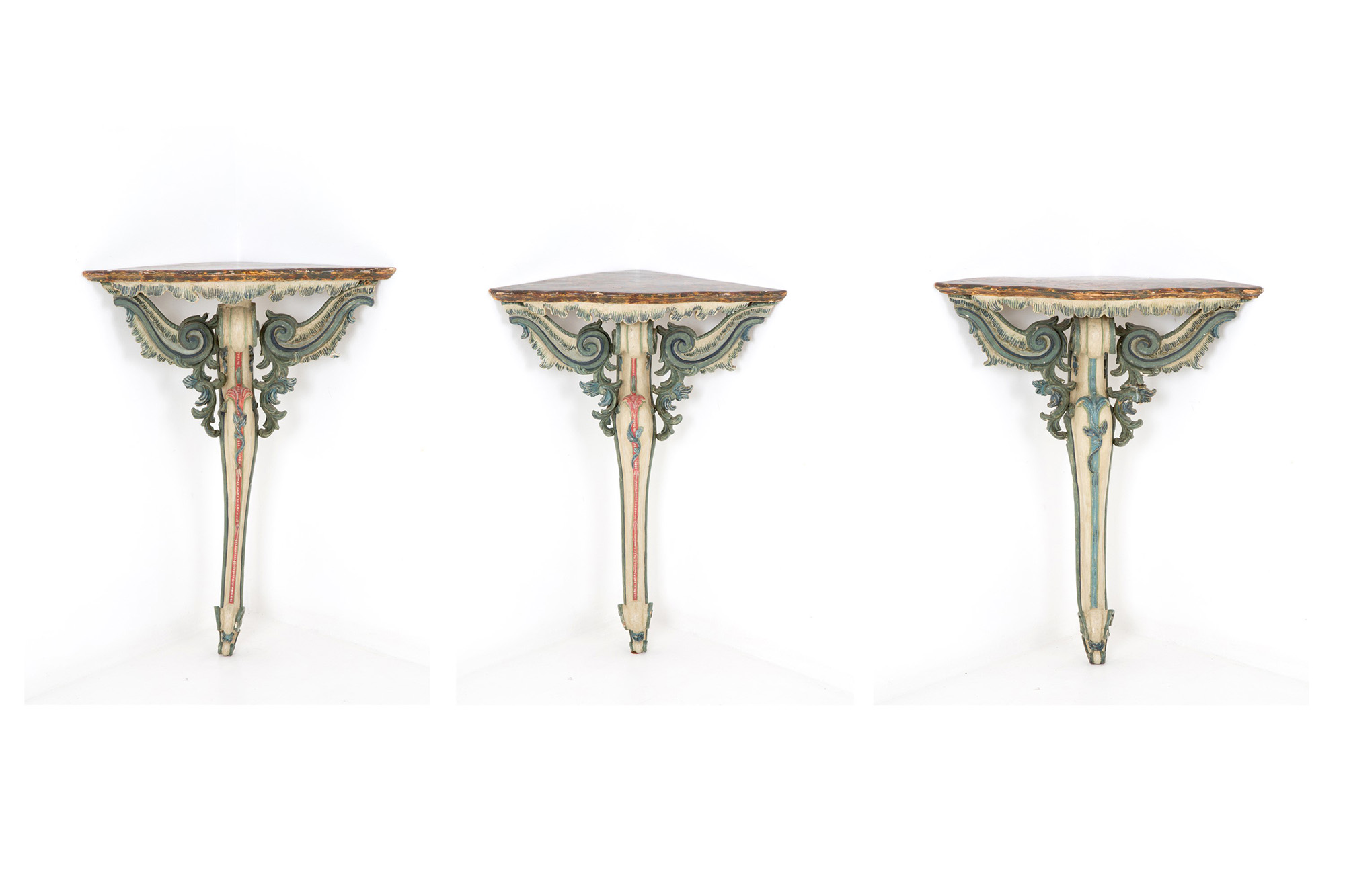 Three corner cabinets in lacquered wood with faux marble top. Liguria. Early 18th century. 93x66x37cm approx. Tre angoliere in legno laccato con piano in finto marmo. Liguria. Inizi XVIII secolo. 93x66x37 cm ca.