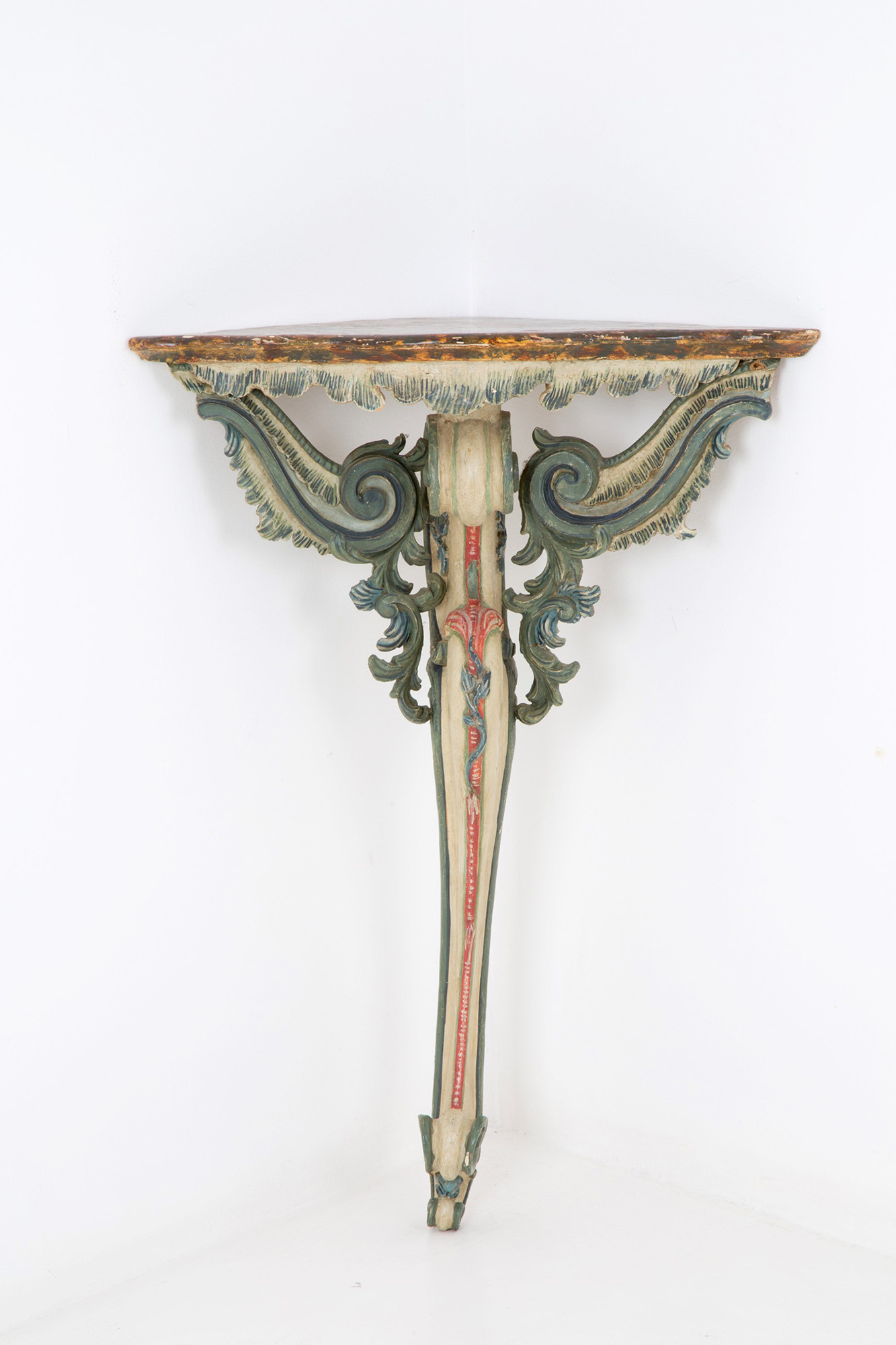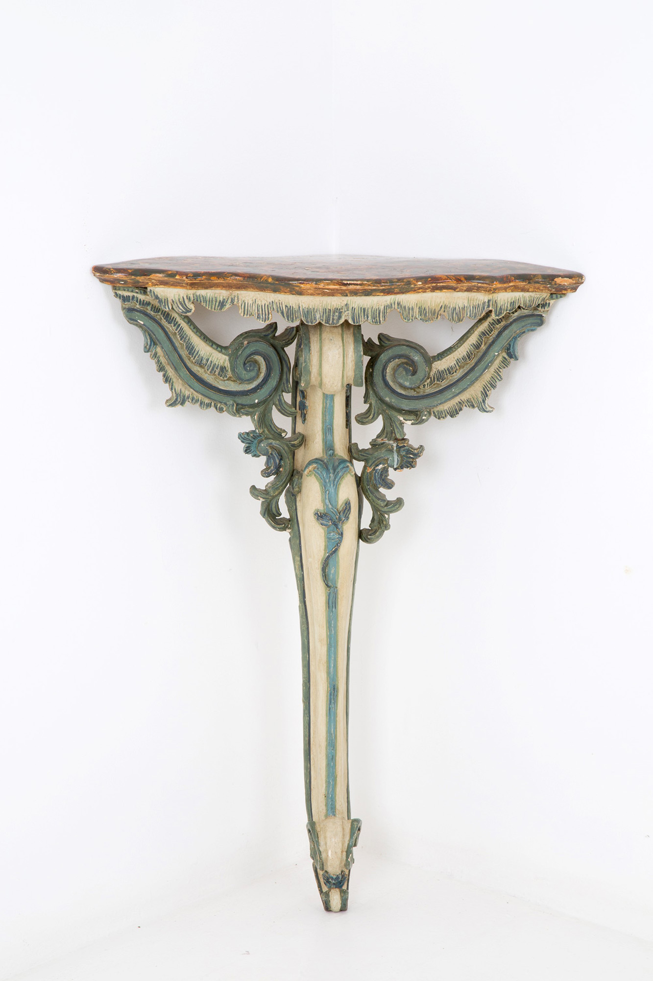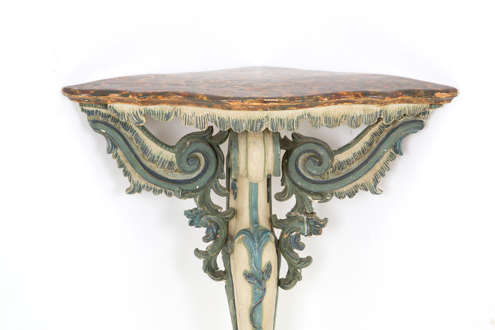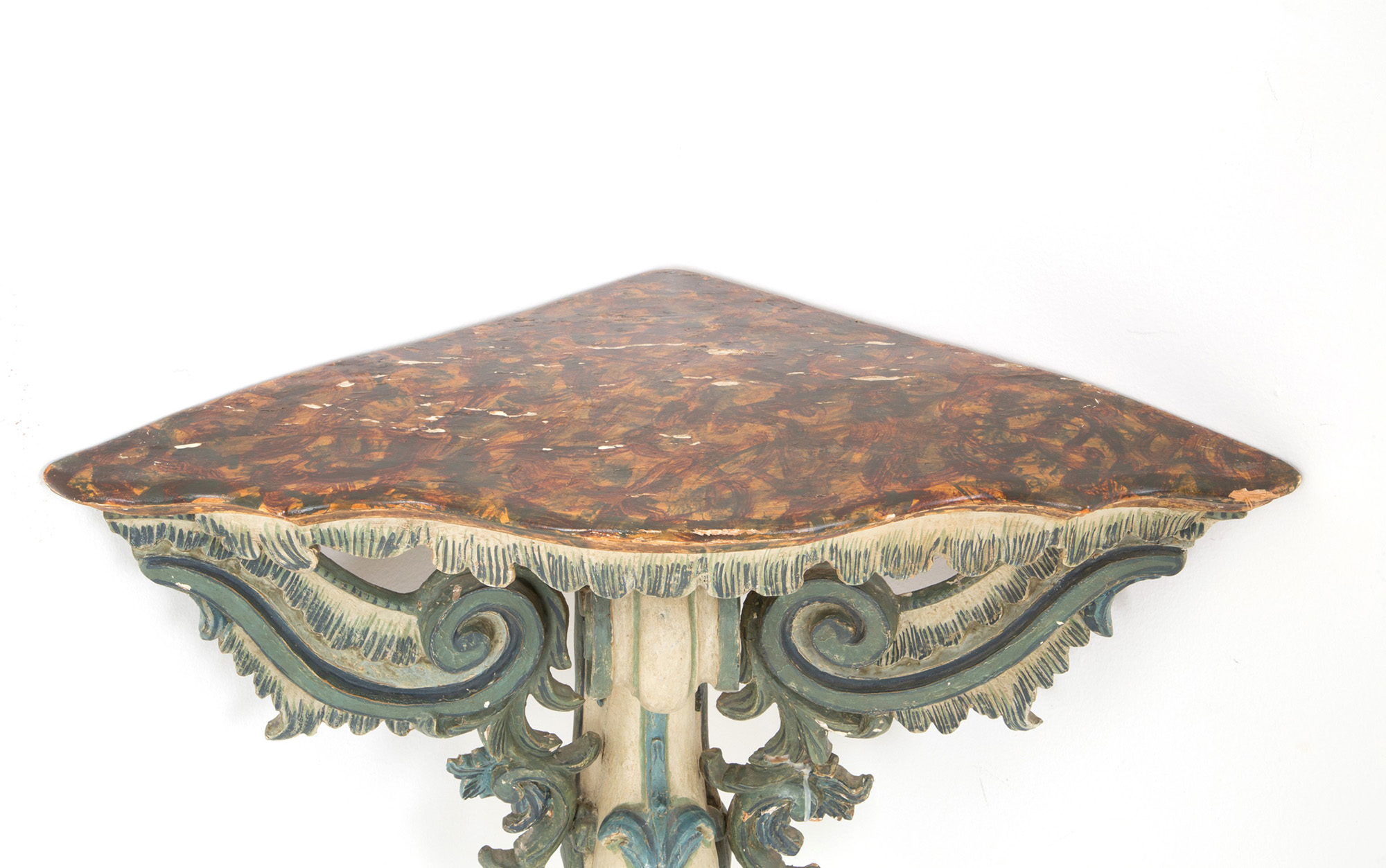 Three corner cabinets in lacquered wood with faux marble top. Liguria. Early 18th century. 93x66x37cm approx. Tre angoliere in legno laccato con piano in finto marmo. Liguria. Inizi XVIII secolo. 93x66x37 cm ca.