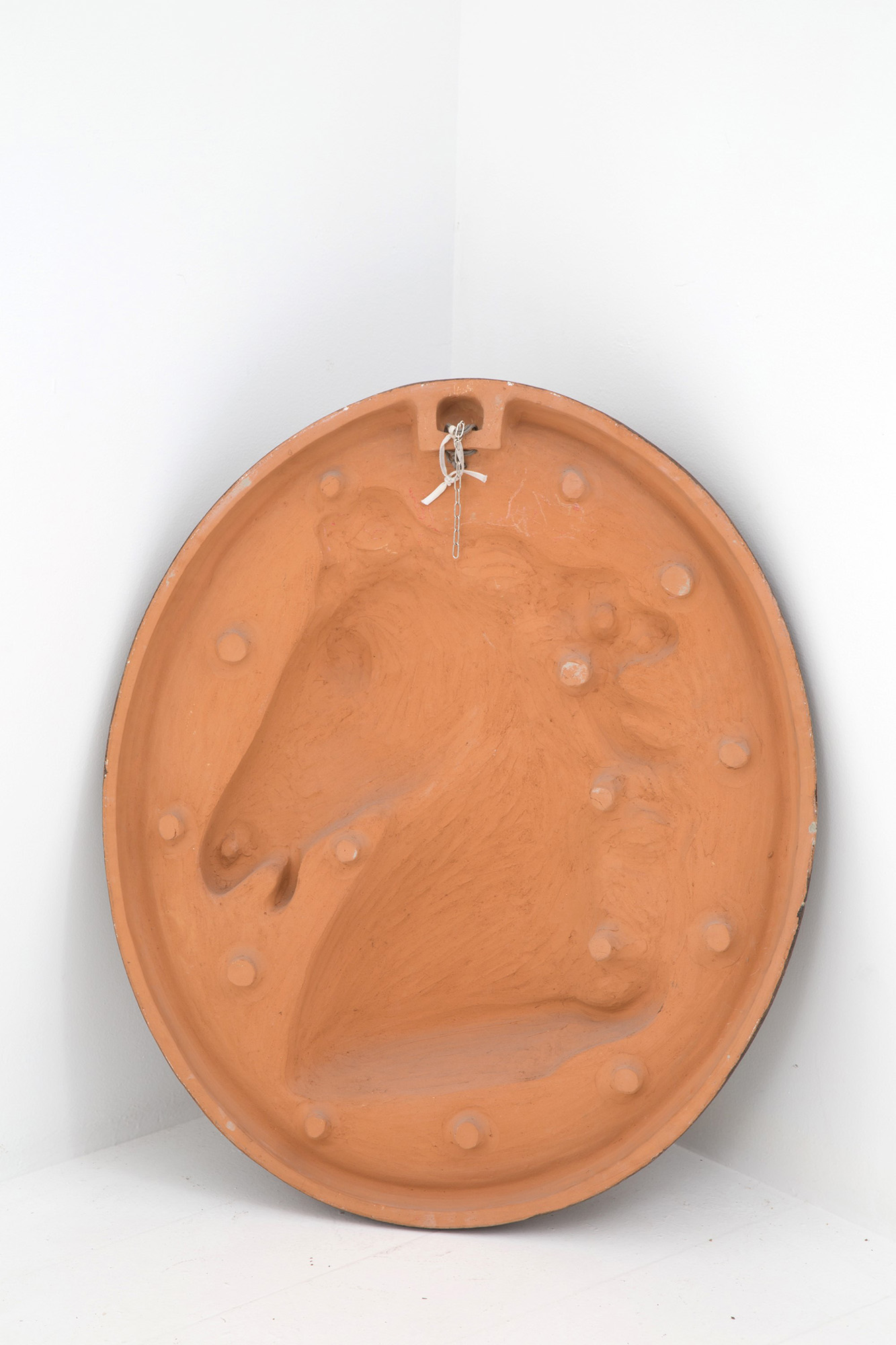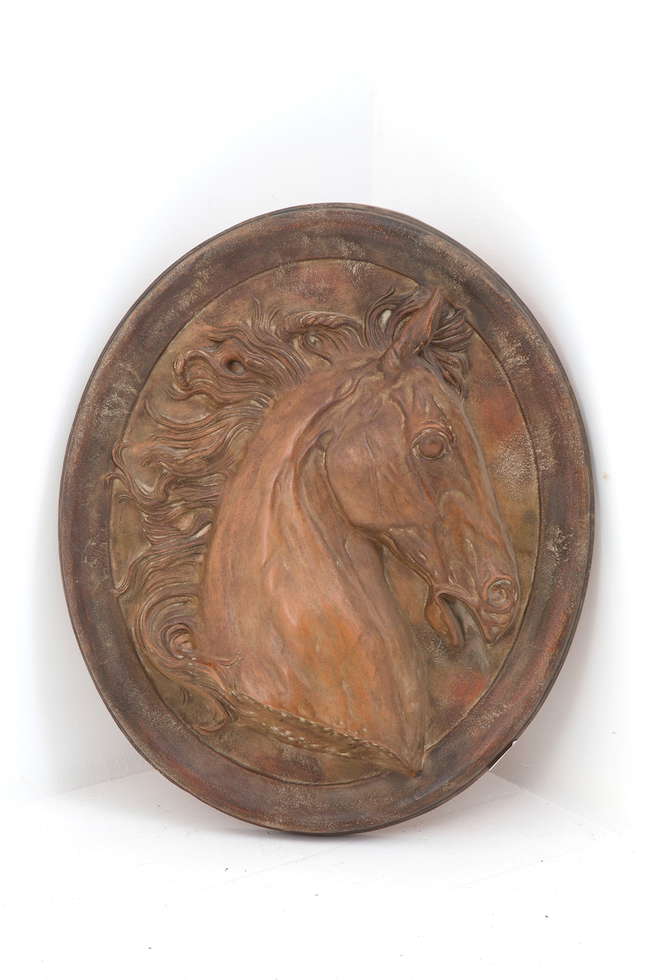 PAOLO MARIONI (XIX secolo). Large oval terracotta plaque depicting "HORSE HEAD". Signed at the bottom. 85x75x12cm approx. PAOLO MARIONI (XIX secolo). Grande placca ovale in terracotta raffigurante "TESTA DI CAVALLO". Firmata in basso. 85x75x12 cm ca.