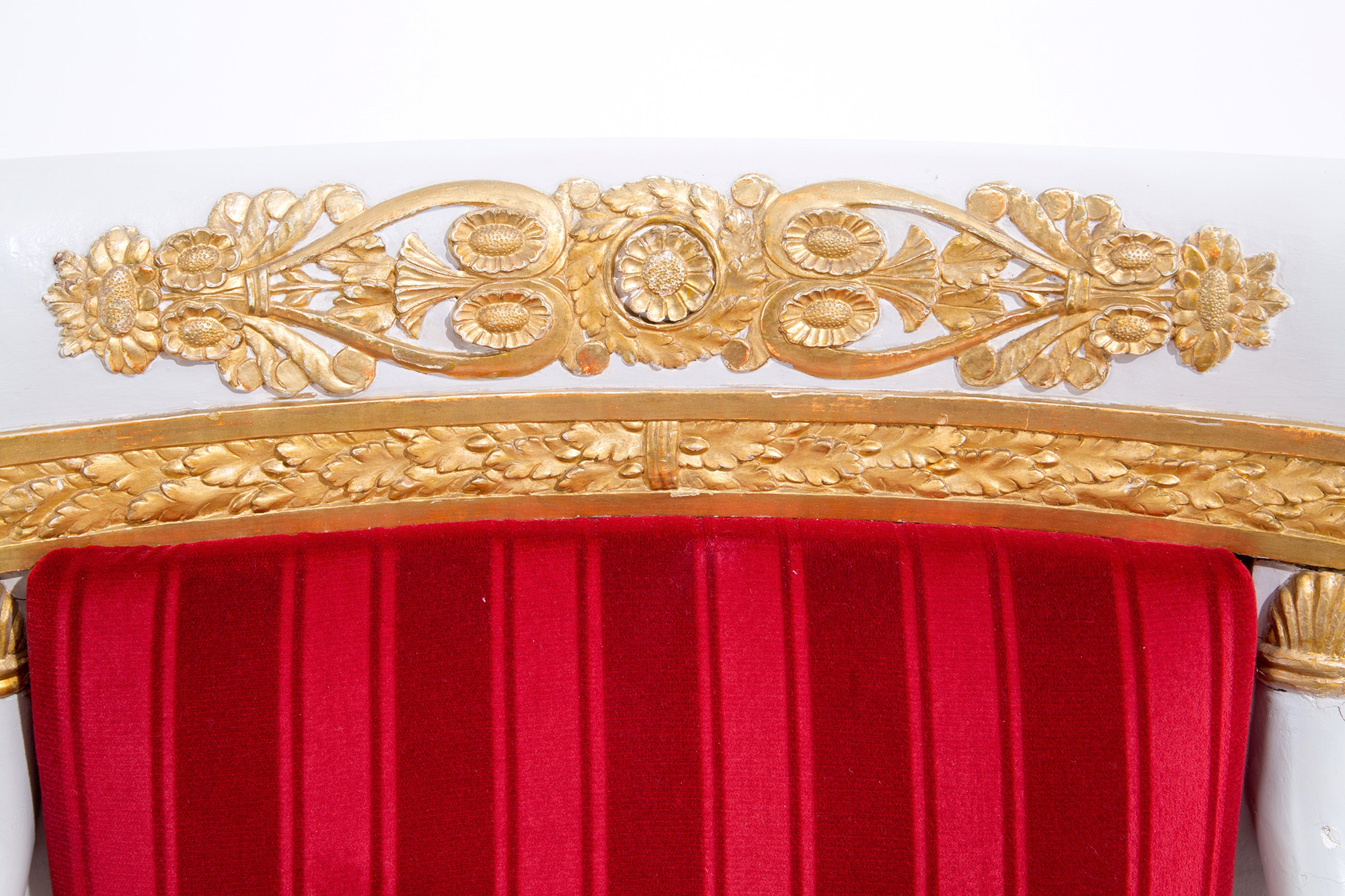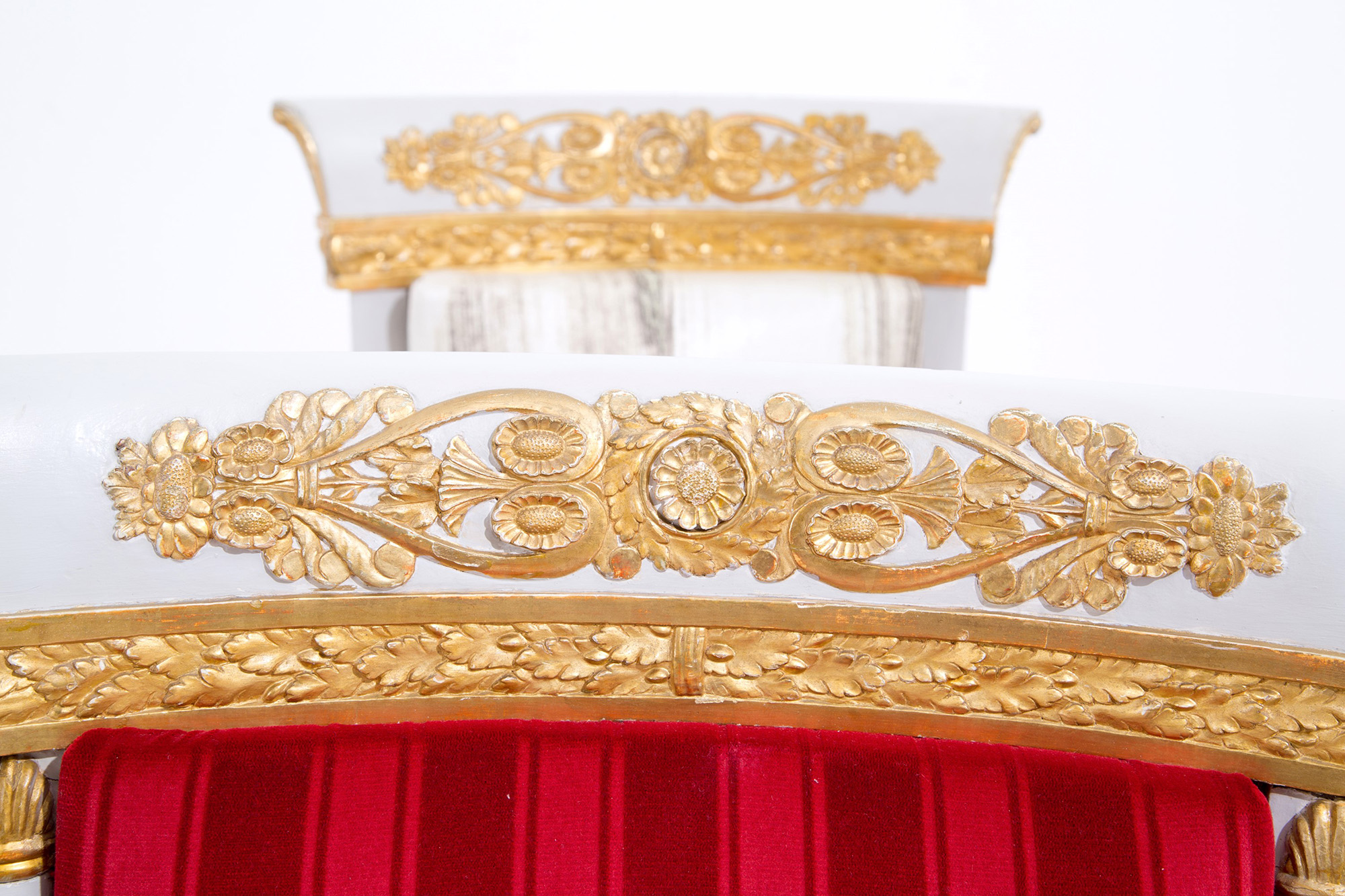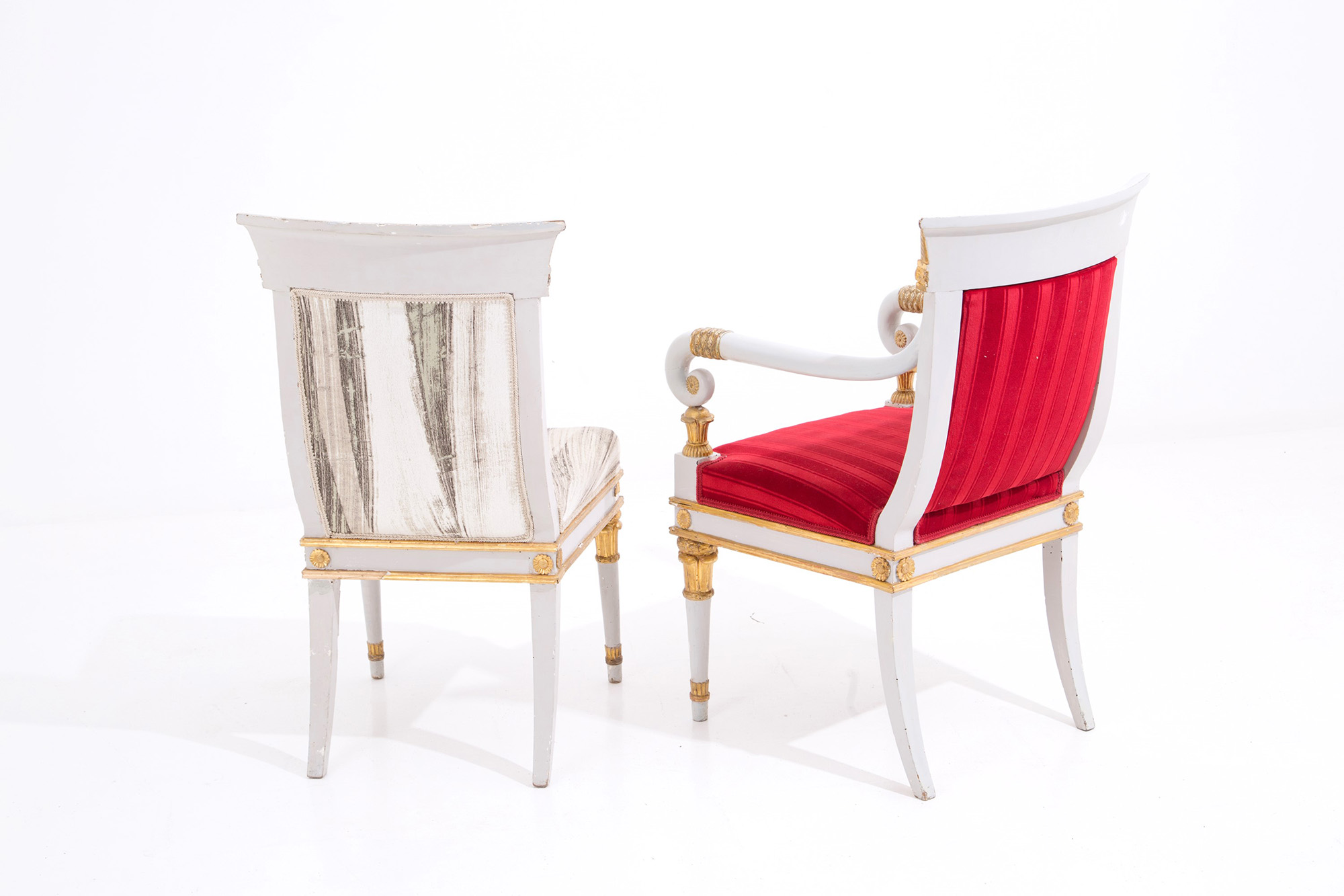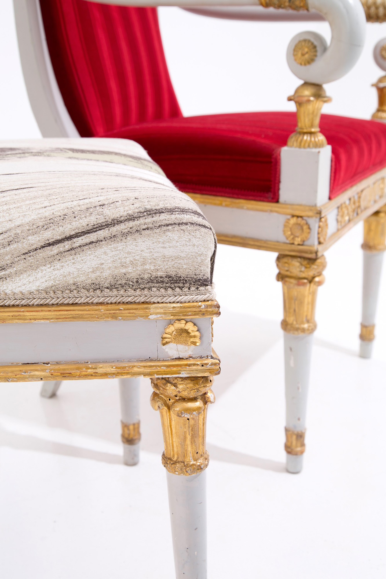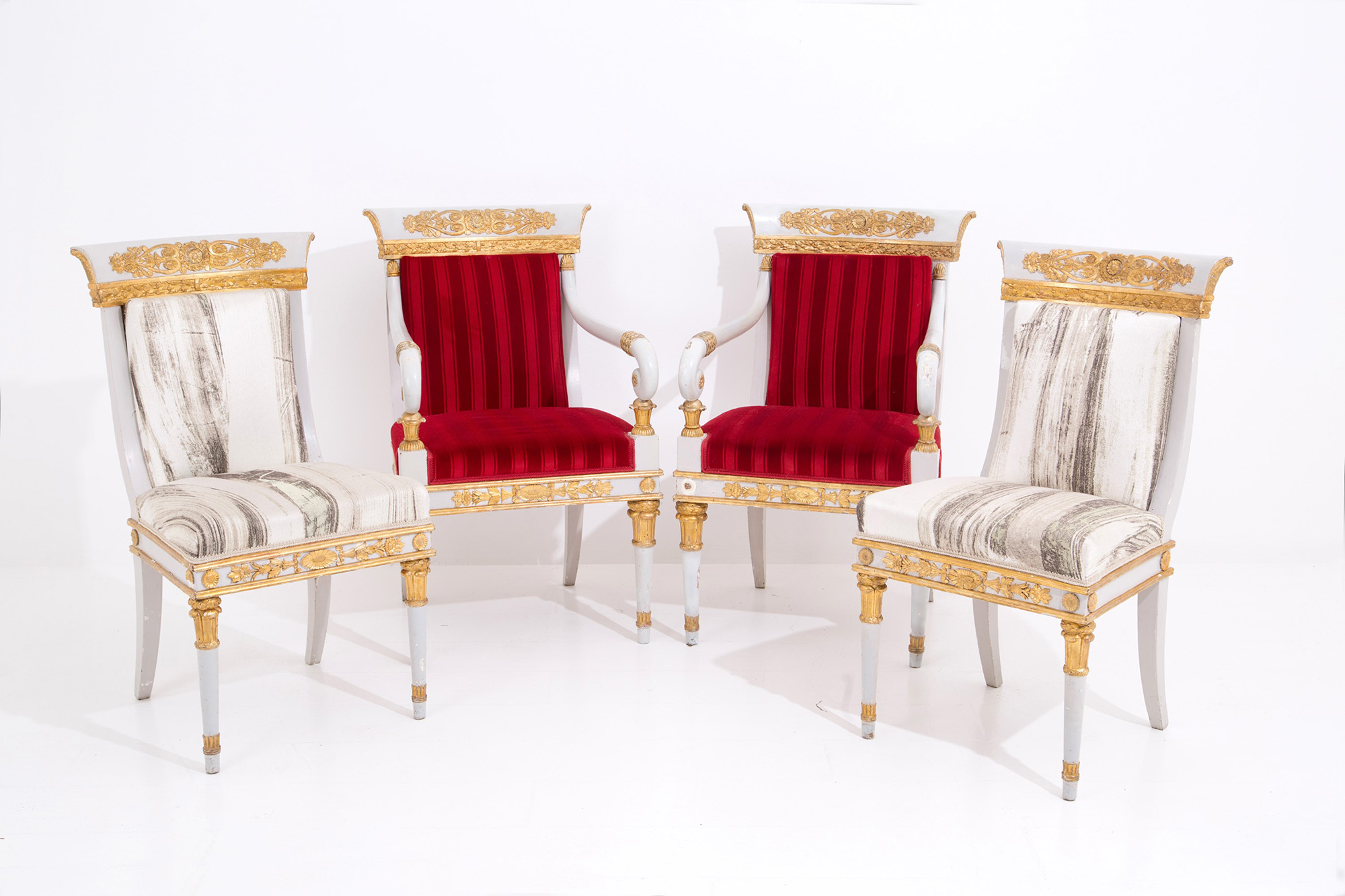 Chair measurements: approx. 91x50x50 cm. Coppia di poltrone e due sedie in legno finemente intagliato, laccato e dorato con sedute e schienali in stoffa. Periodo Direttorio. Difetti.