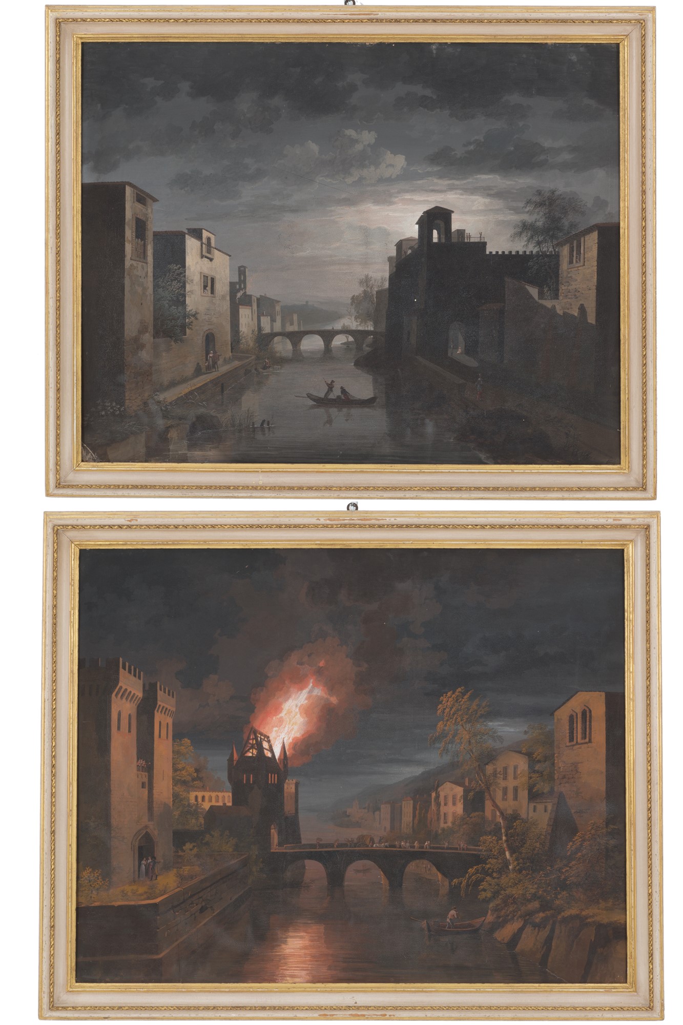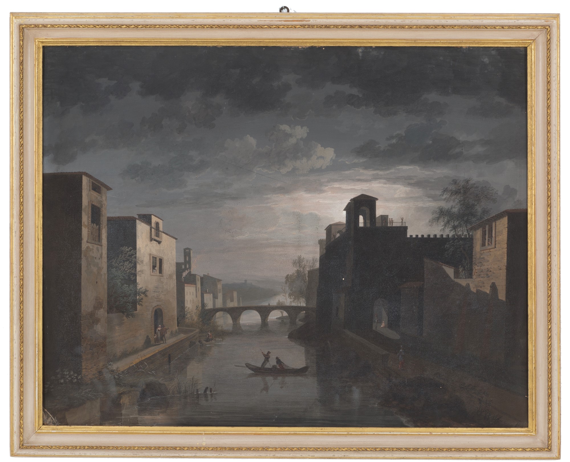 VENETIAN SCHOOL OF THE END OF THE 19TH CENTURY. Pair of oil paintings on paper applied on cardboard depicting "NIGHT RIVER CHANNELS". In frame. 77x97cm approx. SCUOLA VENETA DI FINE XIX SECOLO. Coppia di dipinti olio su carta applicata su cartone raffiguranti "CANALI NOTTURNI". In cornice. 77x97 cm ca.