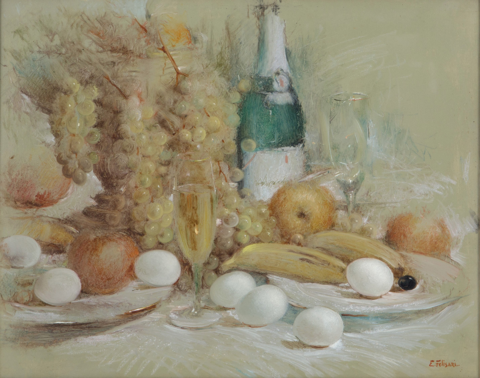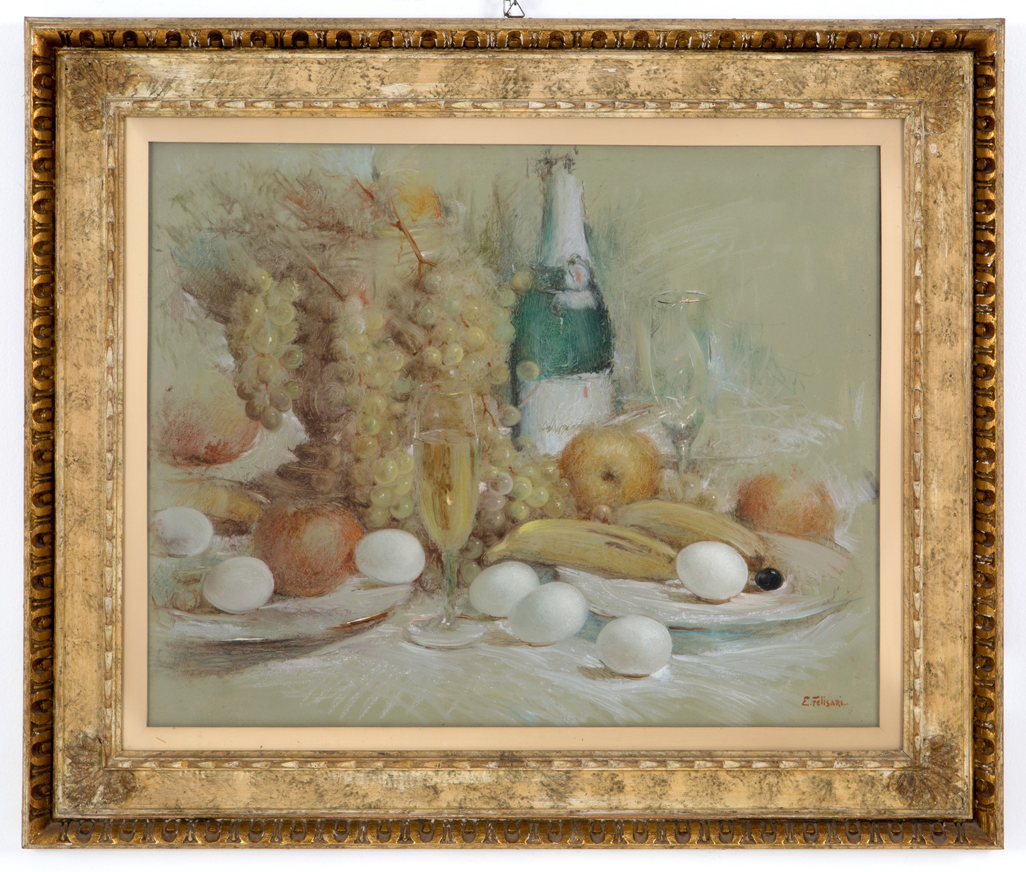 ENRICO FELISARI (Castelleone 1897-1981). Oil painting on canvas depicting "STILL LIFE". Signed lower right. In frame. 60x74cm approx. ENRICO FELISARI (Castelleone 1897-1981). Dipinto olio su tela raffigurante "NATURA MORTA". Firmato in basso a destra. In cornice. 60x74 cm ca.