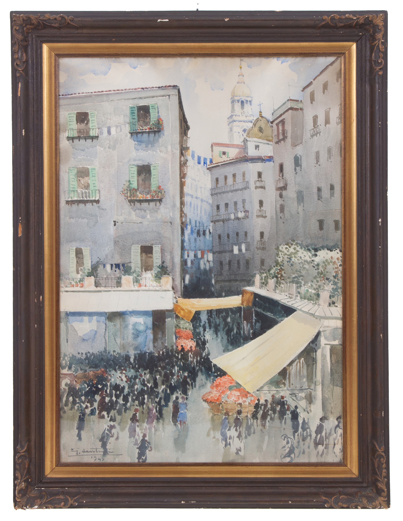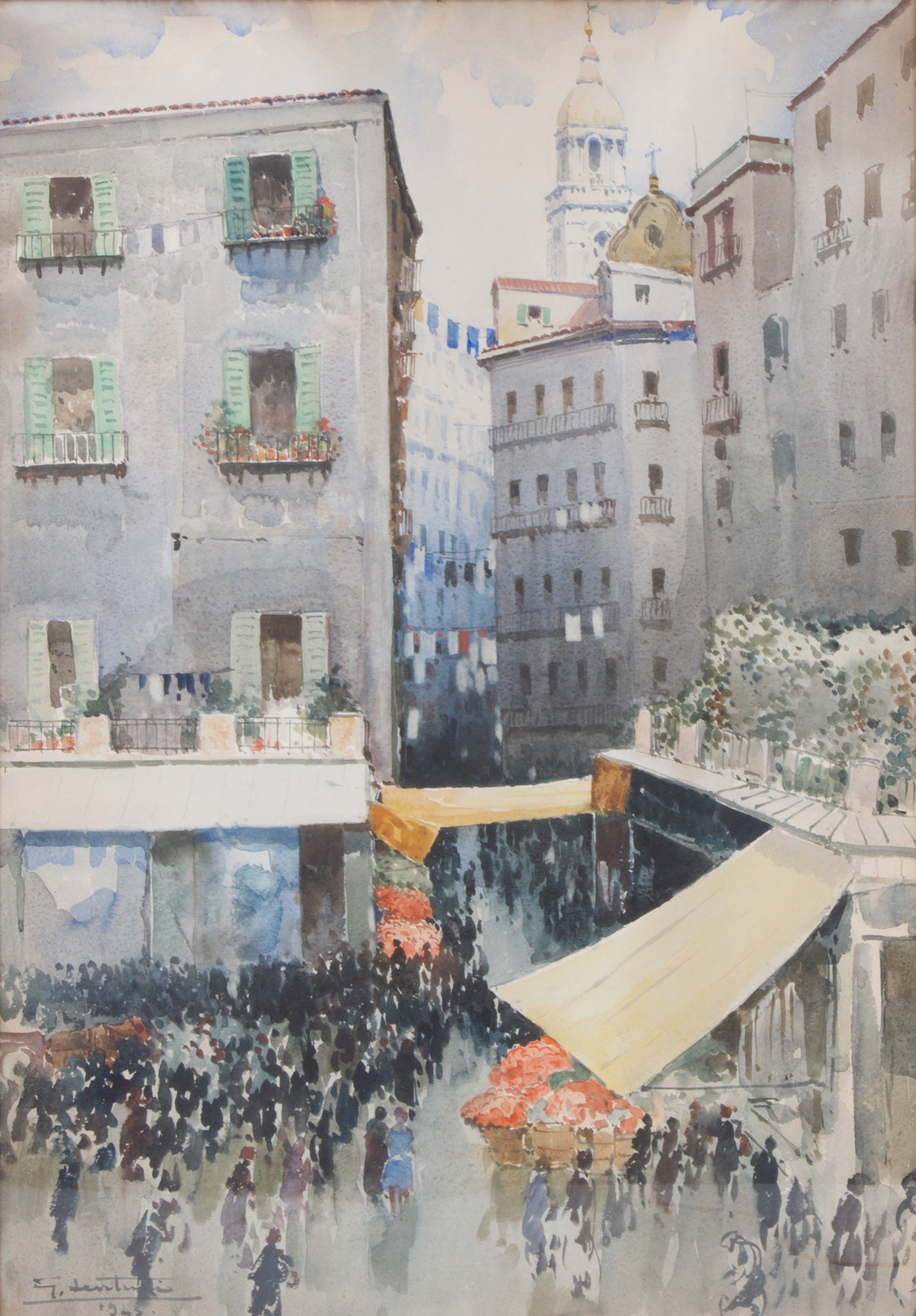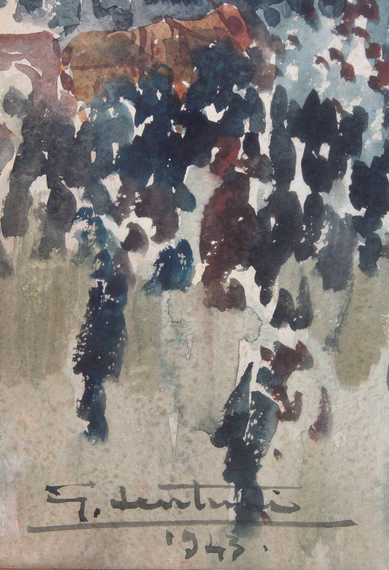 GIOVANNI LENTINI (Palermo 1882-Milan 1955). Watercolor on paper depicting "CROWD IN THE SQUARE". Signed and dated 1943 lower left. In frame. 96x67cm approx. GIOVANNI LENTINI (Palermo 1882-Milano 1955). Acquarello su carta raffigurante "FOLLA IN PIAZZA". Firmato e datato 1943 in basso a sinistra. In cornice. 96x67 cm ca.