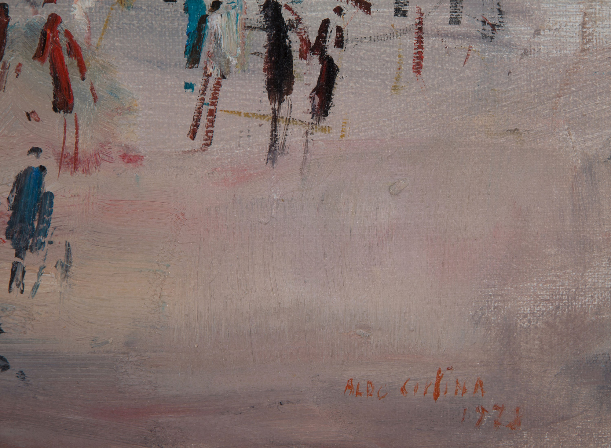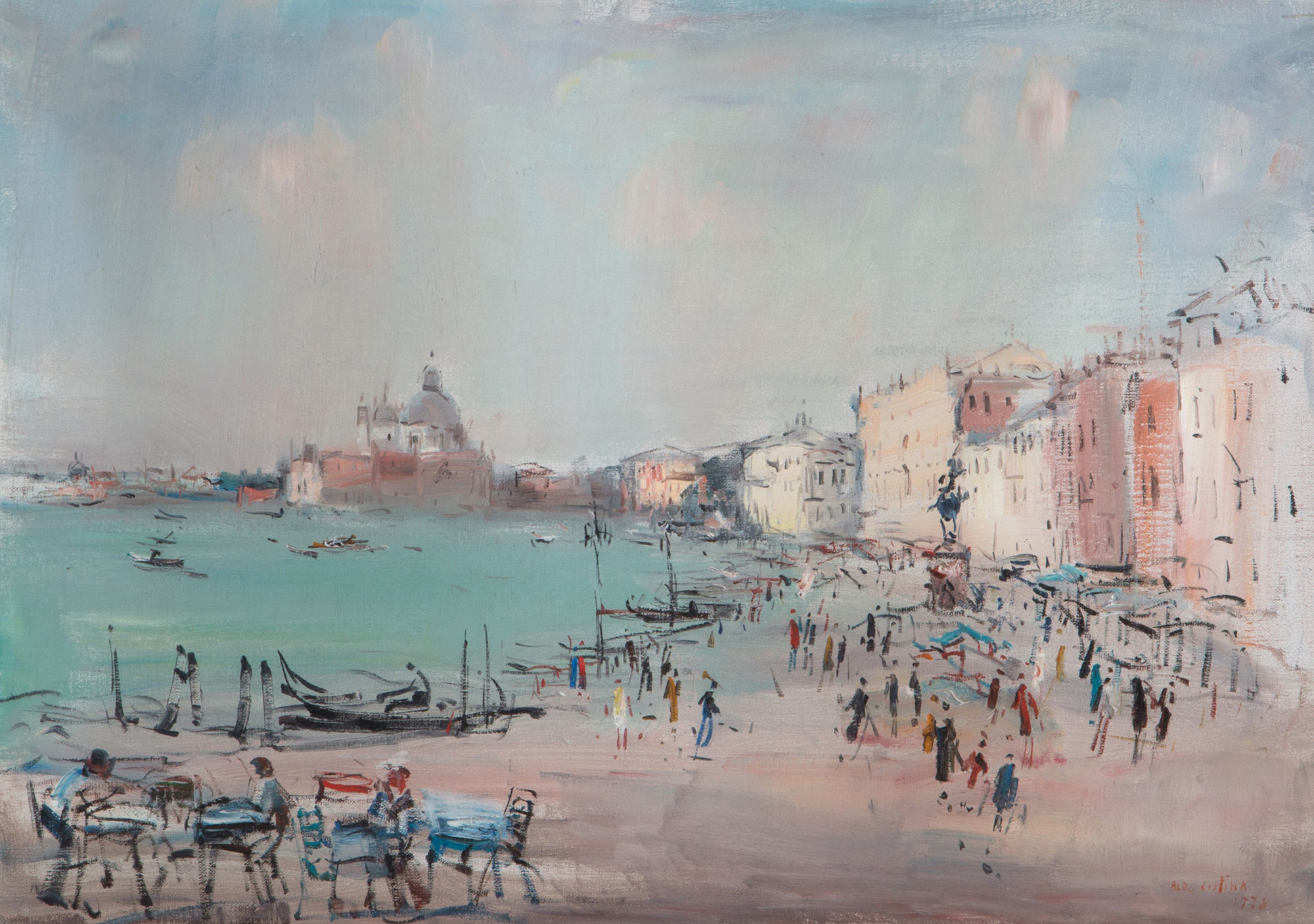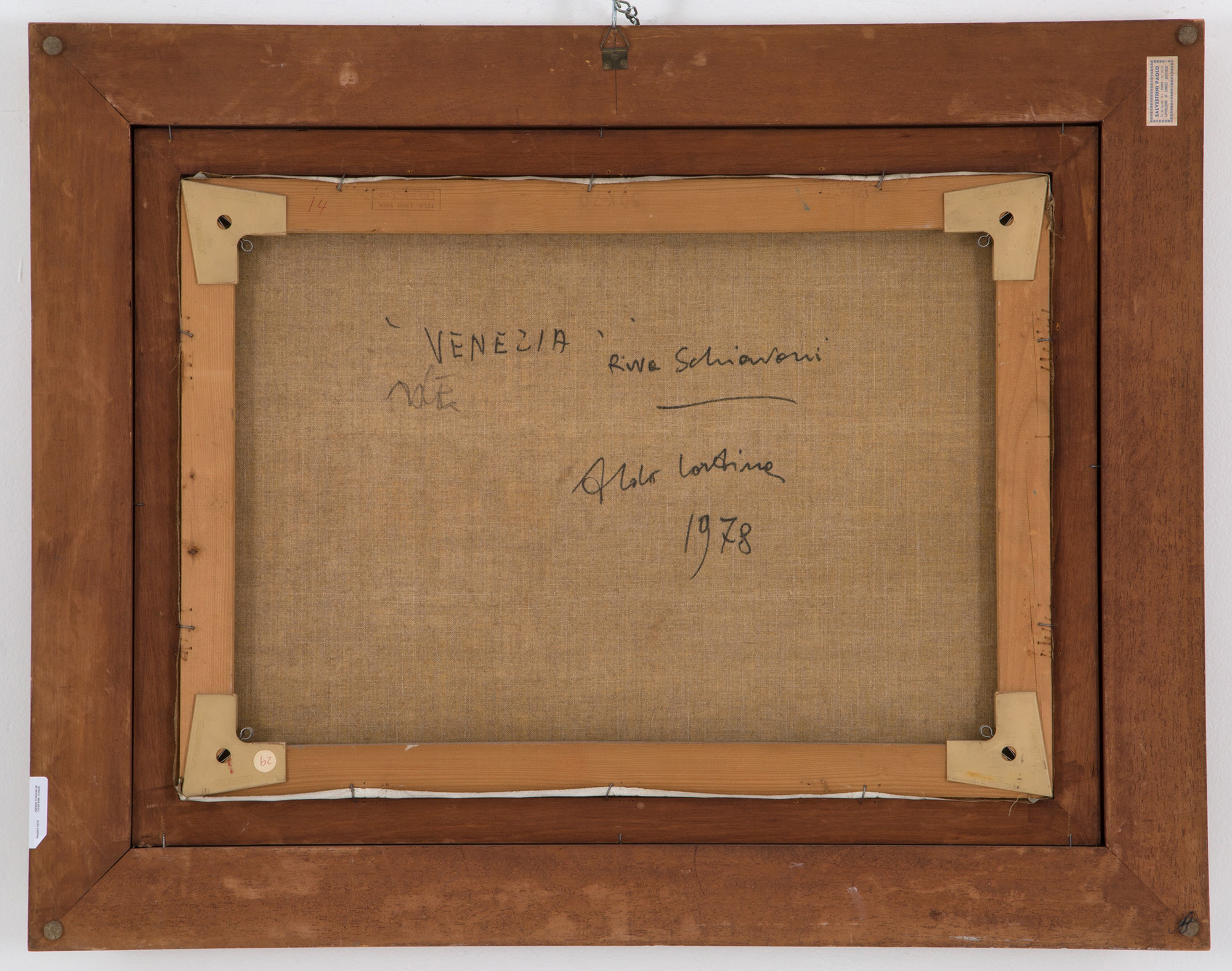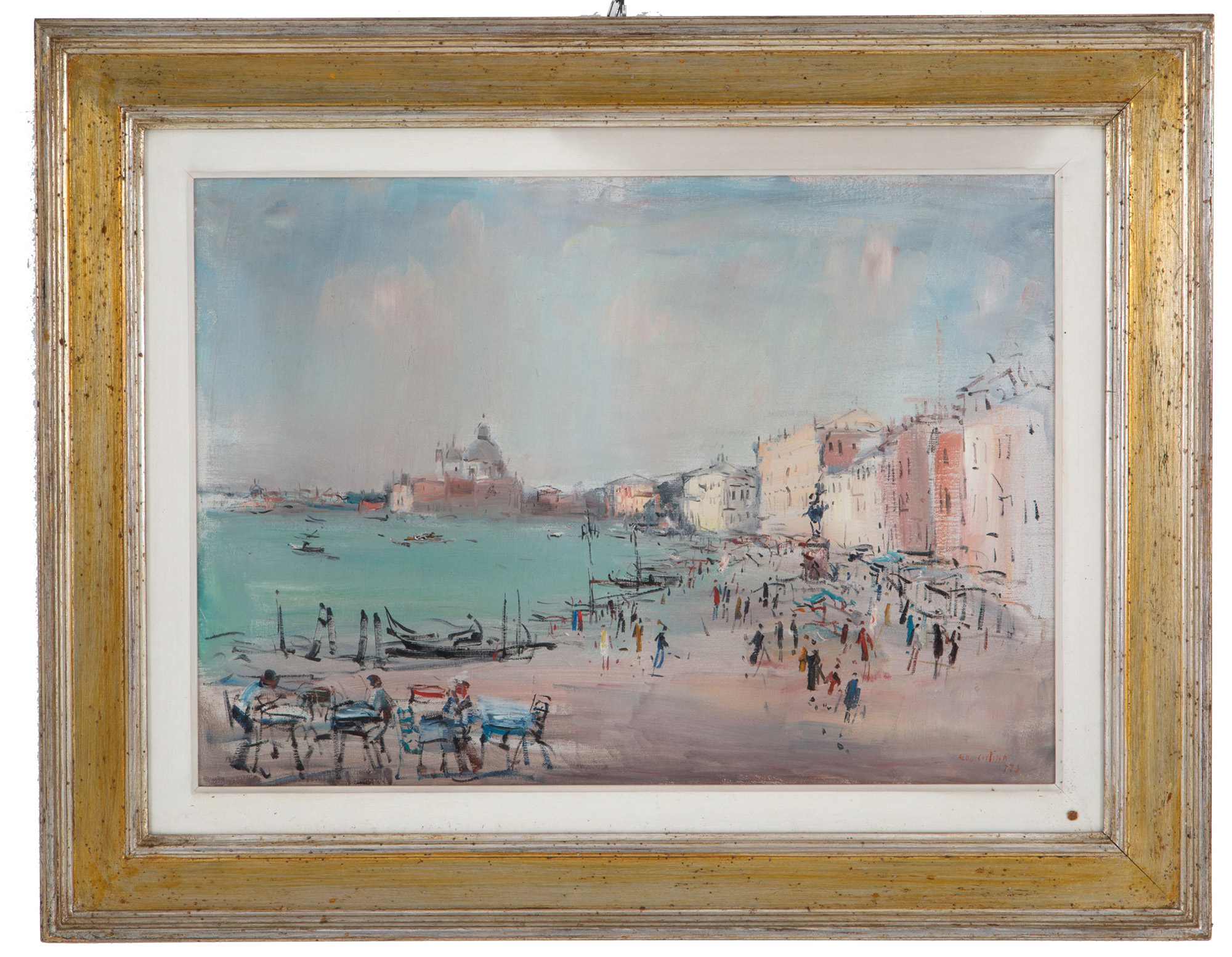 ALDO CORTINA (Belluno 1921-Milan 1988). Oil painting on canvas depicting "RIVA DEGLI SCHIAVONI IN VENICE". Signed and dated 1958 lower right and on the reverse. 50x70cm approx. ALDO CORTINA (Belluno 1921-Milano 1988). Dipinto olio su tela raffigurante "RIVA DEGLI SCHIAVONI A VENEZIA". Firmato e datato 1958 in basso a destra e sul retro. 50x70 cm ca.