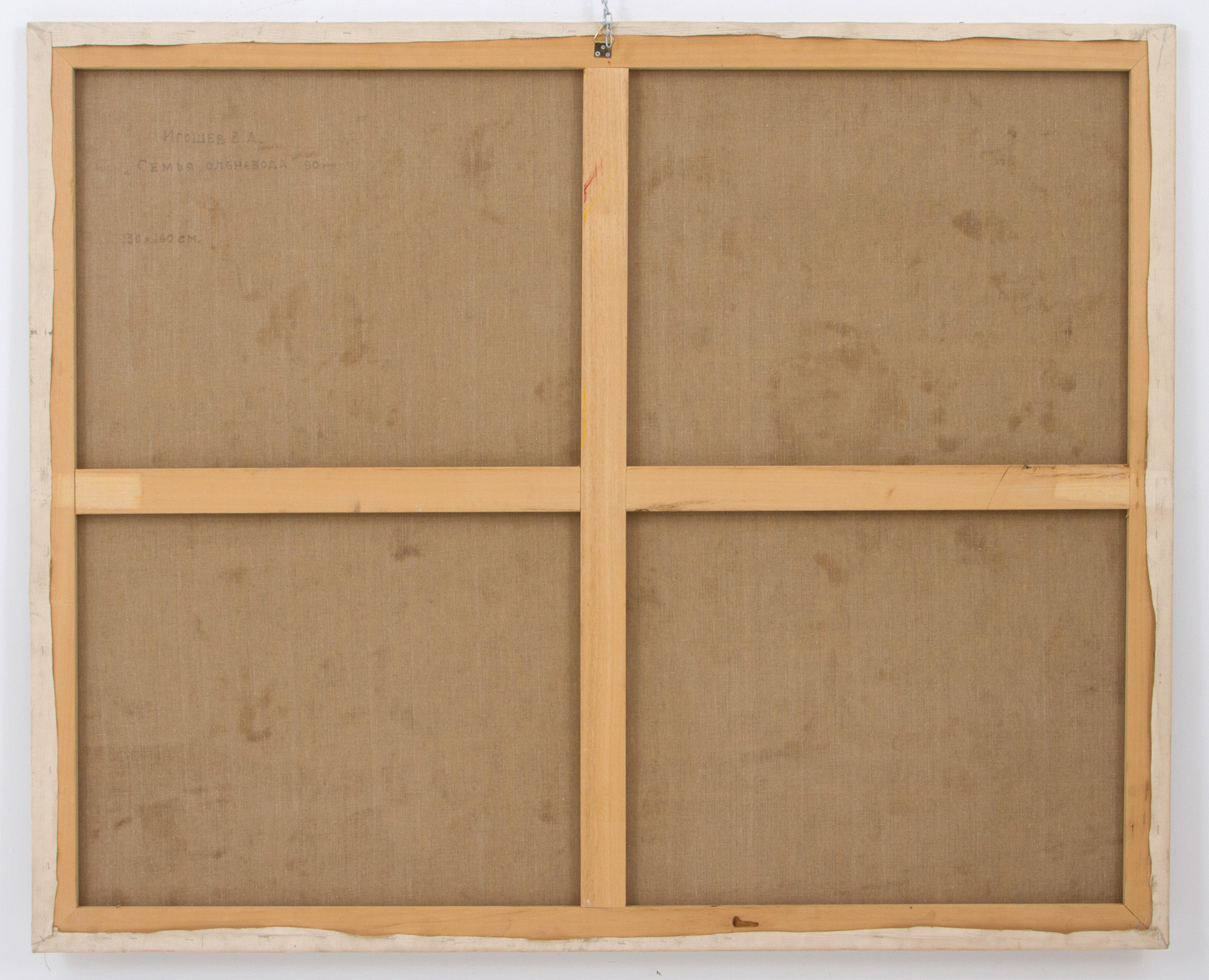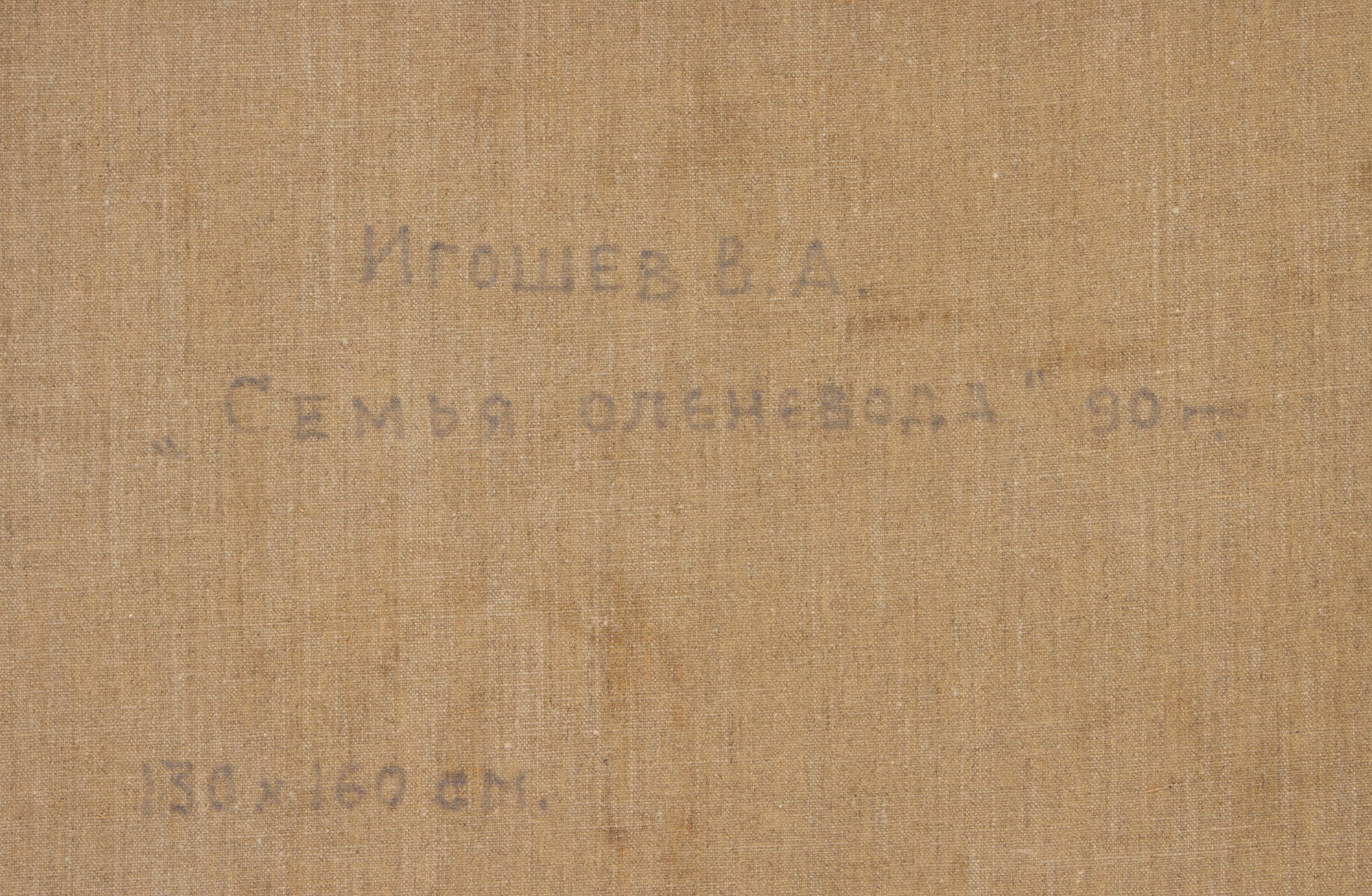 VLADIMIR ALEXANDROVICH IGOSHEV (Bashkiria 1921-Moscow 2007). Oil painting on canvas titled "FAMILY OF REINDEER SHEPHERDS". Signed lower left. Dated 1990 on the reverse. 130x160cm approx. VLADIMIR ALEXANDROVICH IGOSHEV (Bashkiria 1921-Moscow 2007). Dipinto olio su tela intitolato "FAMIGLIA DI PASTORI DI RENNE". Firmato in basso a sinistra. Datato 1990 sul retro. 130x160 cm ca.