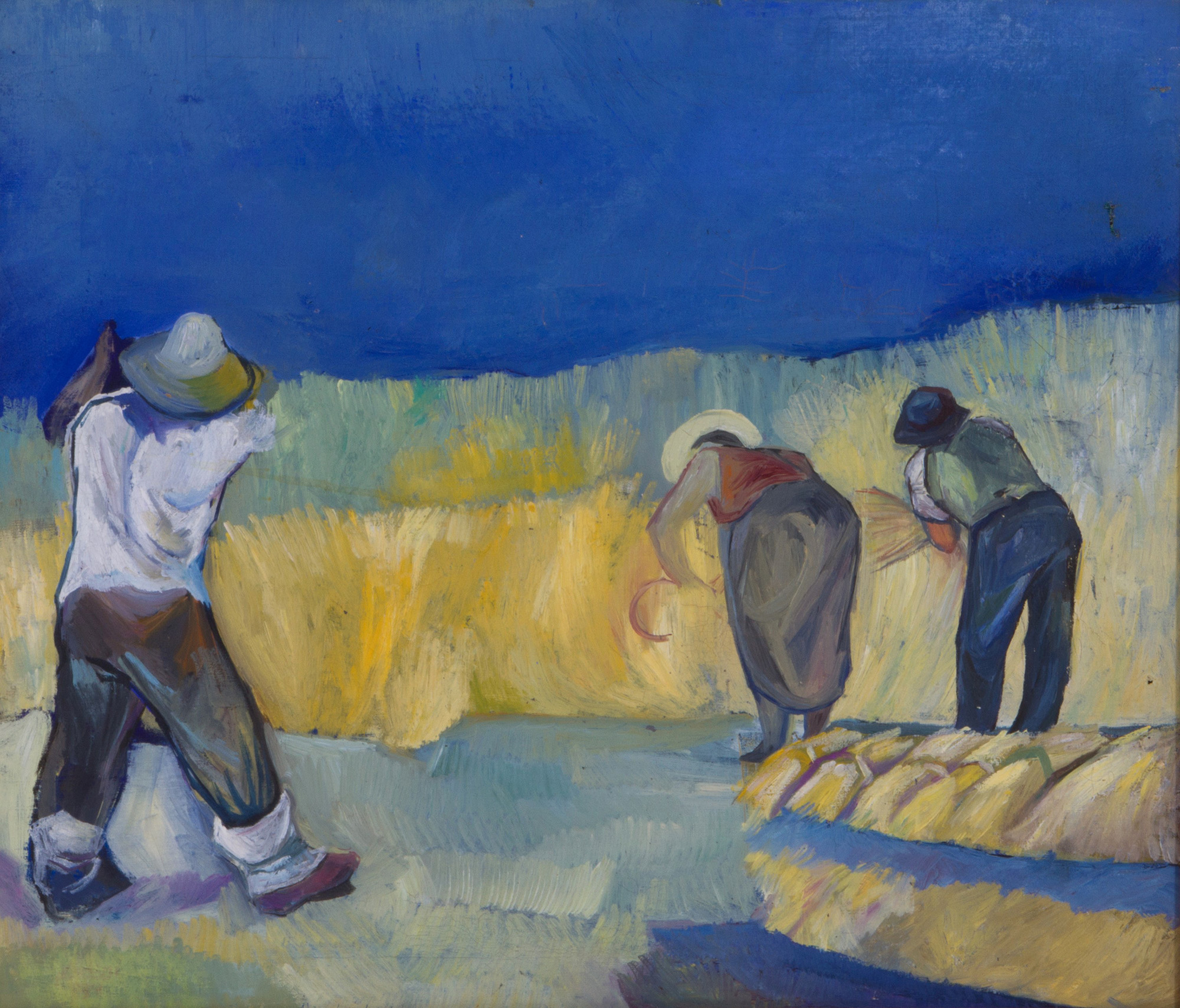 DEMOFILO FIDANI (Rome 1914-1994). Oil painting on canvas depicting "THE REAPER". 1955. With cartouche on the back. In frame. Defects. 60x70cm approx. DEMOFILO FIDANI (Roma 1914-1994). Dipinto olio su tela raffigurante "I MIETITORI". 1955. Con cartiglio sul retro. In cornice. Difetti. 60x70 cm ca.
