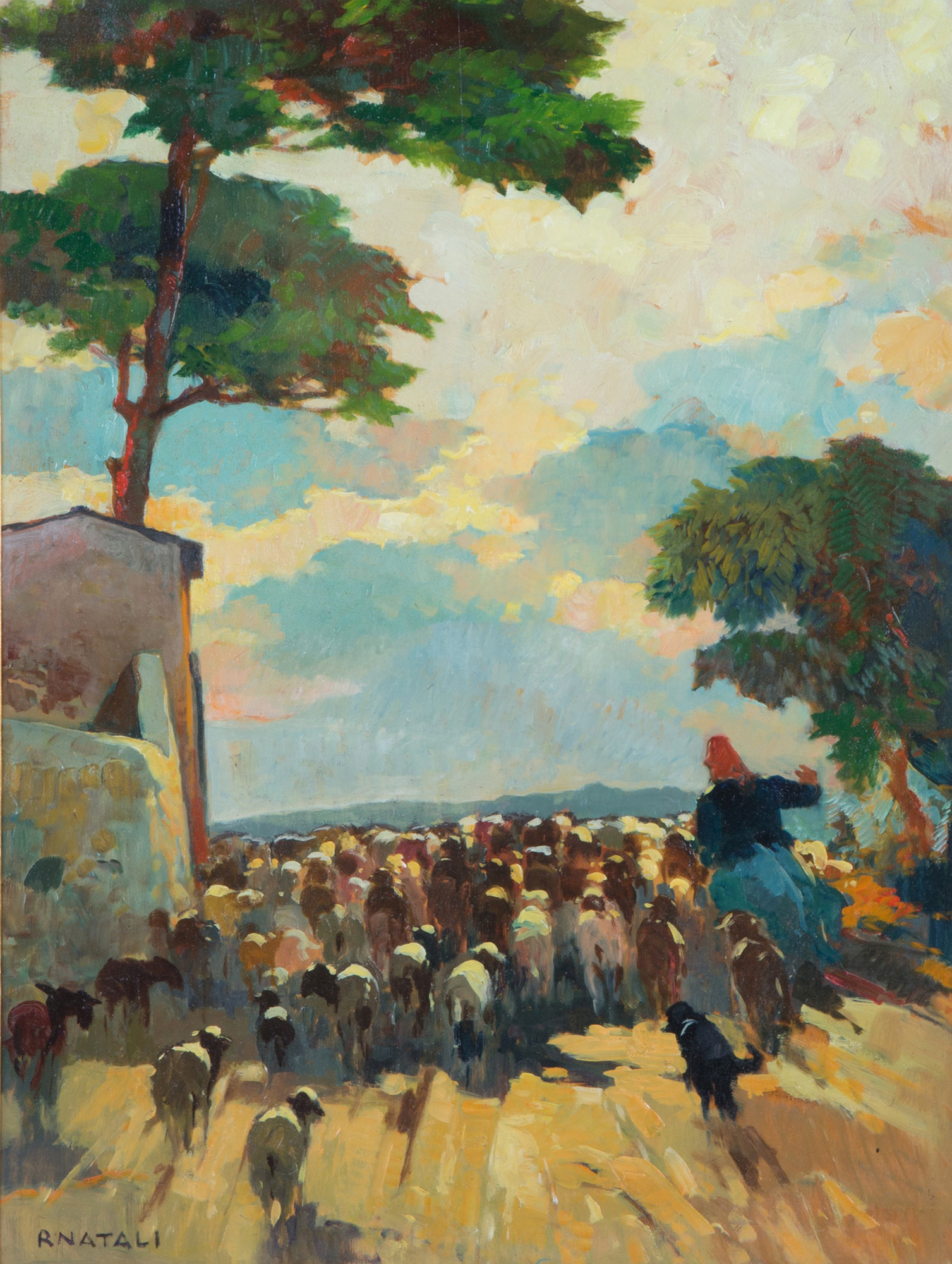 RENATO NATALI (Livorno 1883-1979). Oil painting on plywood depicting "LANDSCAPE WITH SHEPHERDS AND SHEEPS". Signed lower left. In frame. 79x60cm approx. RENATO NATALI (Livorno 1883-1979). Dipinto olio su compensato raffigurante "PAESAGGIO CON PASTORELLA E PECORE". Firmato in basso a sinistra. In cornice. 79x60 cm ca.