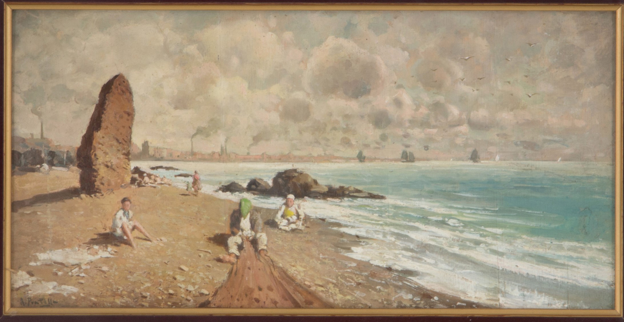 ATTILIO PRATELLA (Lugo 1856-Naples 1949). Oil painting on plywood depicting "BEACH WITH CHARACTERS". Signed lower left. In frame. 20x39.5cm approx. ATTILIO PRATELLA (Lugo 1856-Napoli 1949). Dipinto olio su compensato raffigurante "SPIAGGIA CON PERSONAGGI". Firmato in basso a sinistra. In cornice. 20x39,5 cm ca.