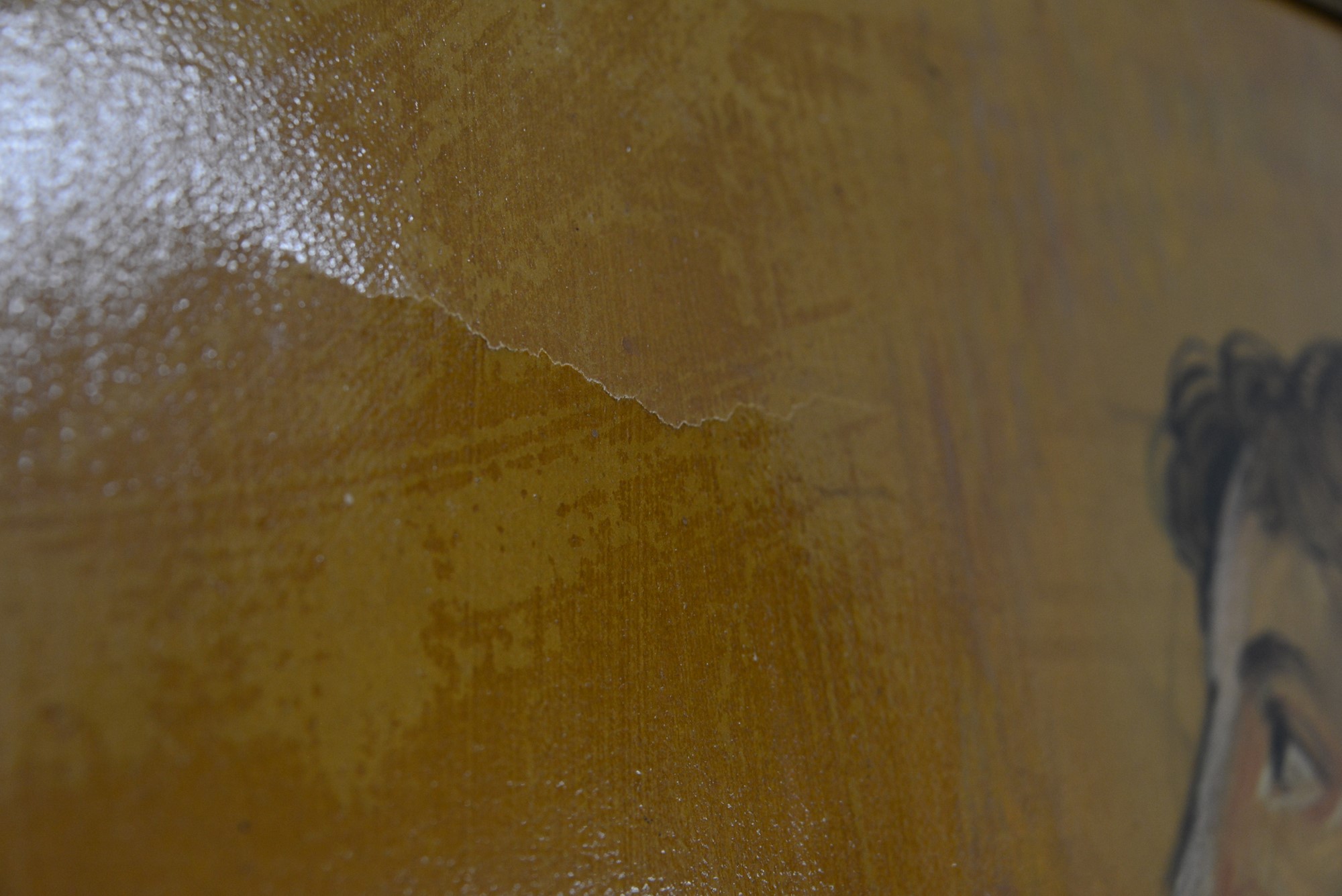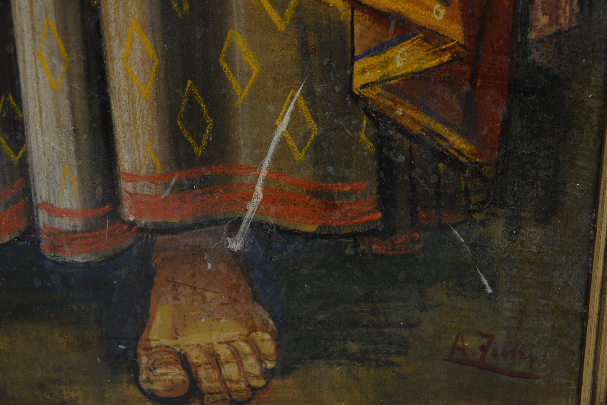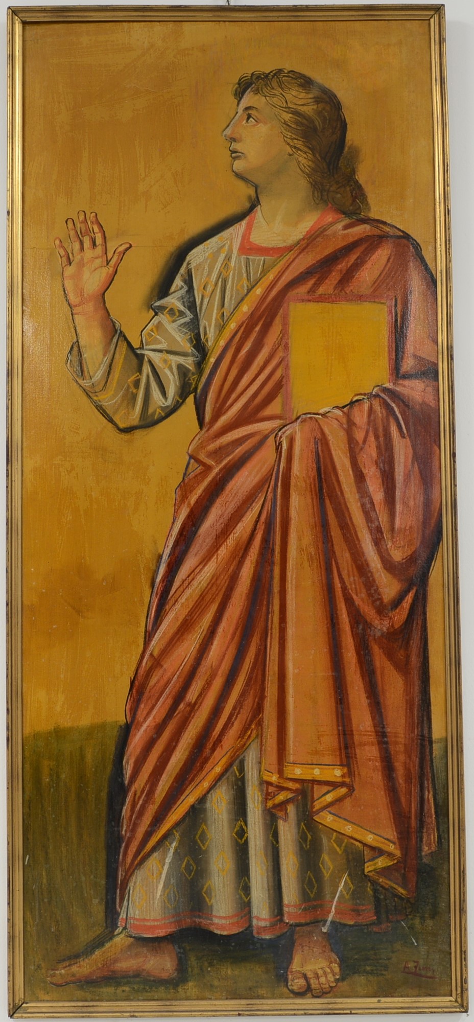 ACHILLE FUNI (Ferrara 1890-Appiano Gentile 1972). Oil painting on cardboard applied on canvas entitled ''PERSONAGGIO TOGATO''. 1950 approx. Signed lower right. Framed. Defects. Published in Nicoletta Colombo (ed.), Catalog raisonné of paintings and cartoons, vol. II, Leonardo Arte, Milan 1996, p. 161. 187x80cm. approx. ACHILLE FUNI (Ferrara 1890-Appiano Gentile 1972). Dipinto olio su cartone applicato su tela intitolato ''PERSONAGGIO TOGATO''. 1950 ca. Firmato in basso a destra. In cornice. Difetti. Pubblicato in Nicoletta Colombo (a cura di), Catalogo ragionato dei dipinti e dei cartoni, vol. II, Leonardo Arte, Milano 1996, pag. 161. 187x80 cm. ca.