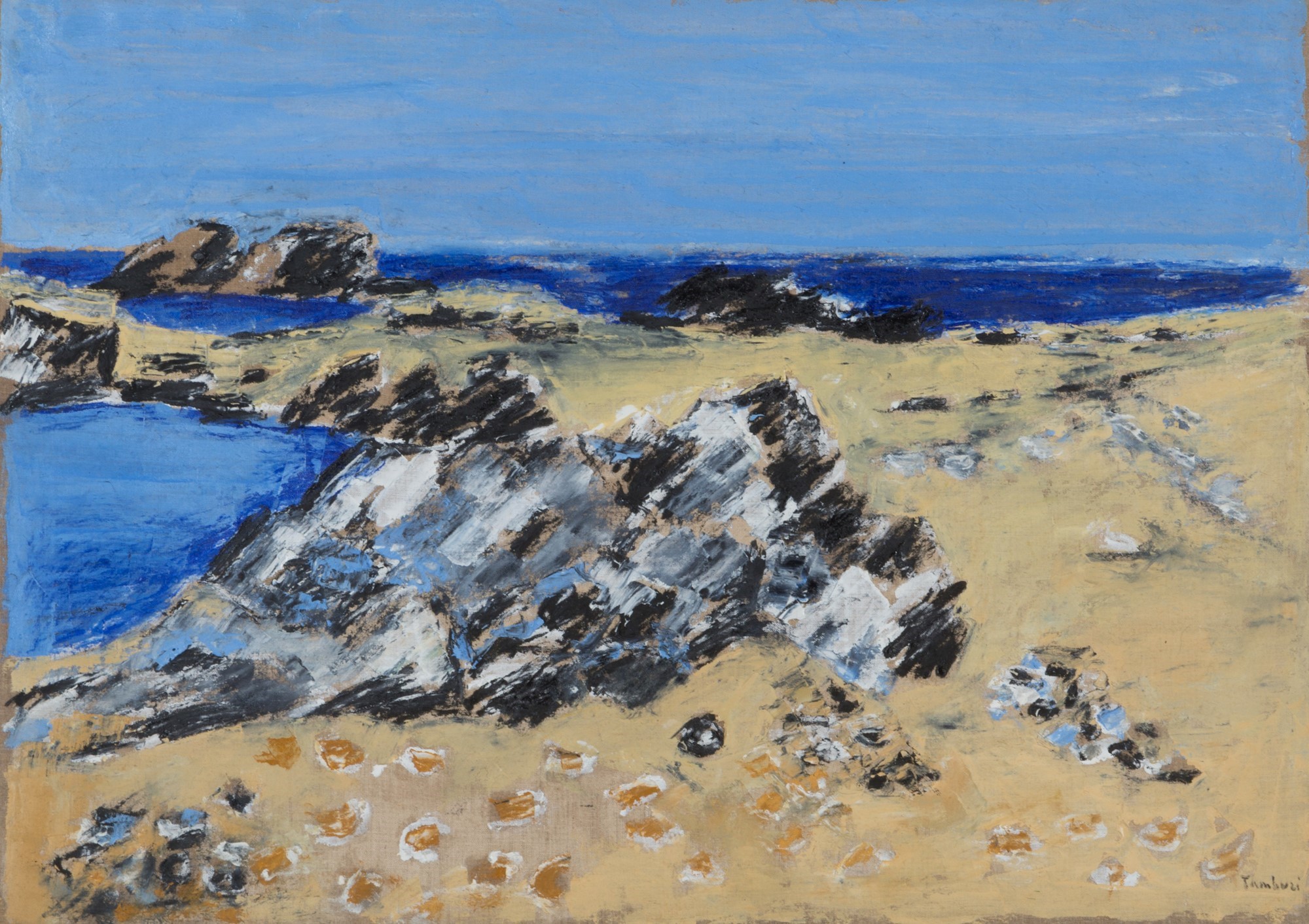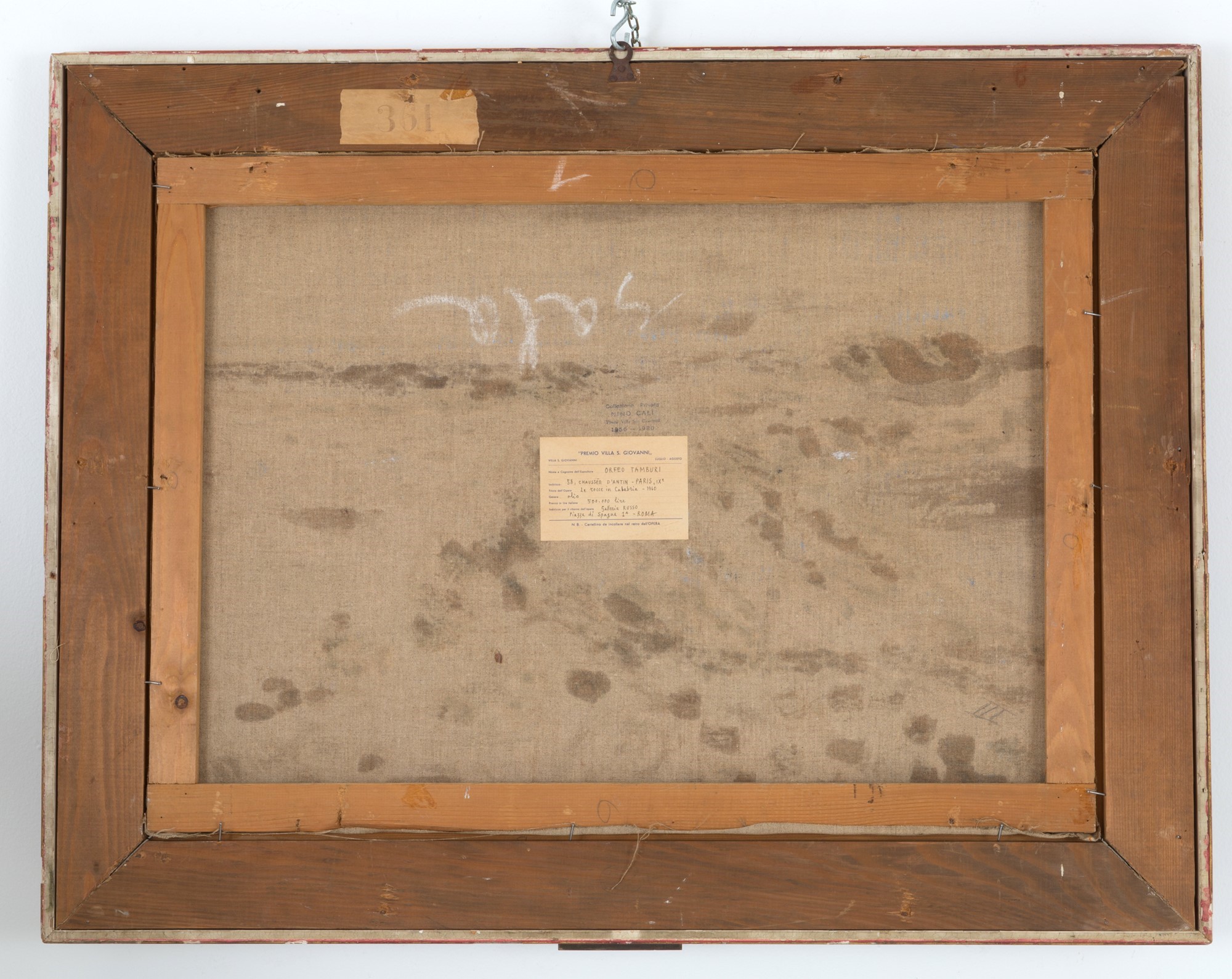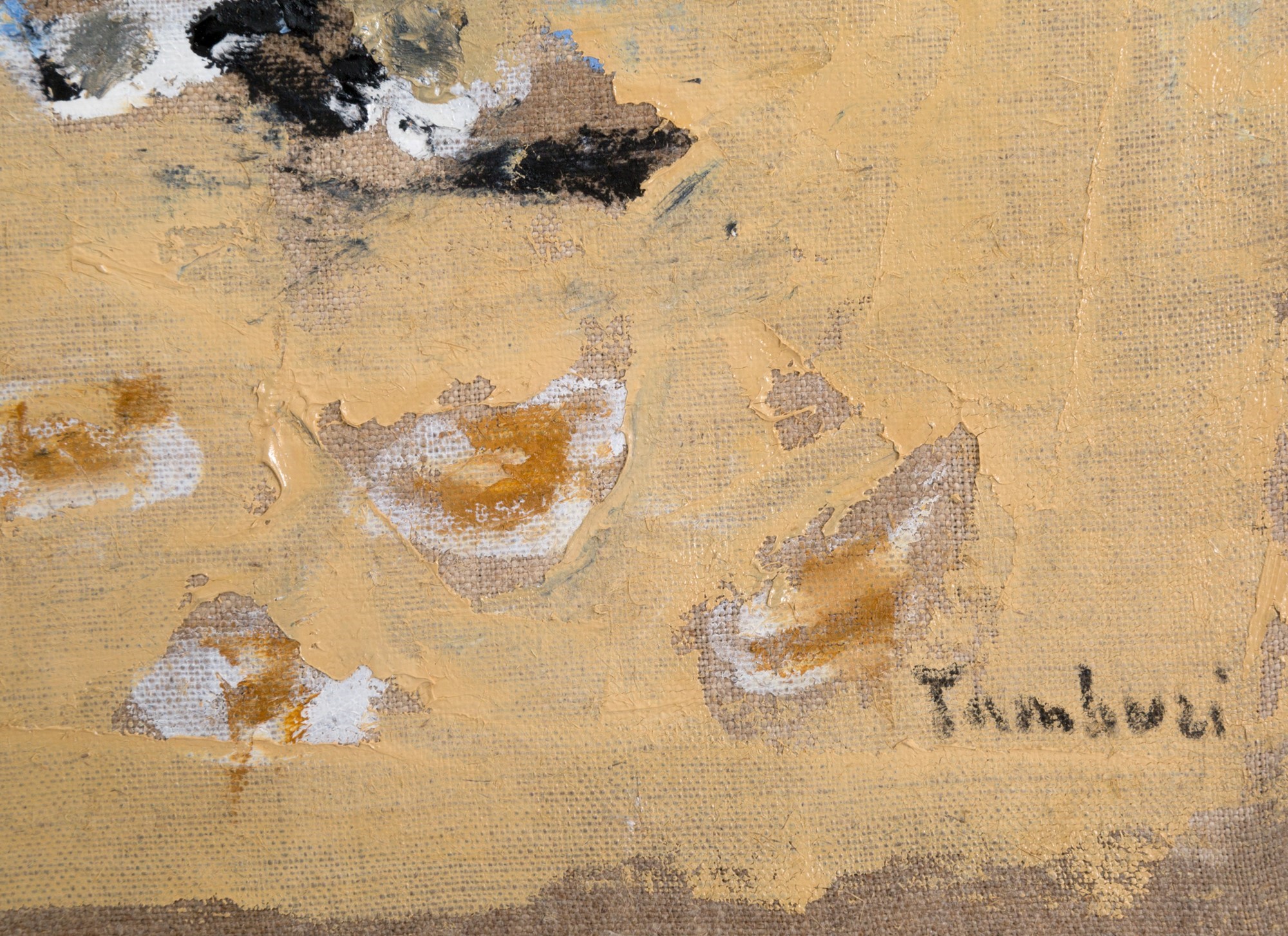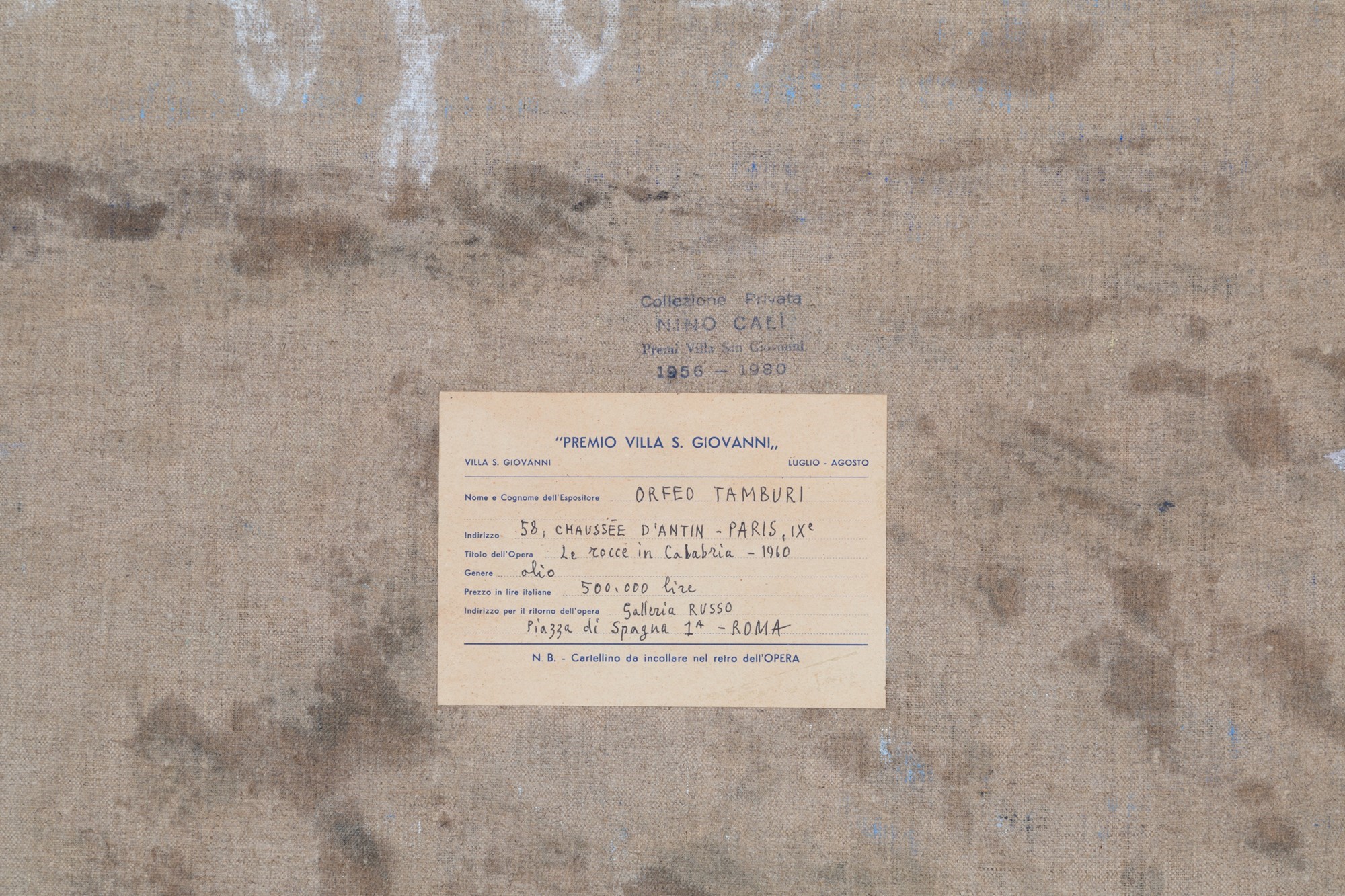 TAMBURI ORFEO (Jesi 1910-Paris1994). Oil painting on canvas entitled ''THE ROCKS IN CALABRIA''. Signed lower right. 1960. Nino Calì collection. With scroll of the Villa San Giovanni 1960 award on the back. In frame. Defects. 57x79cm approx. TAMBURI ORFEO (Jesi 1910-Parigi 1994). Dipinto olio su tela intitolato ''LE ROCCE IN CALABRIA''. Firmato in basso a destra. 1960. Collezione Nino Calì. Con cartiglio del premio Villa San Giovanni 1960 sul retro. In cornice. Difetti. 57x79 cm ca.