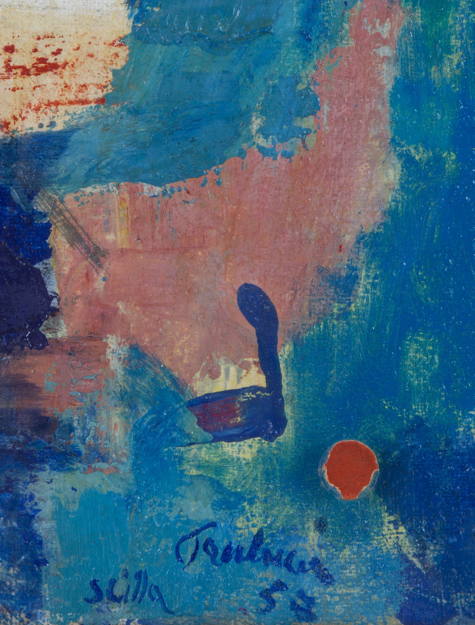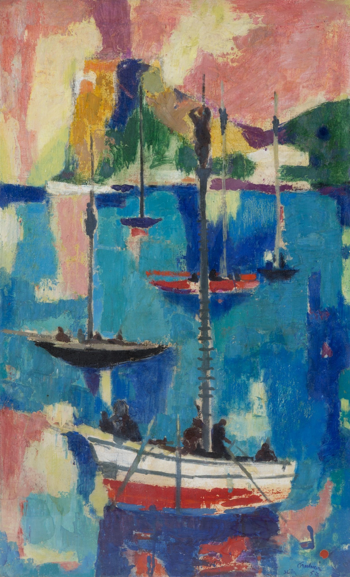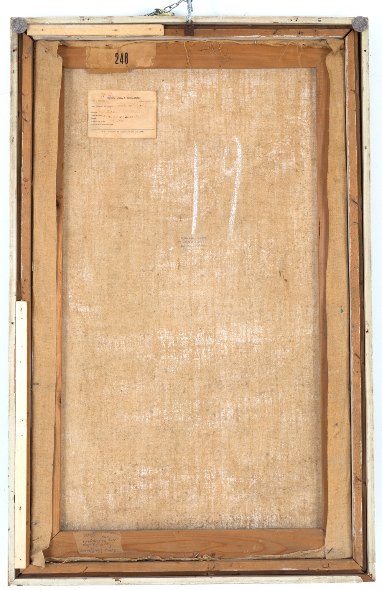 ENRICO PAOLUCCI (Genova 1901-Torino 1999). Oil painting on canvas entitled ''FISHING FOR SWORDFISH''. Signed and dated '57 lower right. Nino Cali collection. With Villa San Giovanni 1957 award cartouche on the back. In frame. 90x54cm approx. ENRICO PAOLUCCI (Genova 1901-Torino 1999). Dipinto olio su tela intitolato ''PESCA DEL PESCE SPADA''. Firmato e datato '57 in basso a destra. Collezione Nino Calì. Con cartiglio del premio Villa San Giovanni 1957 sul retro. In cornice. 90x54 cm ca.