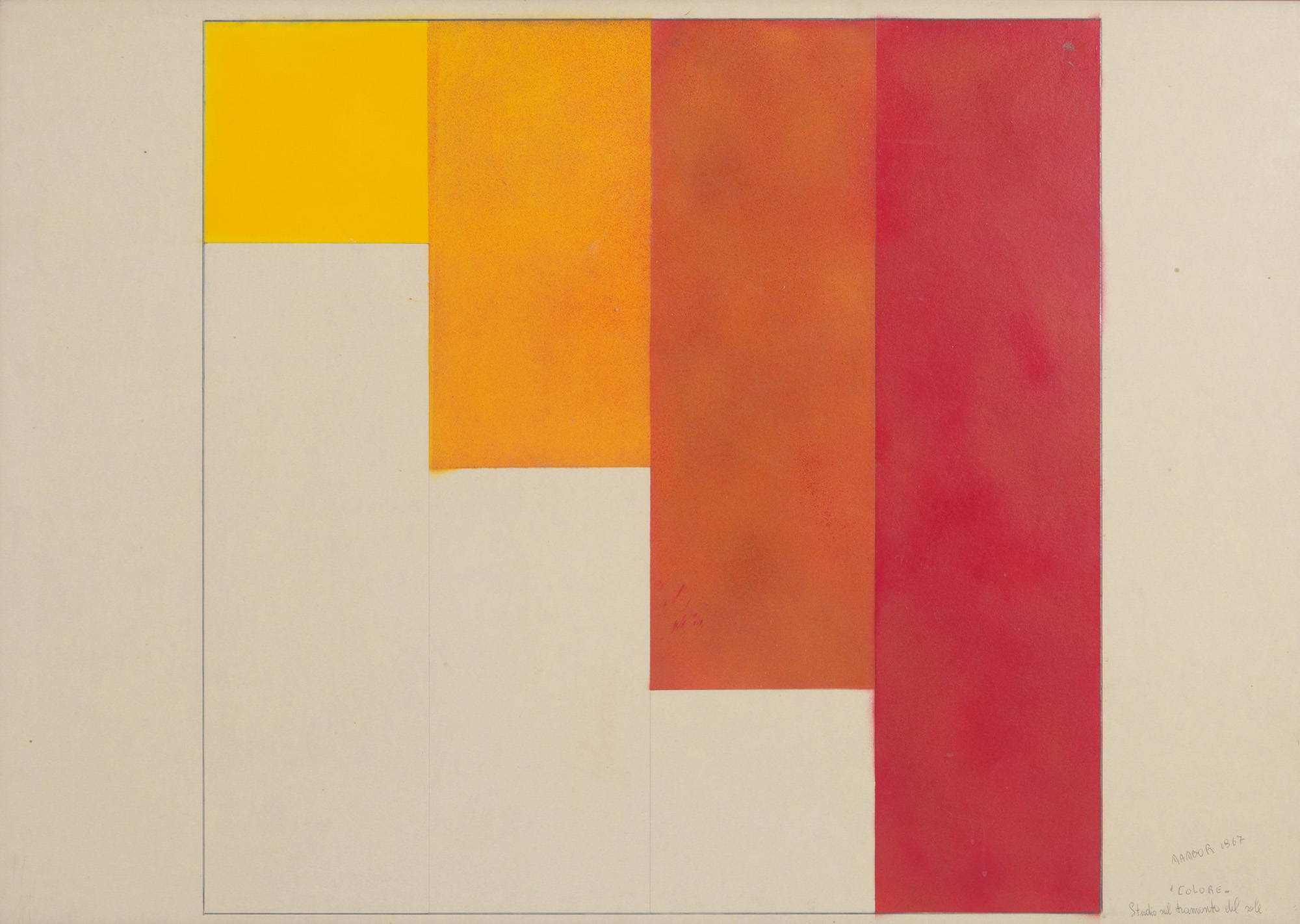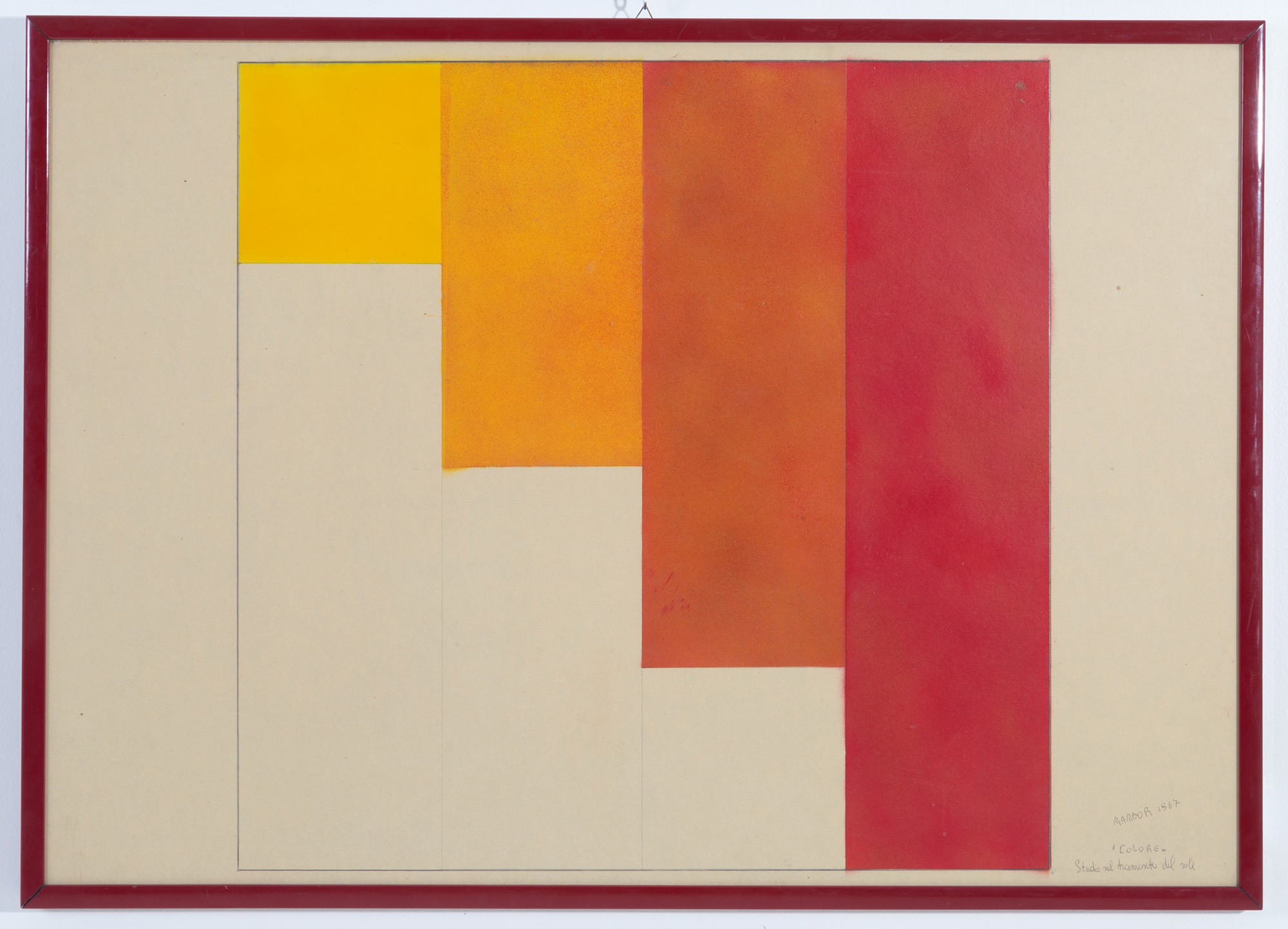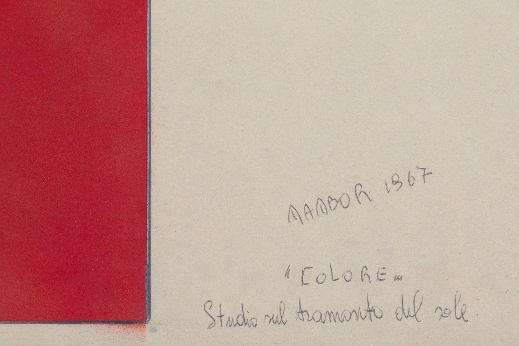RENATO MAMBOR (Roma 1936-2014). Acrylic painting on paper titled "COLOR STUDY ON THE SETTING OF THE SUN". Signed, titled and dated 1967 lower right. In frame. With authentication by the artist on photograph. 72x100cm approx. RENATO MAMBOR (Roma 1936-2014). Dipinto acrilico su carta intitolato "COLORE STUDIO SUL TRAMONTO DEL SOLE". Firmato, intitolato e datato 1967 in basso a destra. In cornice. Con autentica dell'artista su fotografia. 72x100 cm ca.
