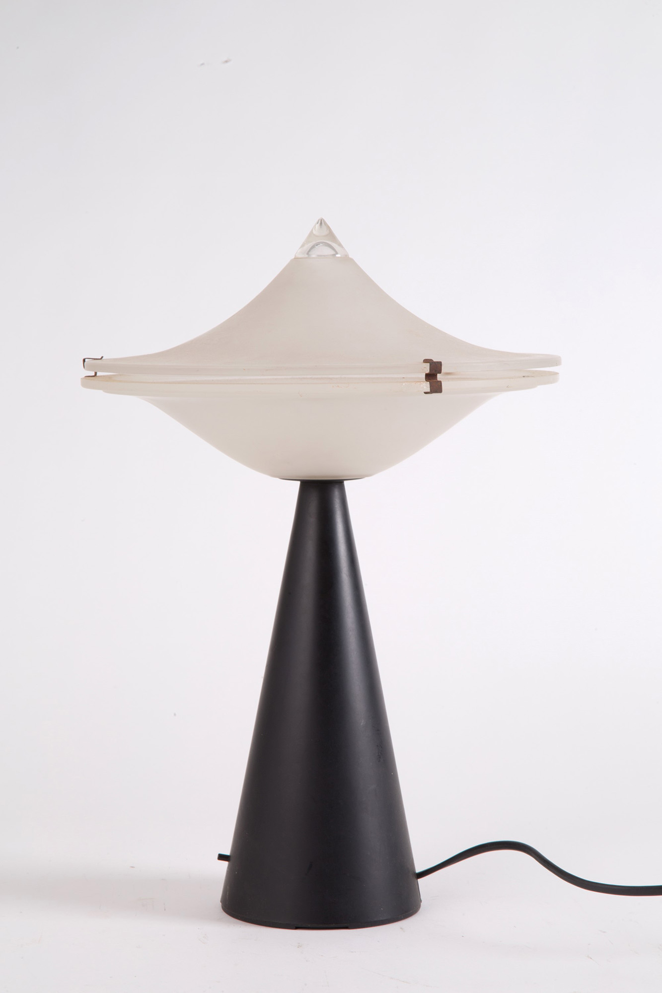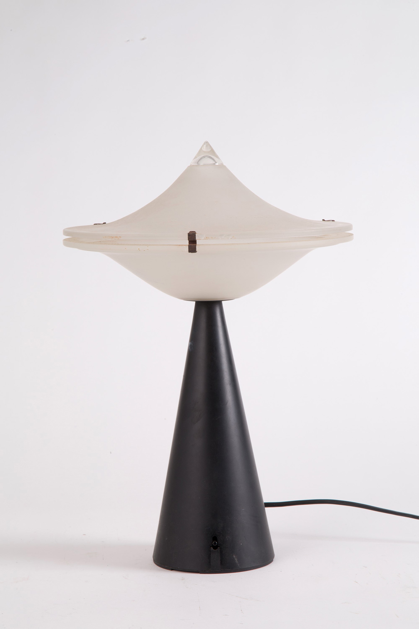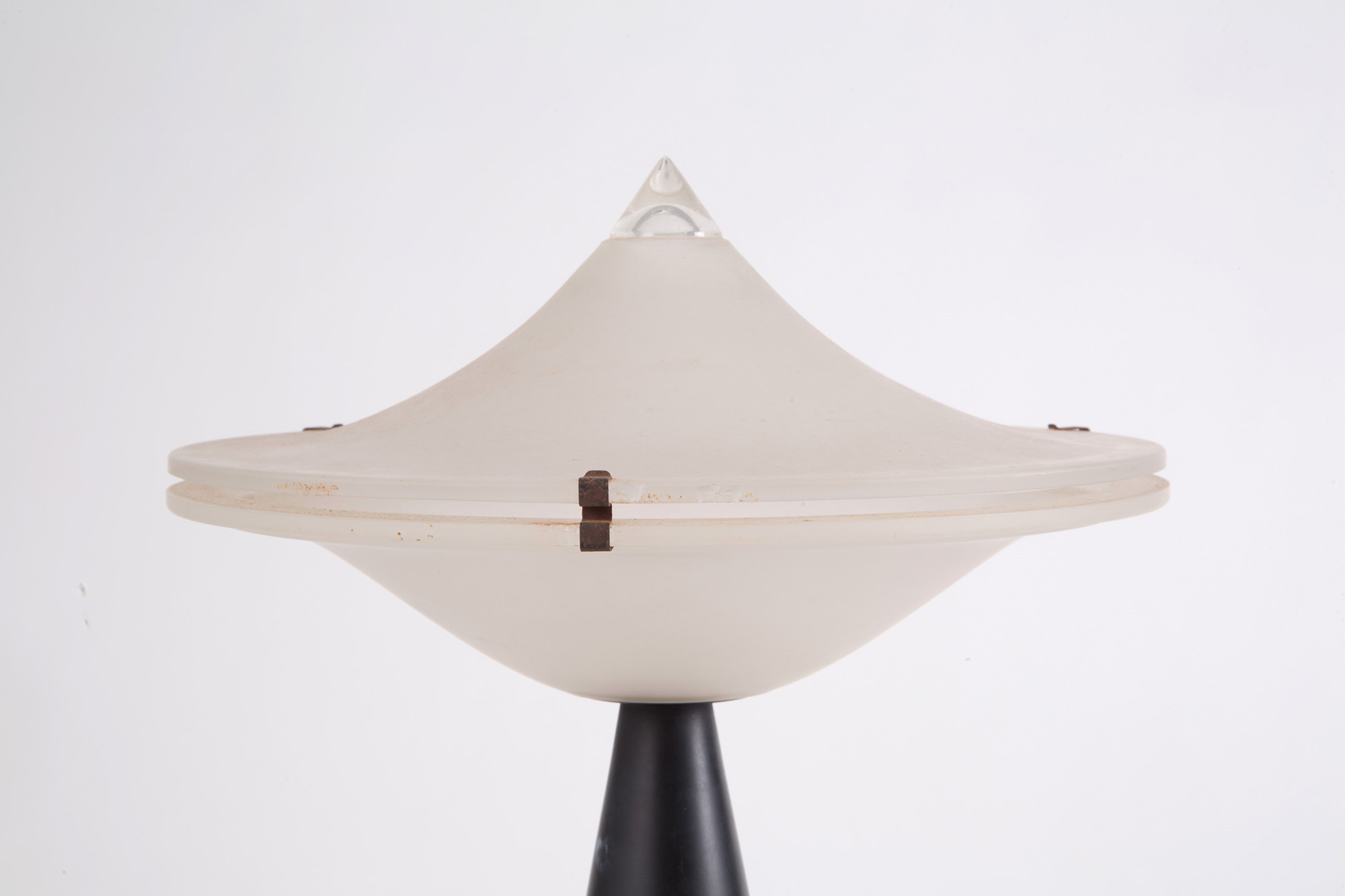 LUCIANO CESARO. Alien lamp with double hat in opal glass and maximum tip in transparent glass. Metal cone-shaped base. Production TRE CI LUCE. 70's. 40x27cm approx. LUCIANO CESARO. Lampada Alien con doppio cappello in vetro opalino e punta massima in vetro trasparente. Basamento a forma di cono in metallo. Produzione TRE CI LUCE. Anni '70. 40x27 cm ca.