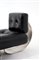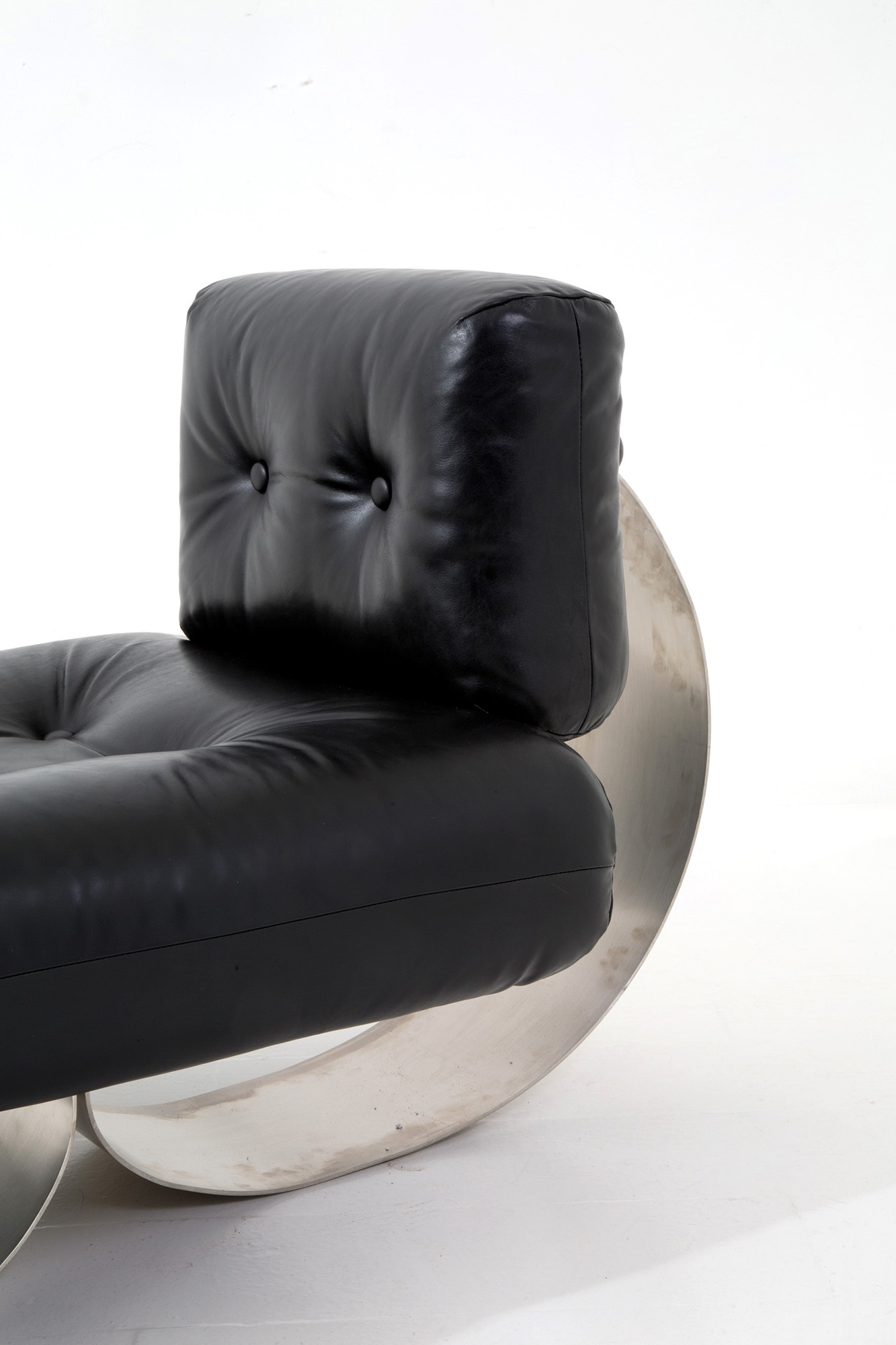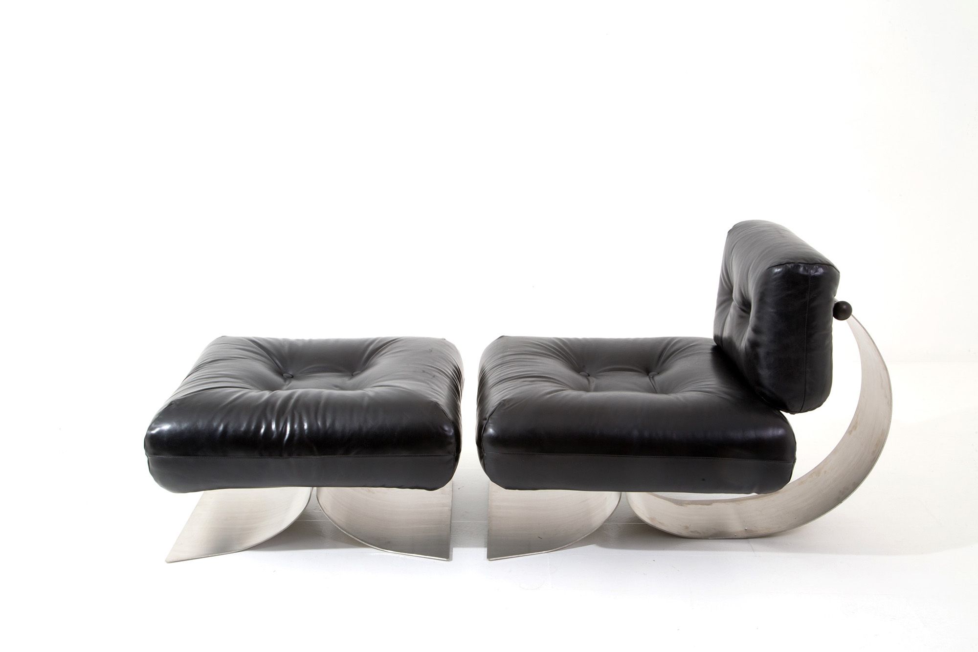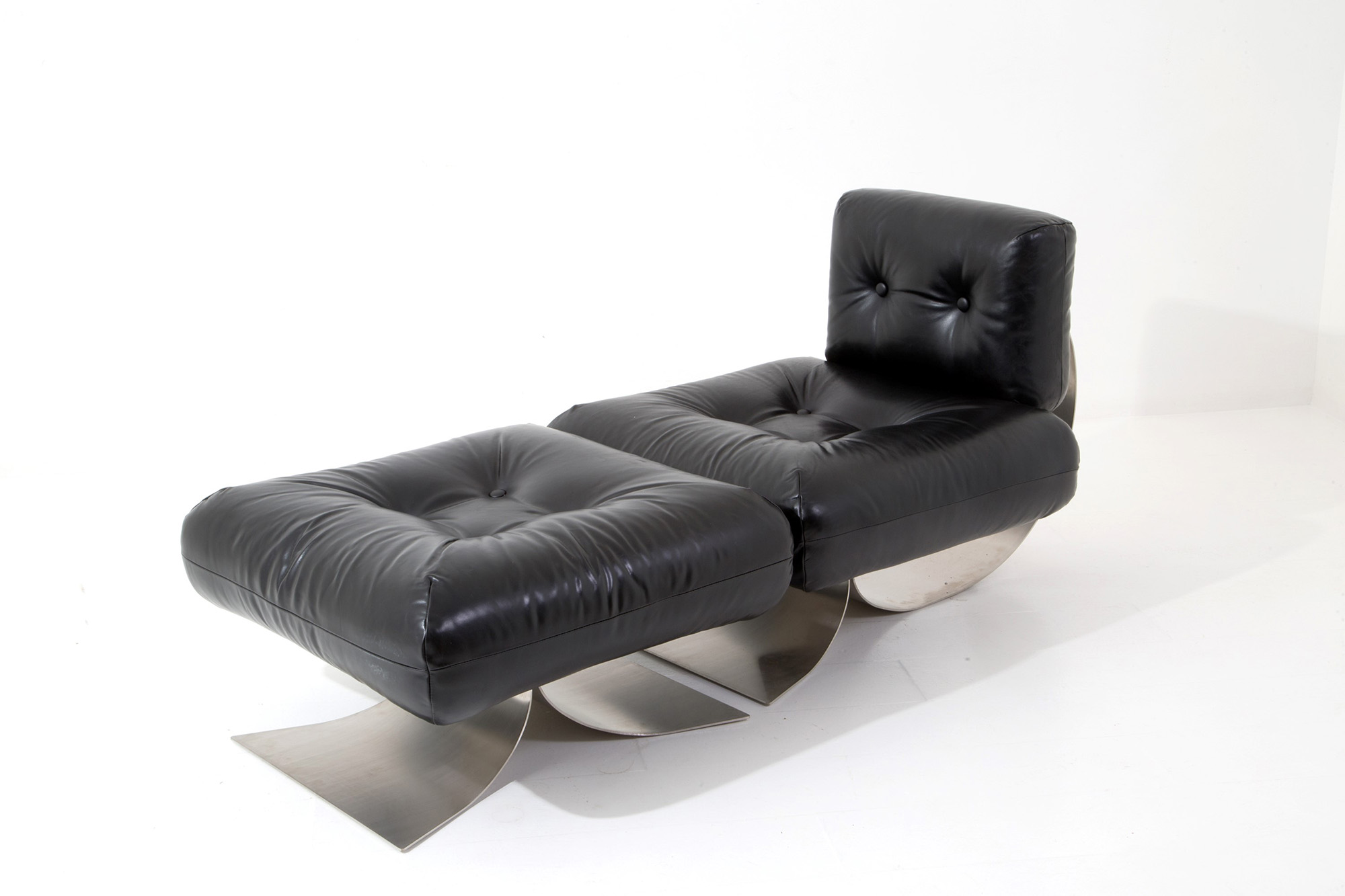OSCAR NIEMEYER (Rio de Janeiro 1907-2012). Armchair with pouf in chromed steel, knobs in plastic and covering in black leather. MOBILIER INTERNATIONAL production. With manufacturer's label. 1970s.