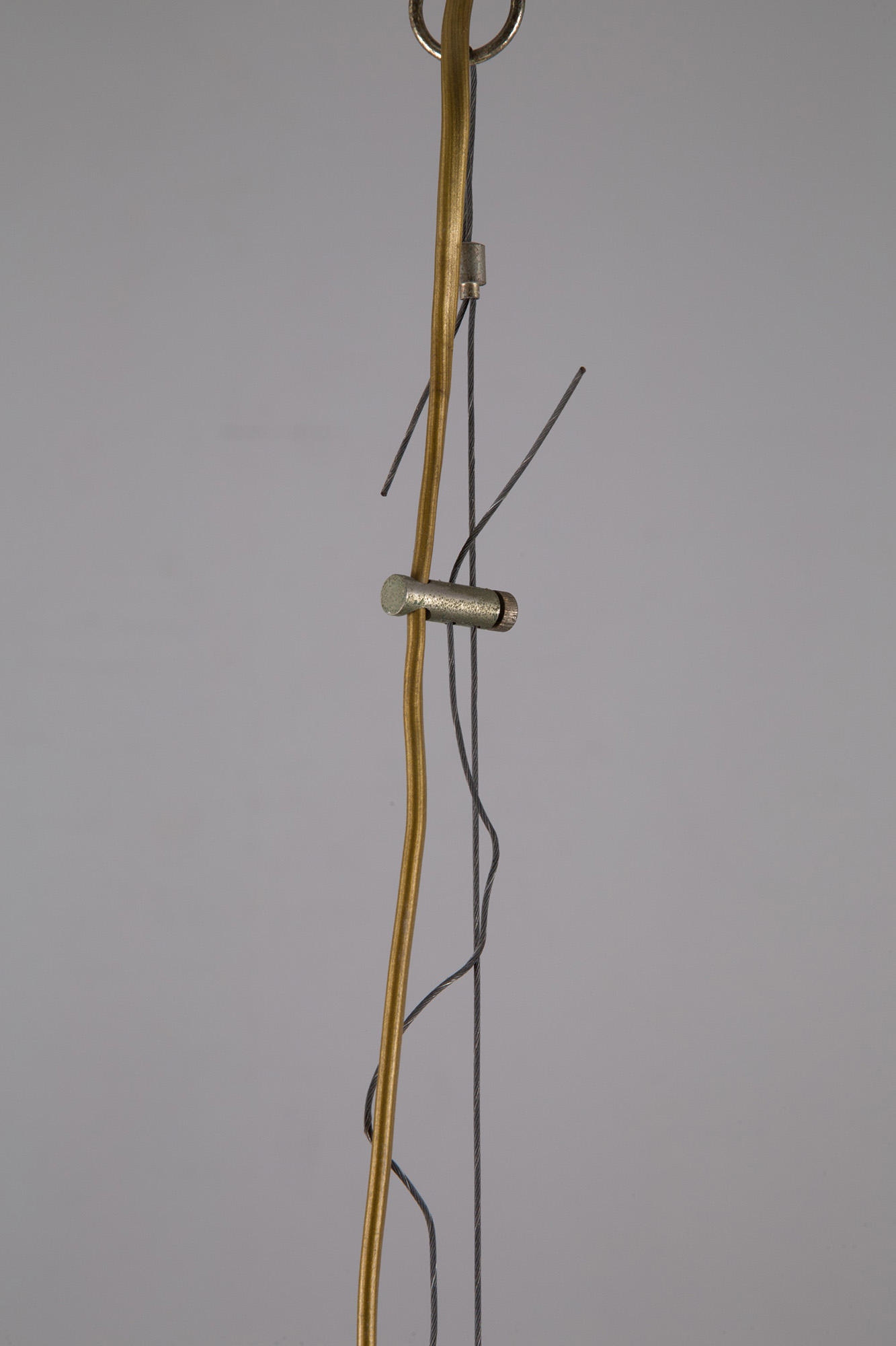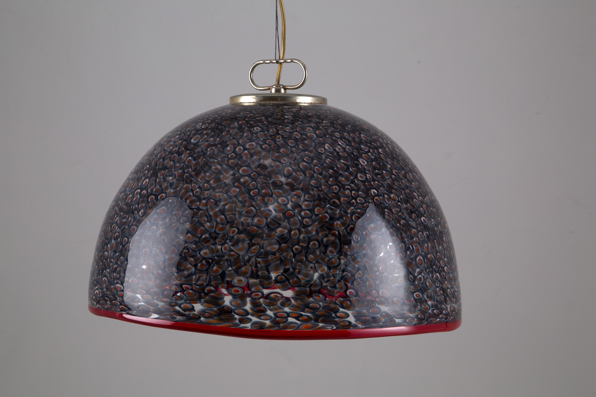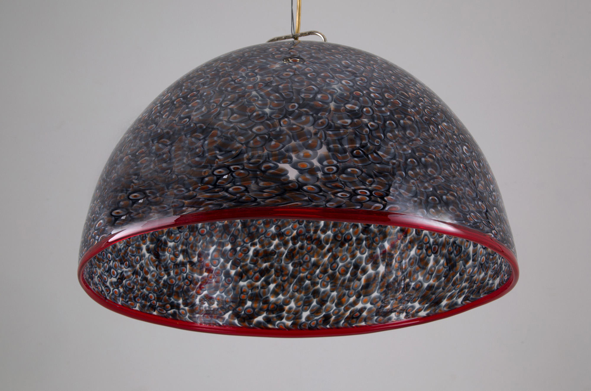GAE AULENTI (Palazzolo dello Stella 1927-Mialno 2012). Murrina glass and brass chandelier. LEUCOS production. 70's. Slight signs of wear on the chrome. 90x50cm approx. GAE AULENTI (Palazzolo dello Stella 1927-Mialno 2012). Lampadario in vetro murrina e ottone. Produzione LEUCOS. Anni '70. Lievi segni di usura sulle cromature. 90x50 cm ca.